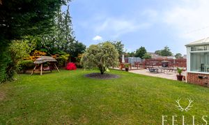 Outside, the property continues to impress. The sweeping driveway provides ample space for multiple vehicles, a caravan or boat, and leads to a detached double garage and additional aluminium store. The garden is beautifully private, enclosed by mature hedging and established planting. There are several distinct seating areas, including a large patio and raised decking, creating a wonderful setting for entertaining or quiet relaxation.