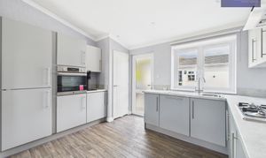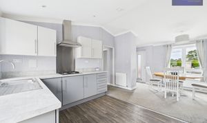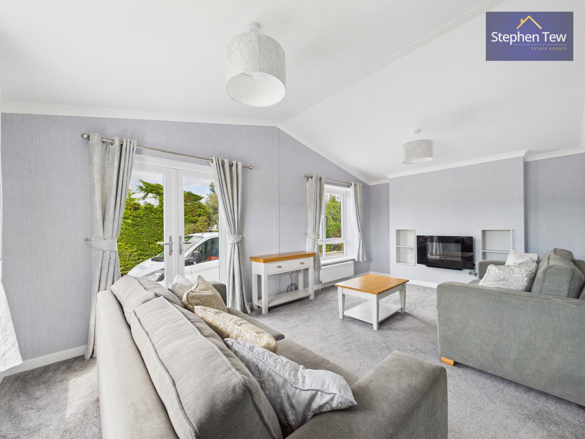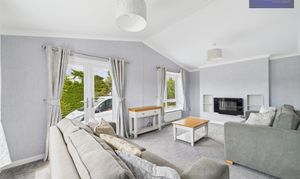 This beautifully presented detached park home offers a blend of contemporary style and practical living across two spacious bedrooms, two modern bathrooms, and two inviting reception rooms. The property boasts a striking modern exterior with a sleek finish, brick detailing, and low-maintenance landscaping, complemented by a generous paved driveway providing ample off-road parking. The open plan living area creates a light and airy atmosphere, enhanced by plush carpeting, built-in shelving, and a modern electric fireplace for a cosy yet sophisticated feel. French doors seamlessly connect the main living space to the outdoors, inviting natural light and enabling effortless indoor-outdoor living.