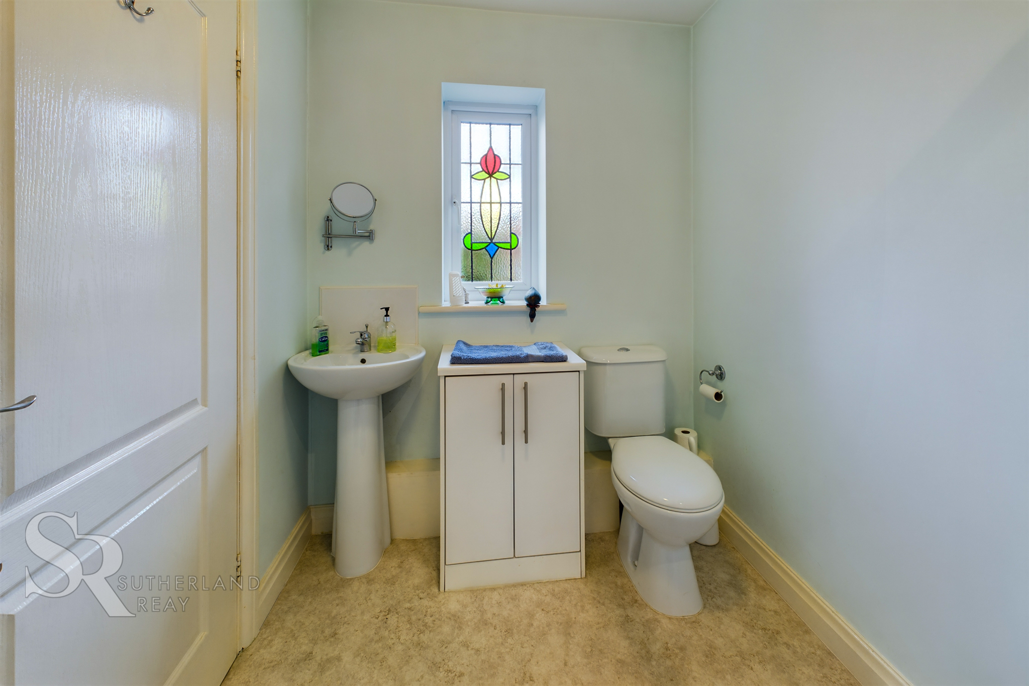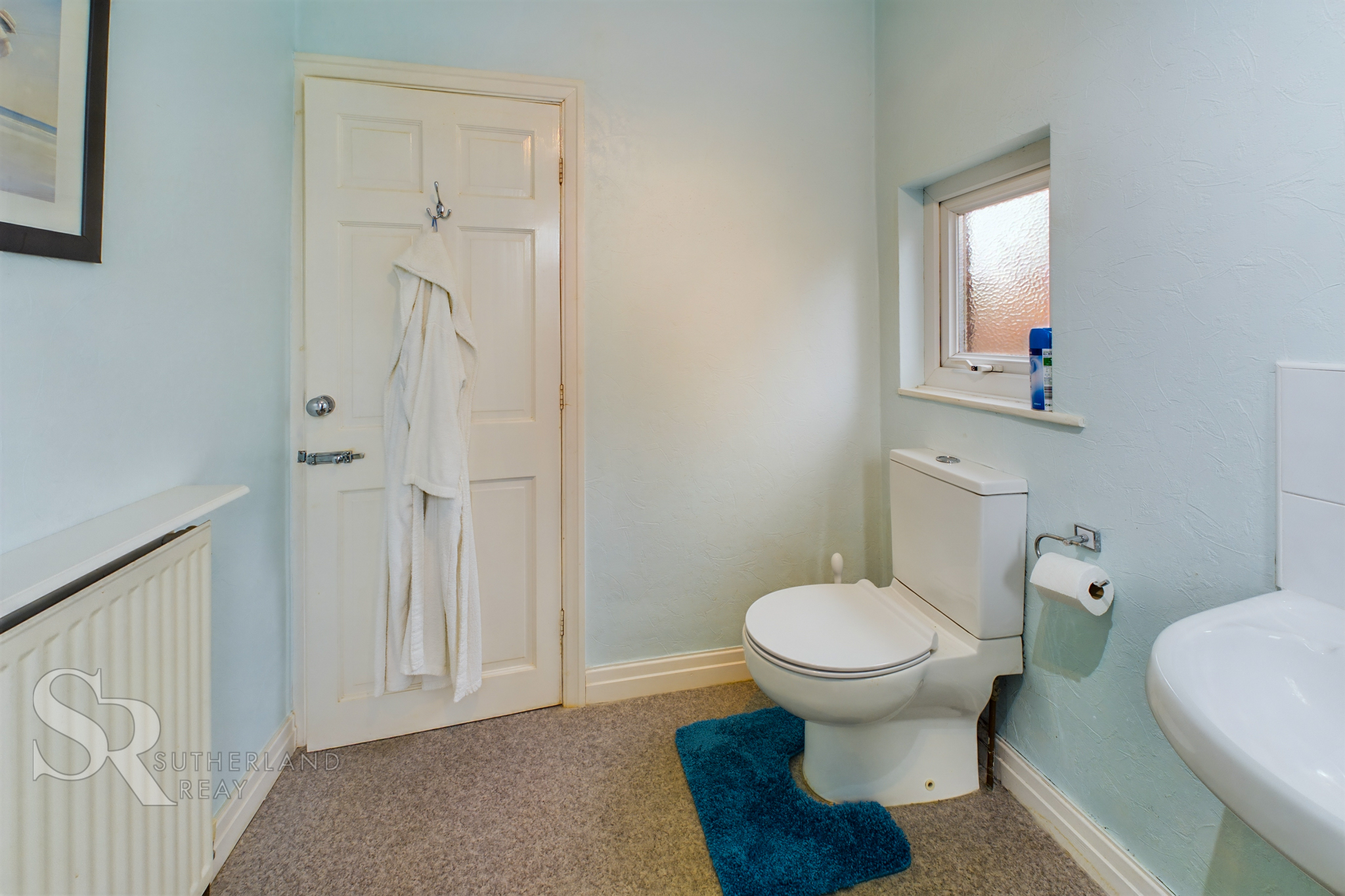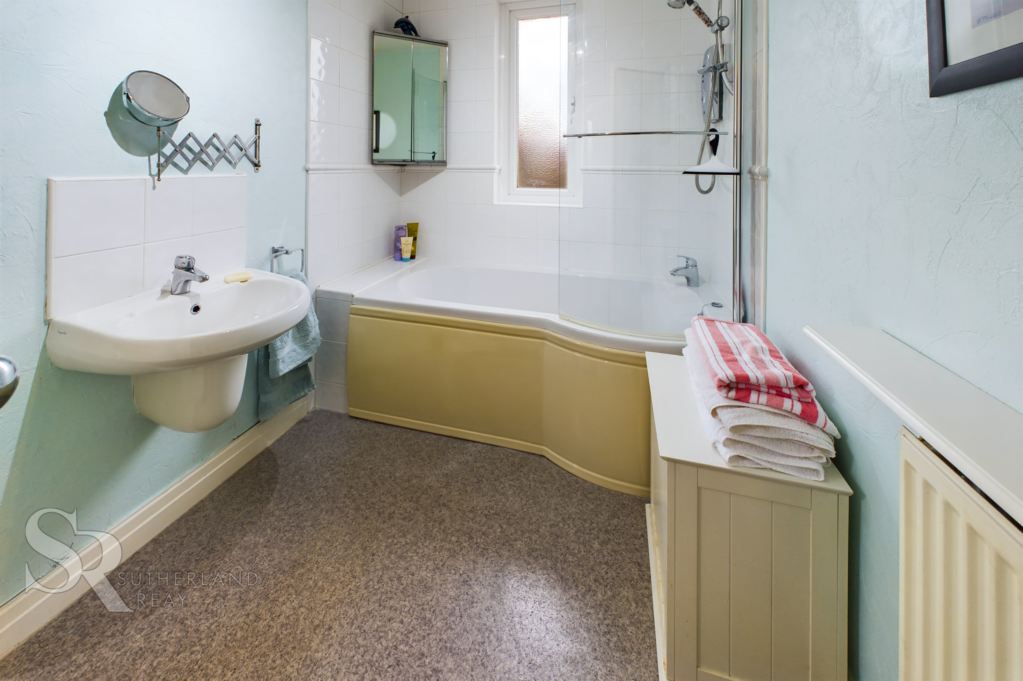 Double glazed uPVC windows with privacy glass to the rear and side elevations, white P shaped bath panelled bath with electric shower over, wall mounted sink with contemporary chrome mixer tap over, low level push flush WC, part tiled walls, radiator, grey linoleum floor.