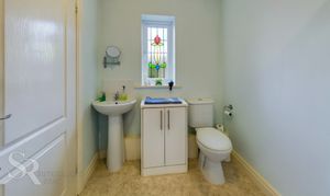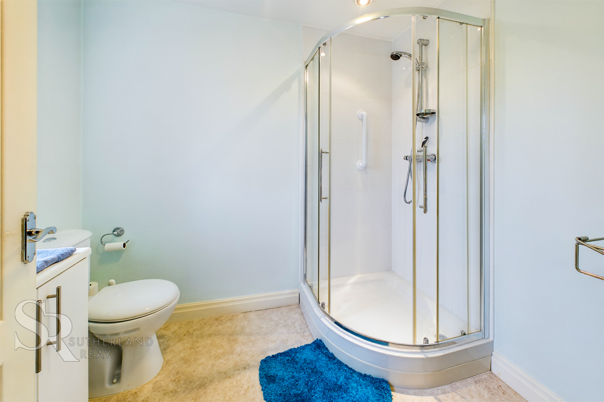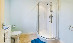 Double glazed uPVC stained glass window to the side elevation, walk in corner shower cubicle with mixer shower over, low level push flush WC, pedestal sink with contemporary chrome mixer tap over, fitted vanity unit, radiator, extractor fan and linoleum flooring.