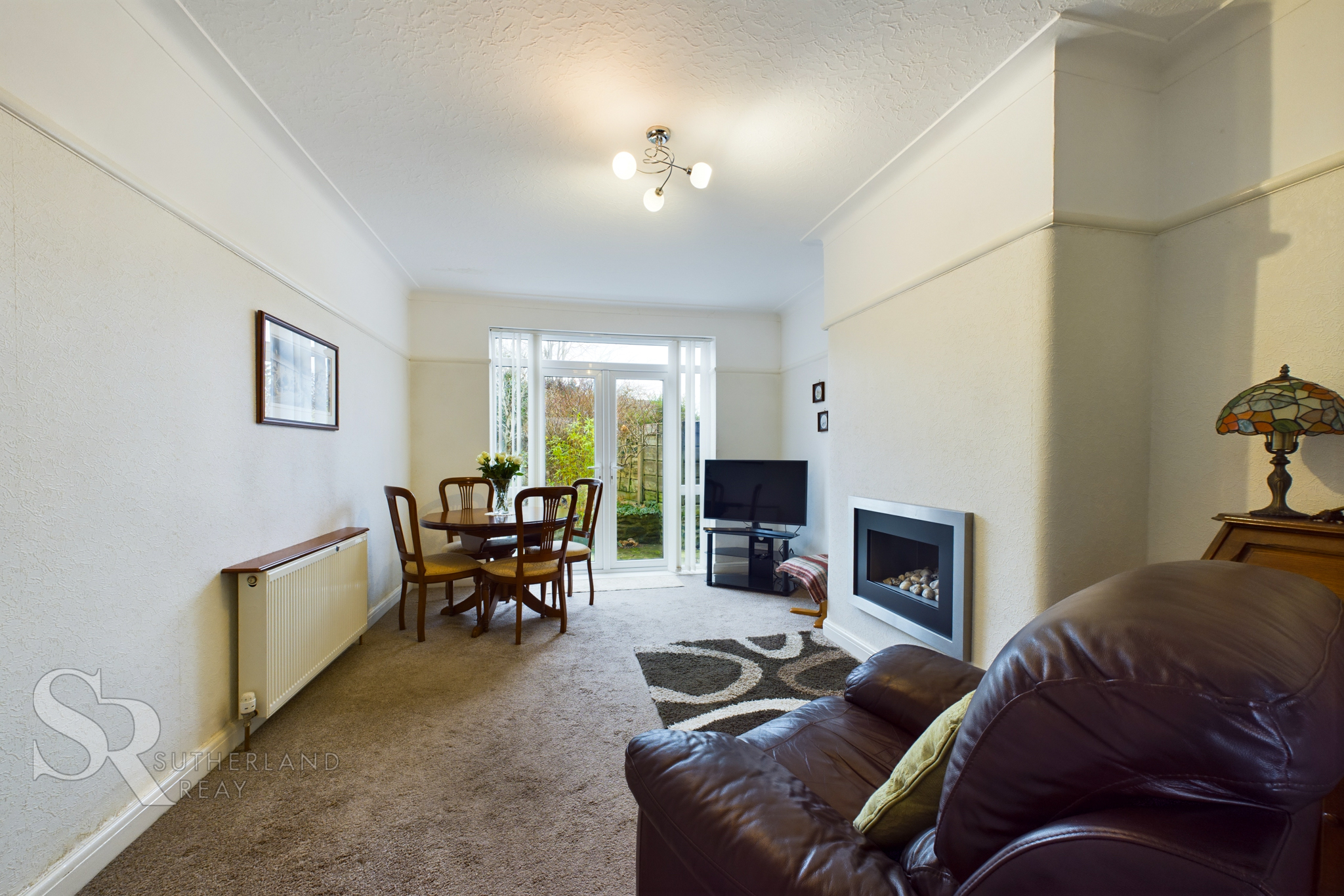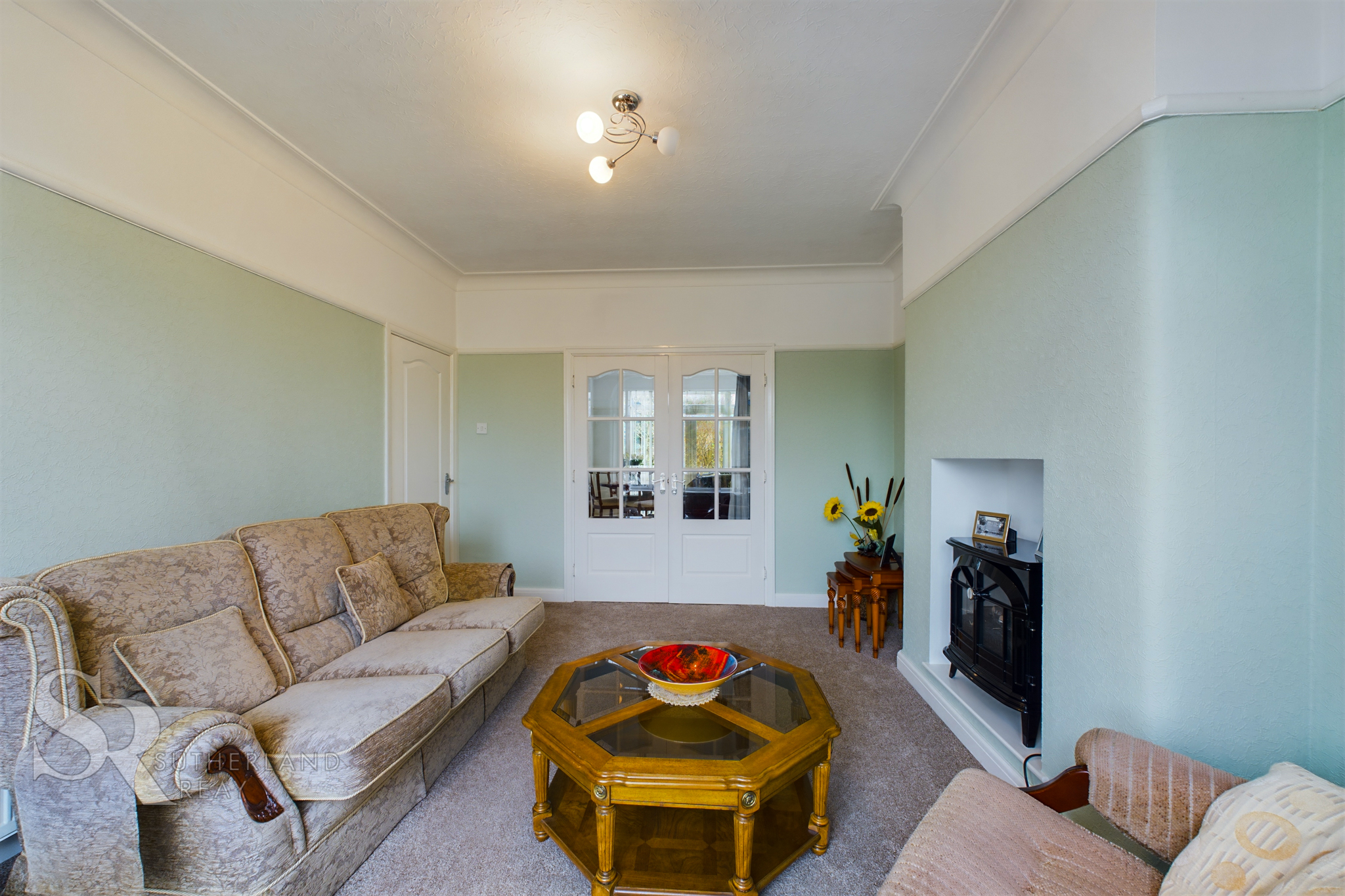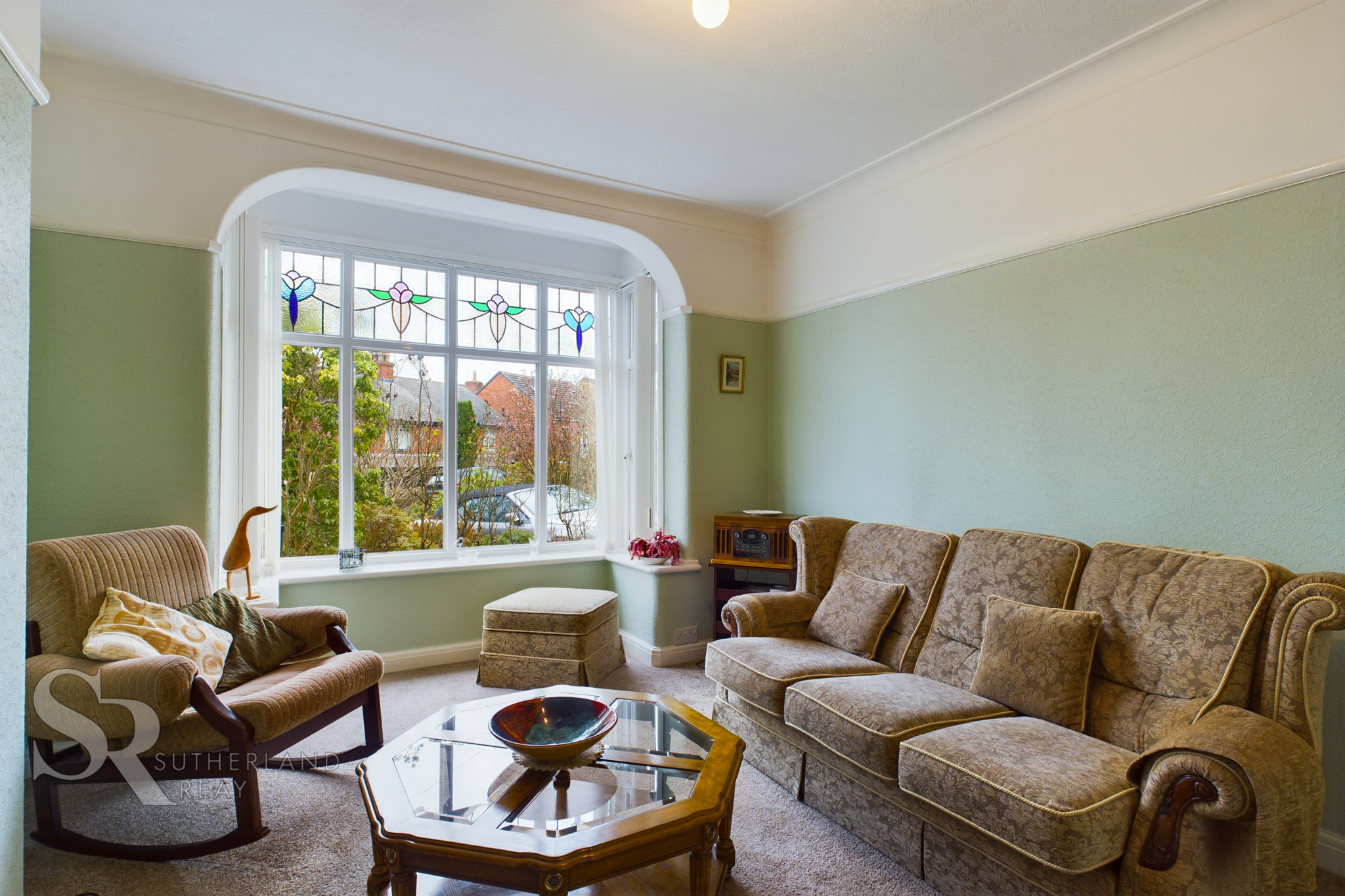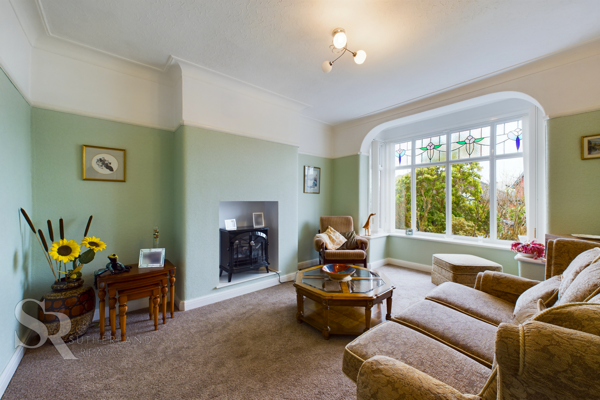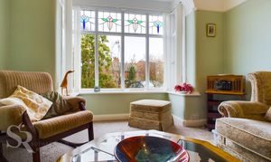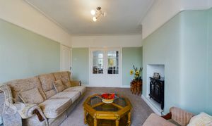 Large double glazed uPVC bay window with original stained glass to the front elevation, fireplace currently fitted with electric wood burner, picture rail, coving, carpeted floor, radiator, double doors leading through to dining room.