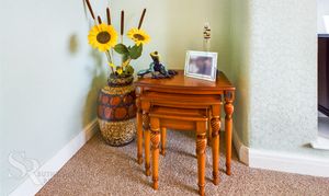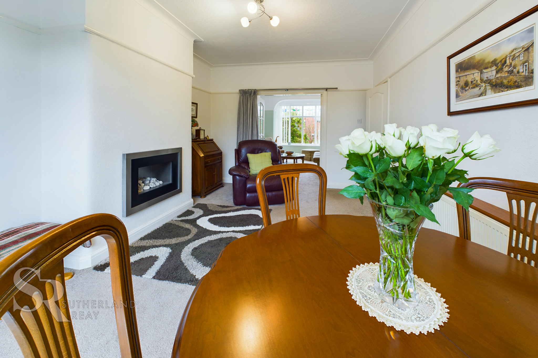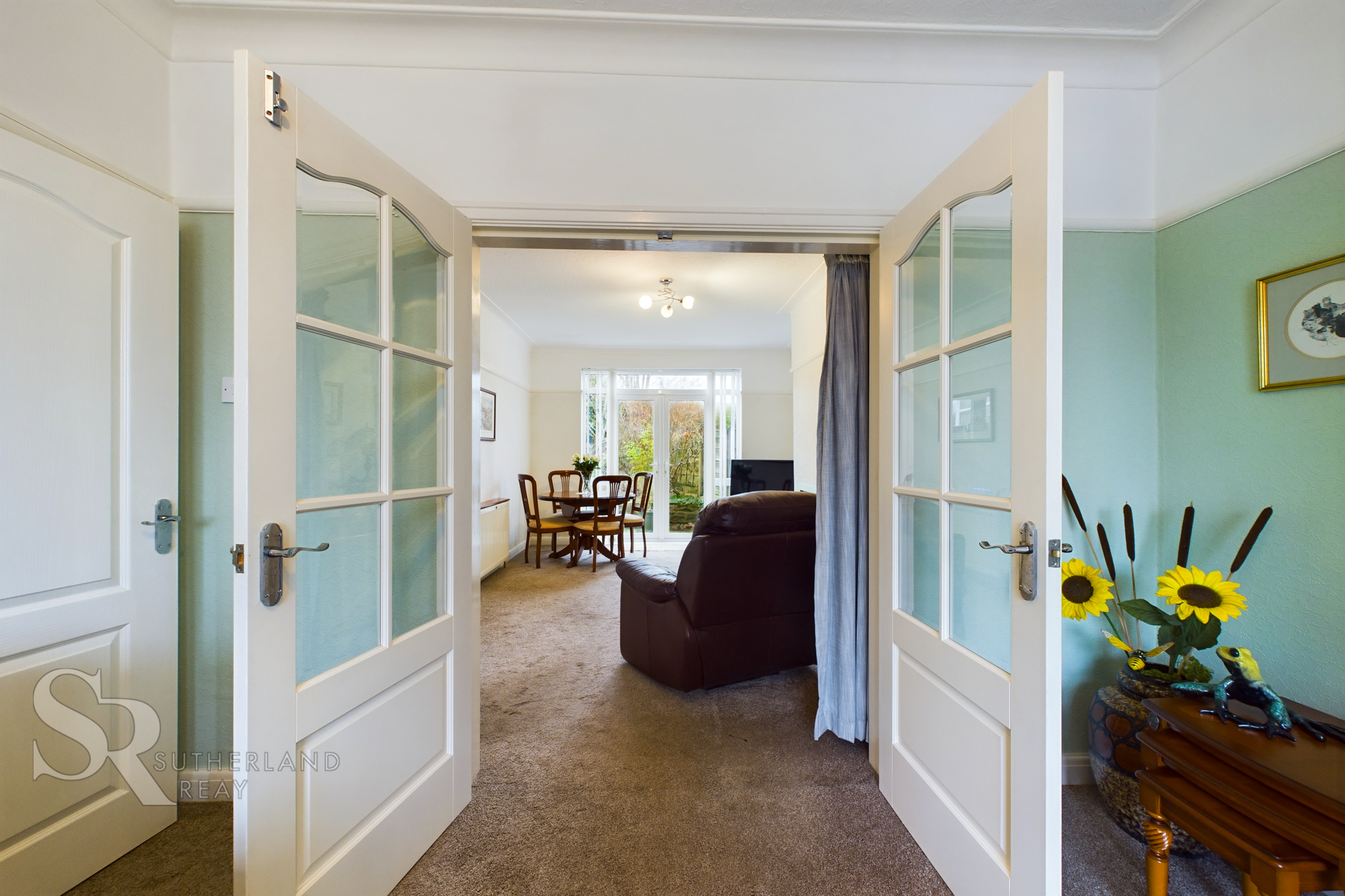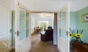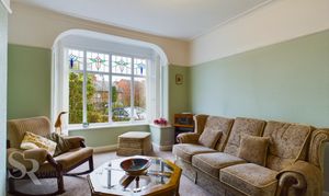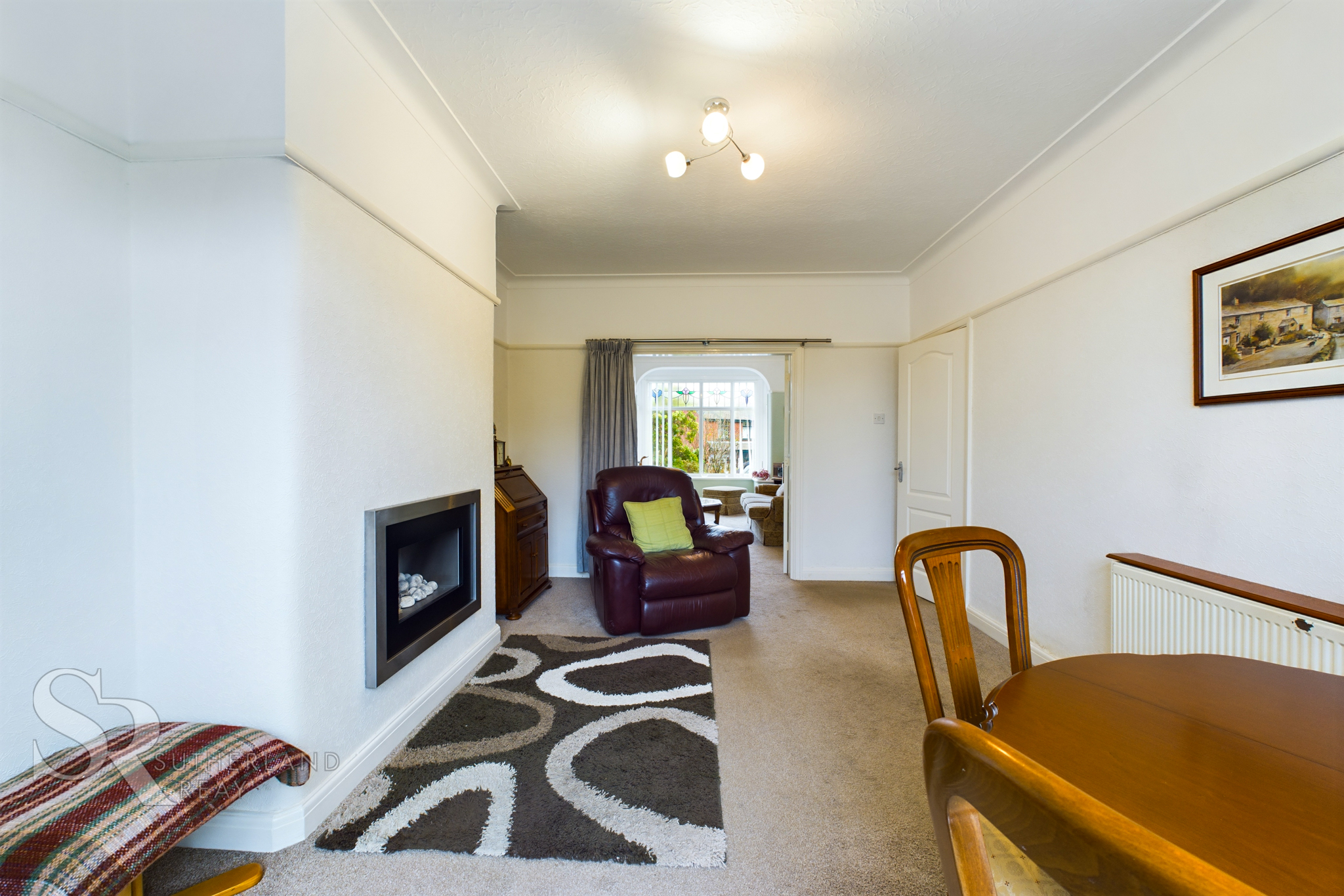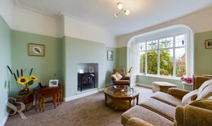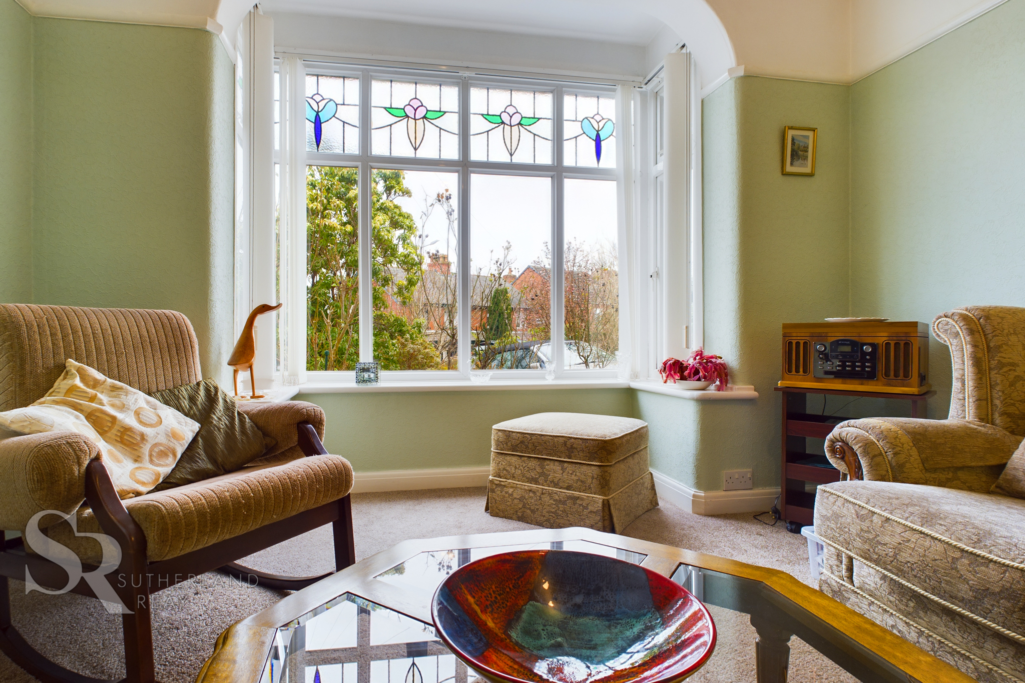 Large double glazed uPVC bay window with original stained glass to the front elevation, fireplace currently fitted with electric wood burner, picture rail, coving, carpeted floor, radiator, double doors leading through to dining room.
