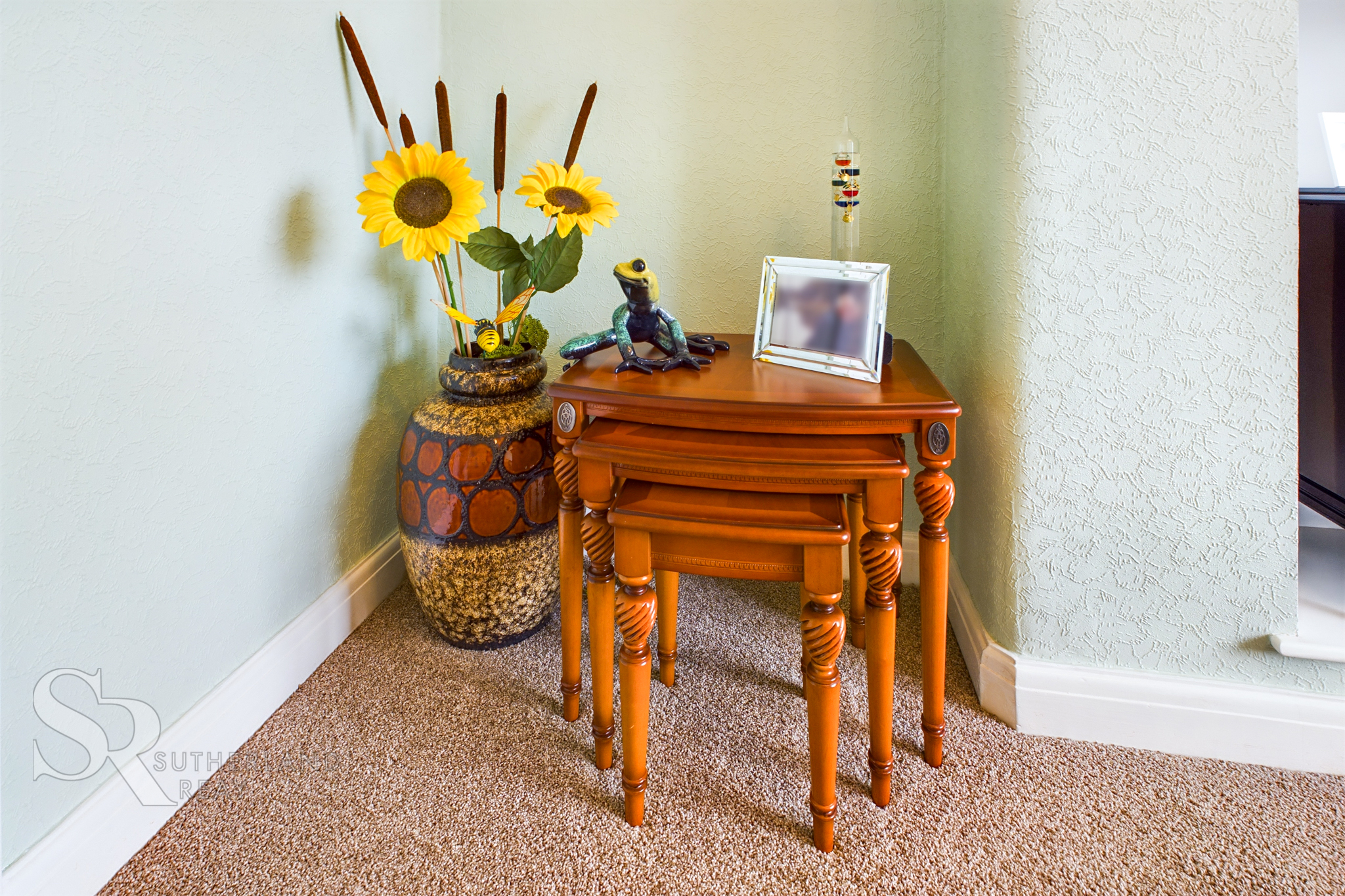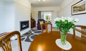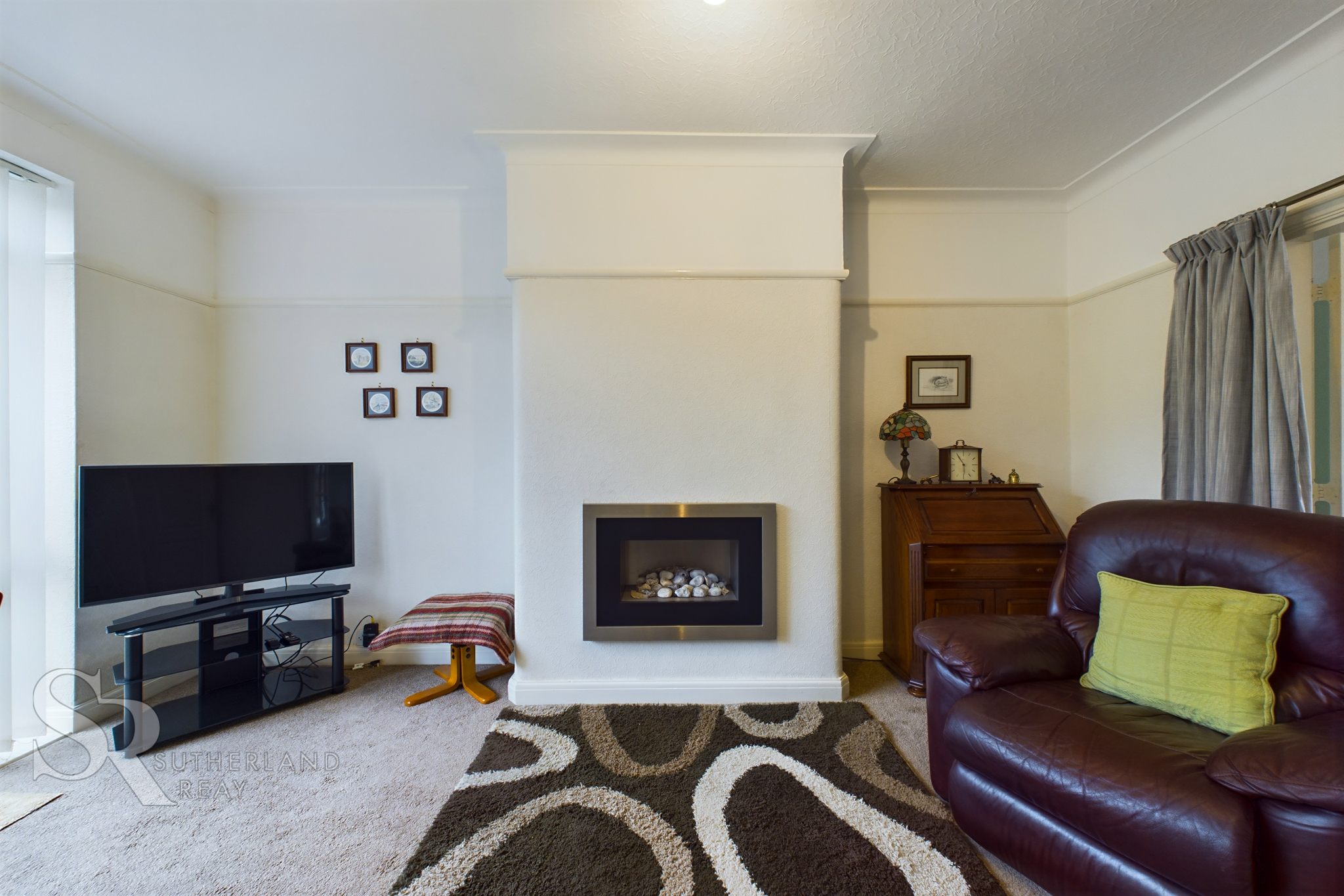 Double glazed uPVC French doors leading to the rear patio area, fitted hot stone built in gas fireplace, radiator, picture rail, carpeted floor, door leading into kitchen.