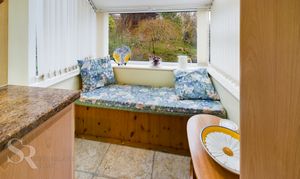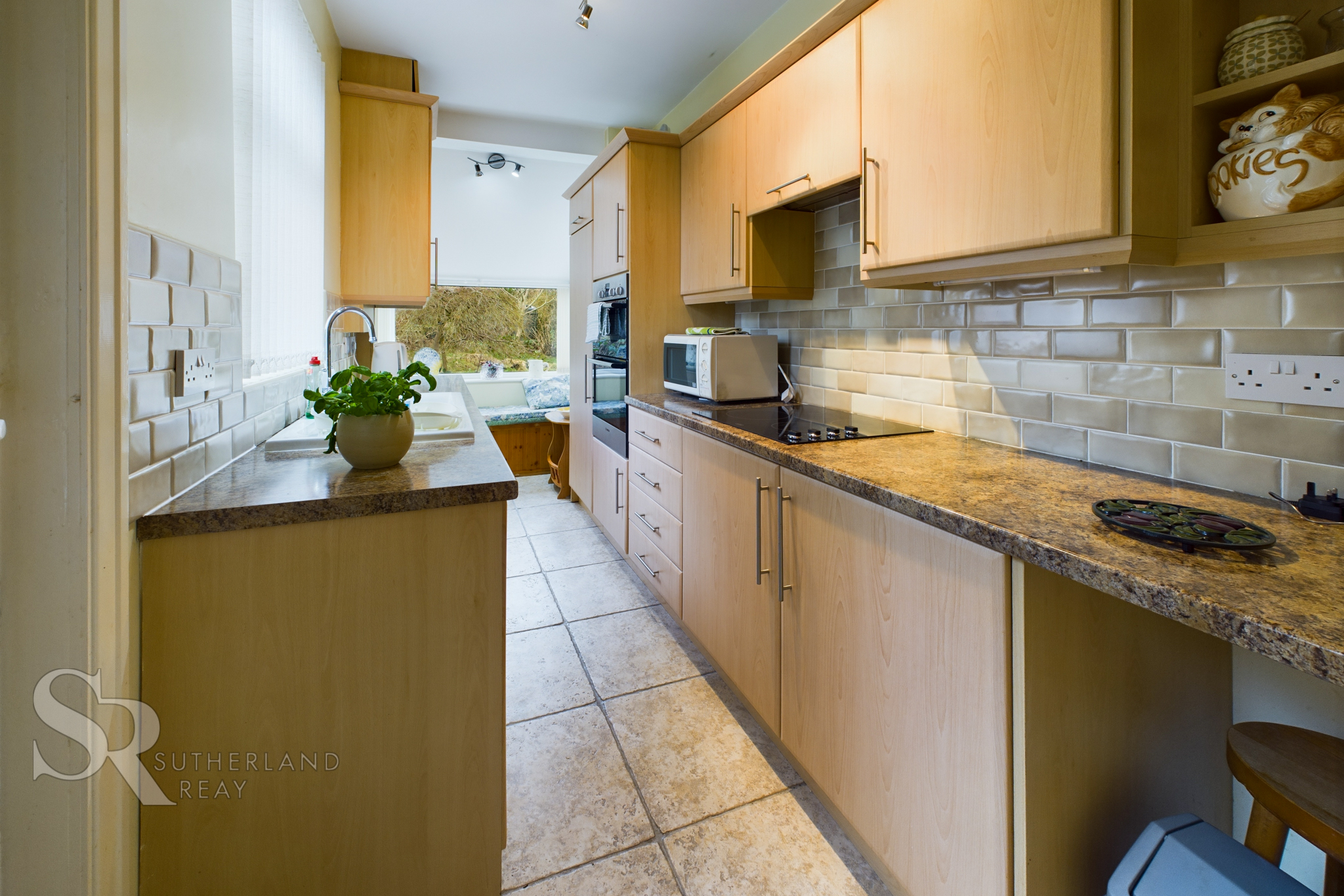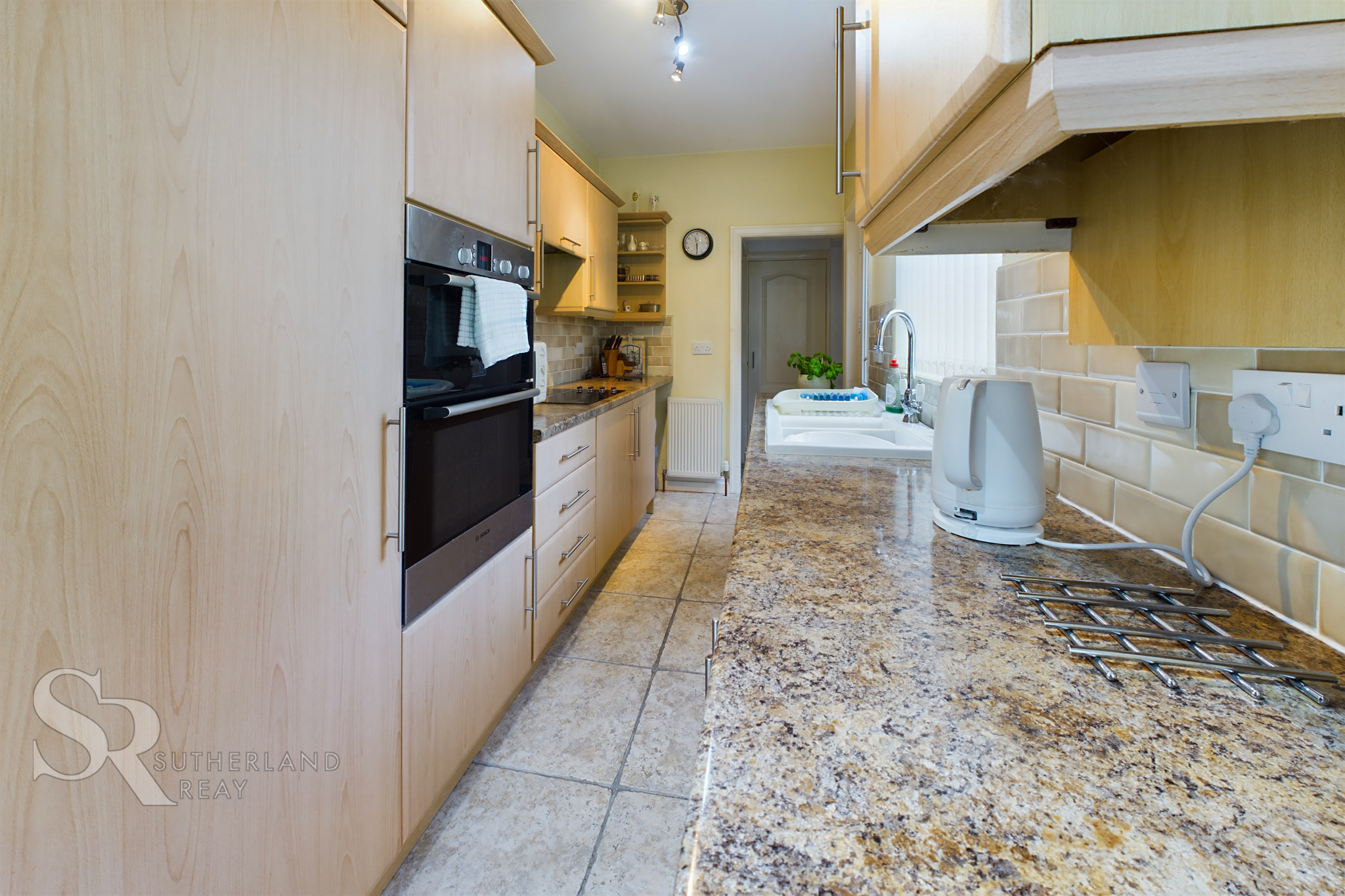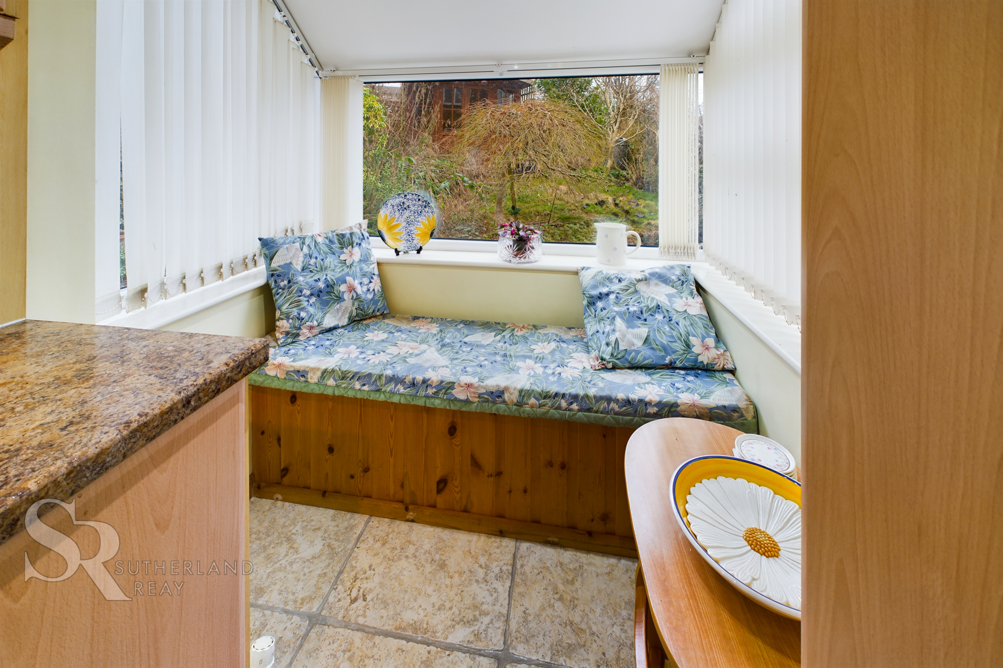 Double glazed uPVC door to the side elevation, matching beech wall and base units with brown marble effect worktops, Metro tiled splashbacks, white porcelain sink with chrome mixer tap over, integral electric oven and grill, electric hob with extractor over. Snug area with bonket seating and 180 degree double glazed uPVC windows, access to under stairs storage cupboard, radiator, tiled floor.