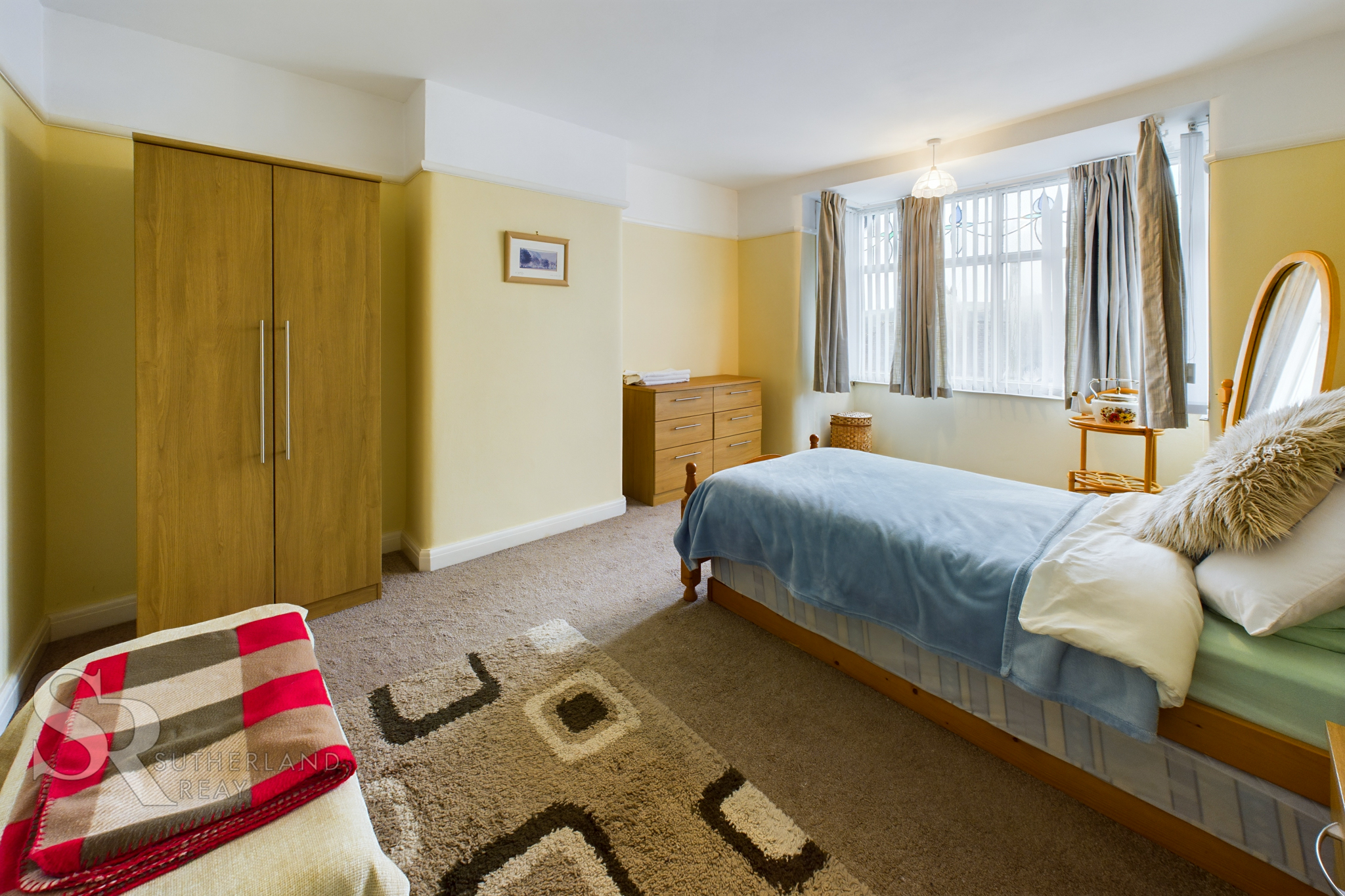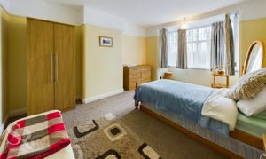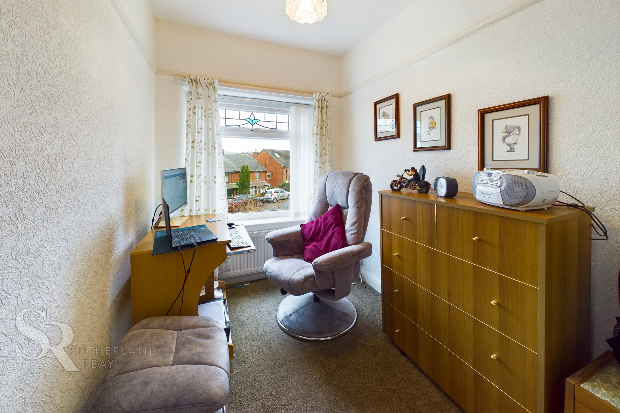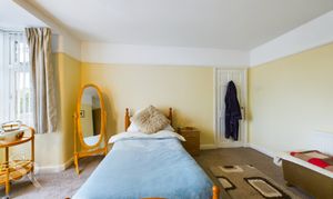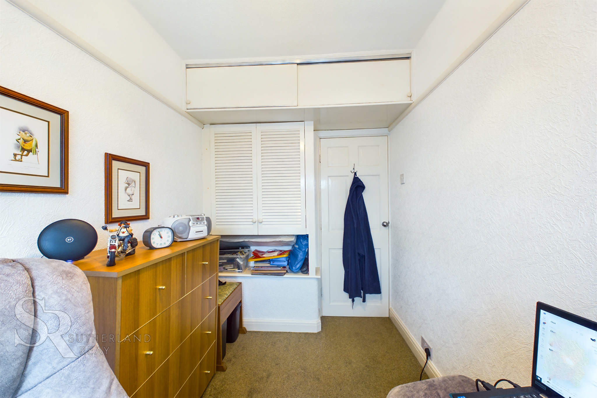 Double glazed uPVC window with original stained glass to the front elevation, built in cupboard, picture rail, carpeted floor, radiator.