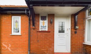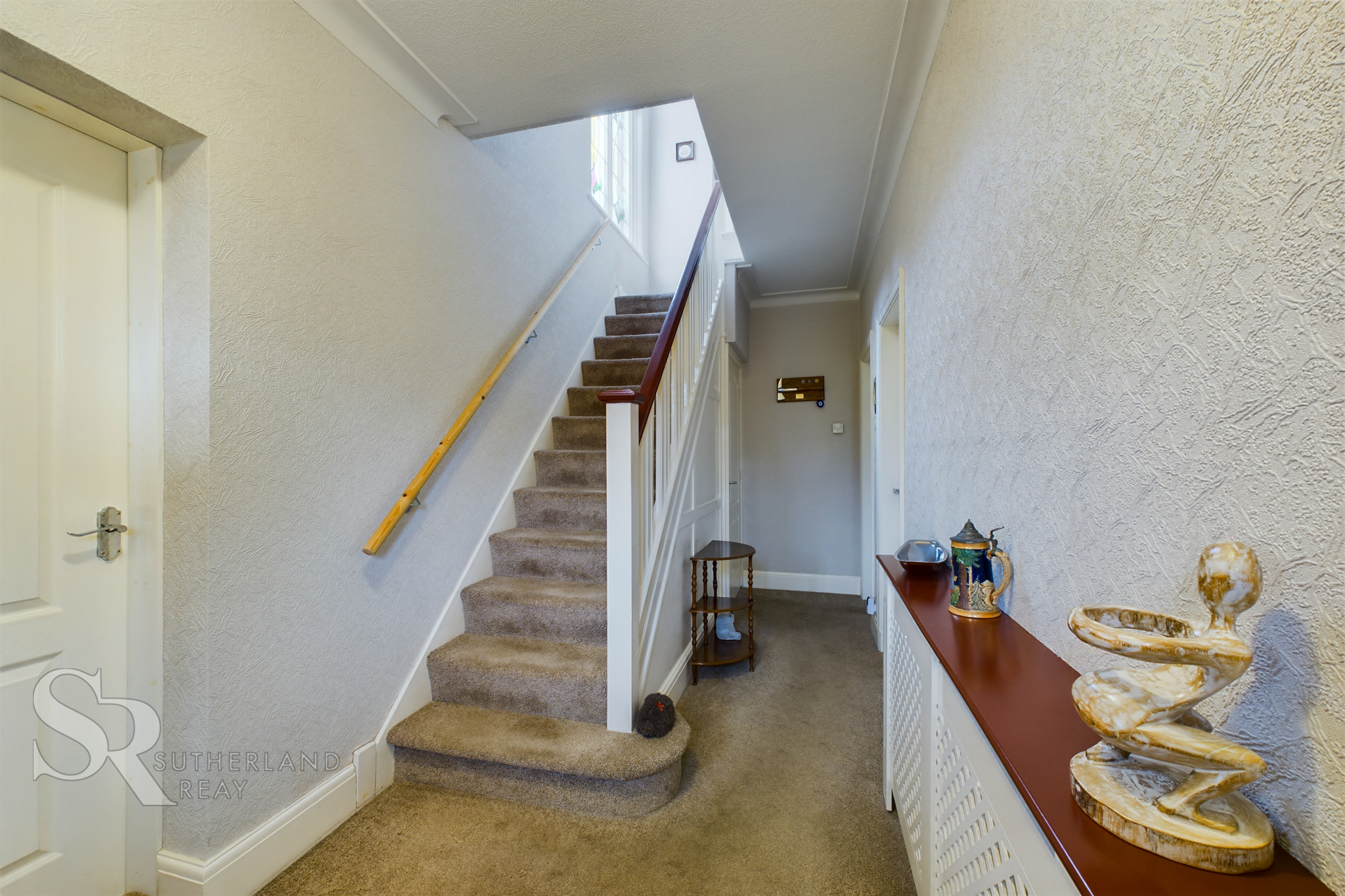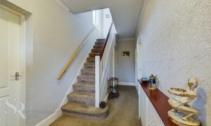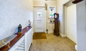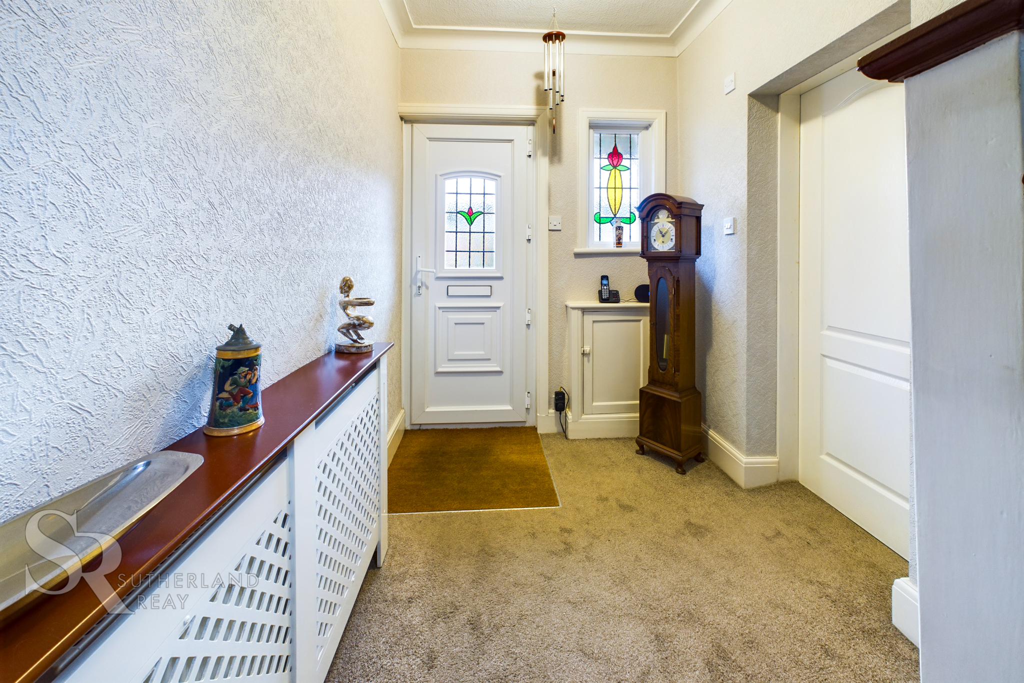 Double glazed Upvc door with stained glass panel and double glazed stained glass window to the front elevation, wide hallway with staircase with balustrade to first floor, carpeted floor, coving , radiator.