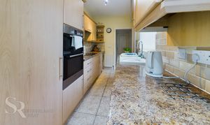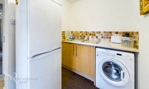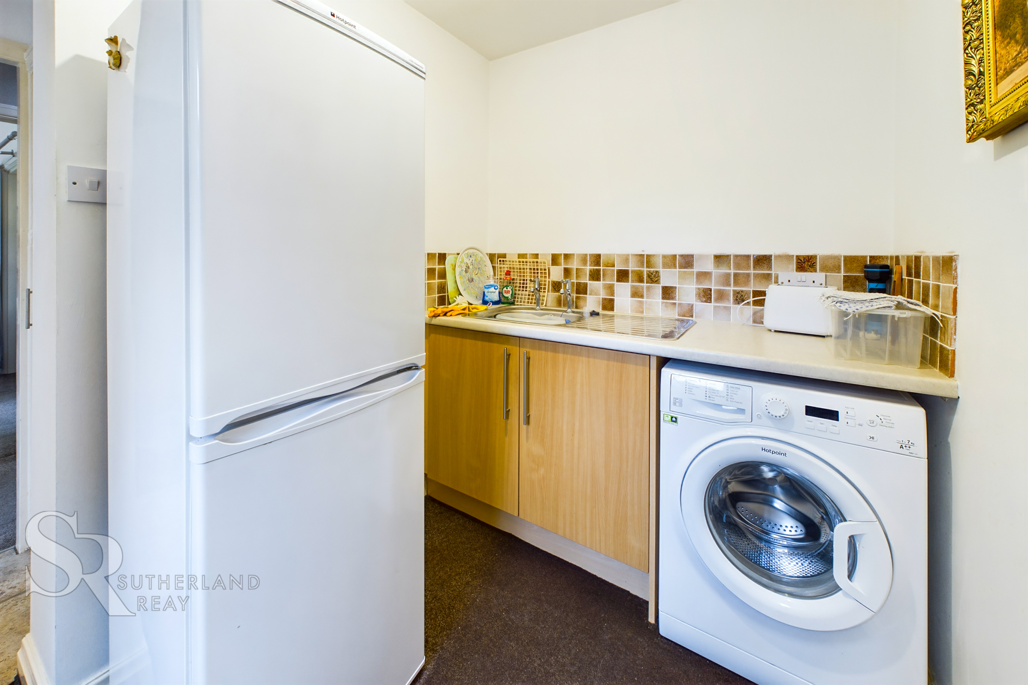Double glazed uPVC window to rear elevation, Beech effect base unit with stainless steel sink with chrome taps over, tiled splashback, space for a washing machine, radiator, tiled floor. Door giving access to the garage.