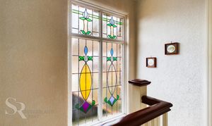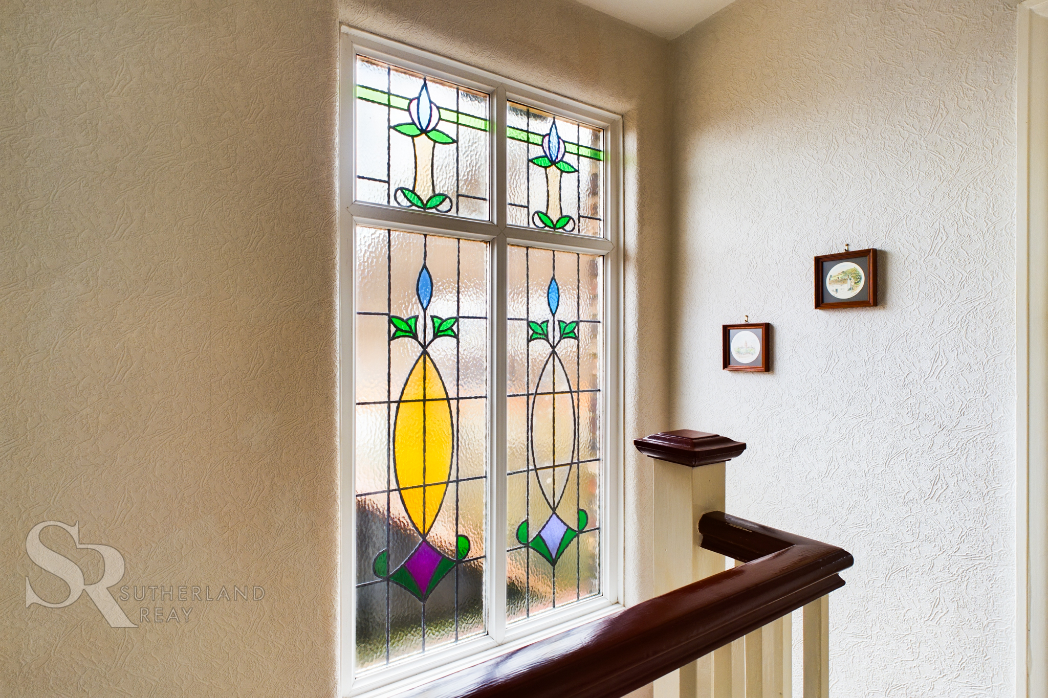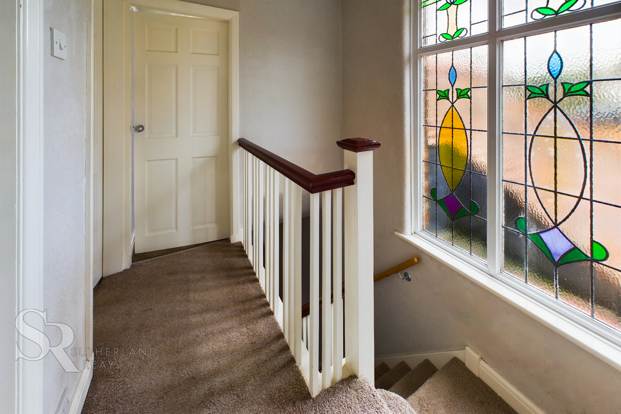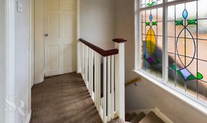 Double glazed uPVC window with original stained glass to the side elevation, spindled balustrade, carpeted floor, loft access leading to a boarded loft with lighting.