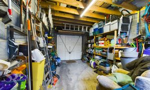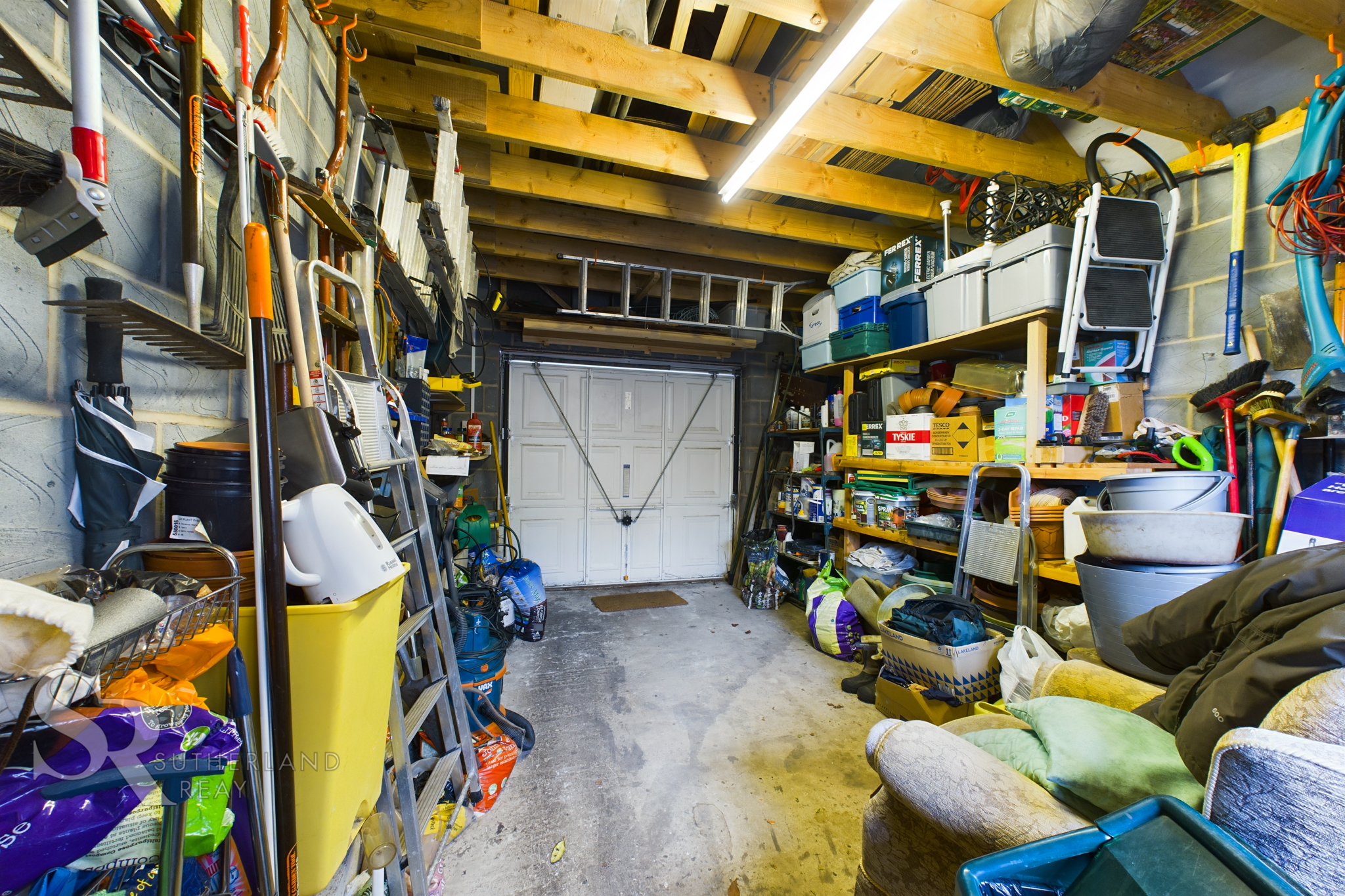 Up and over garage door, double glazed uPVC window to the rear elevation, shelving, lighting and power.