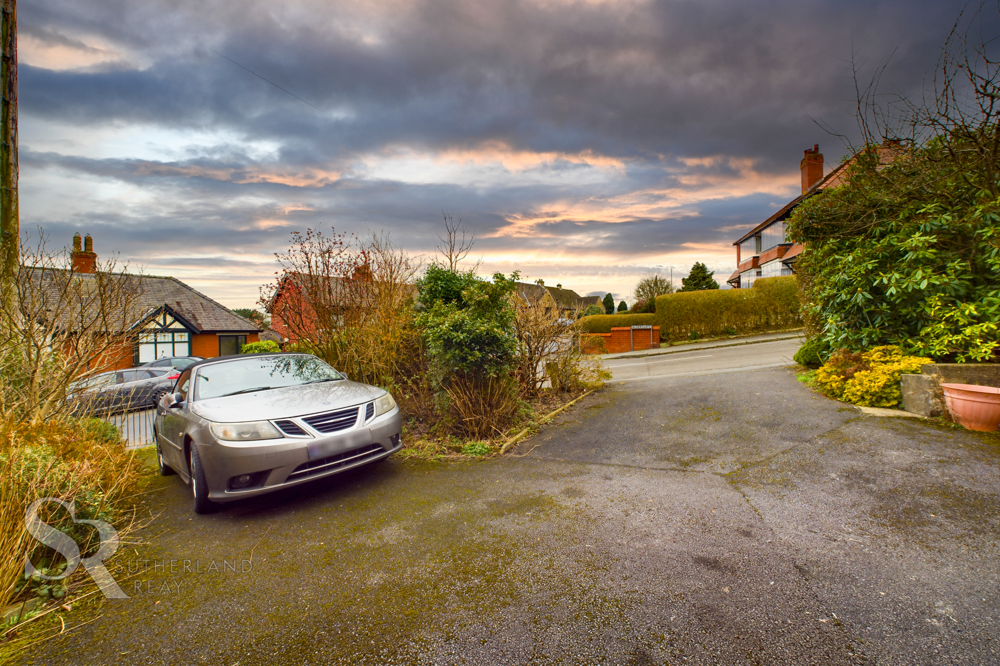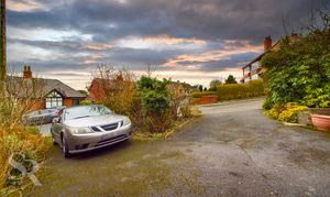 Large tarmac driveway with two entrances. Established flower beds with bushes and shrubs access to the garage and front door.