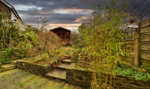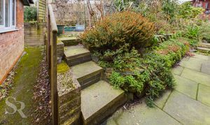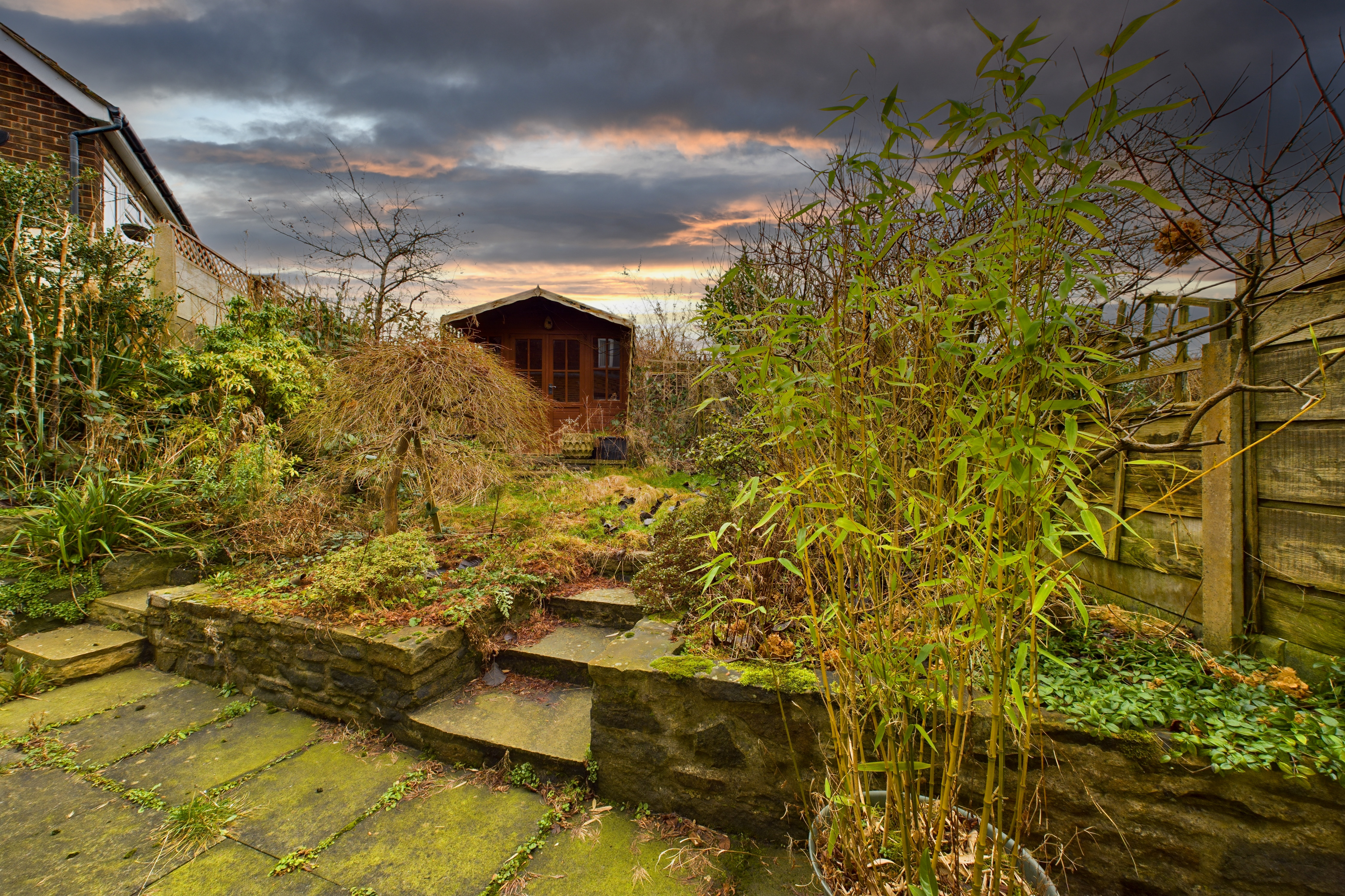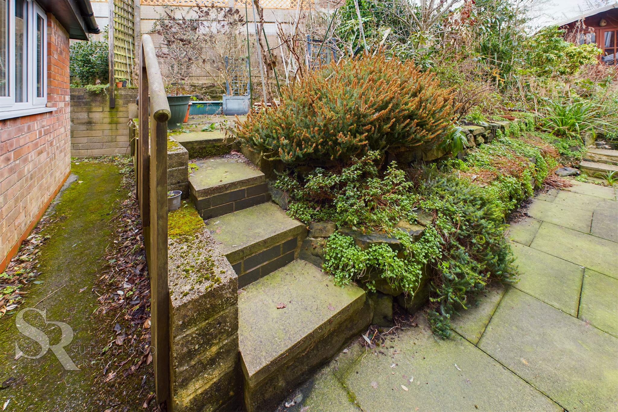 Patio area with steps up to lawned garden with established planting, wooden summer house. Raised flower bed with bushes and shrubs. Paved pathway leading around the garage to the front of the property.