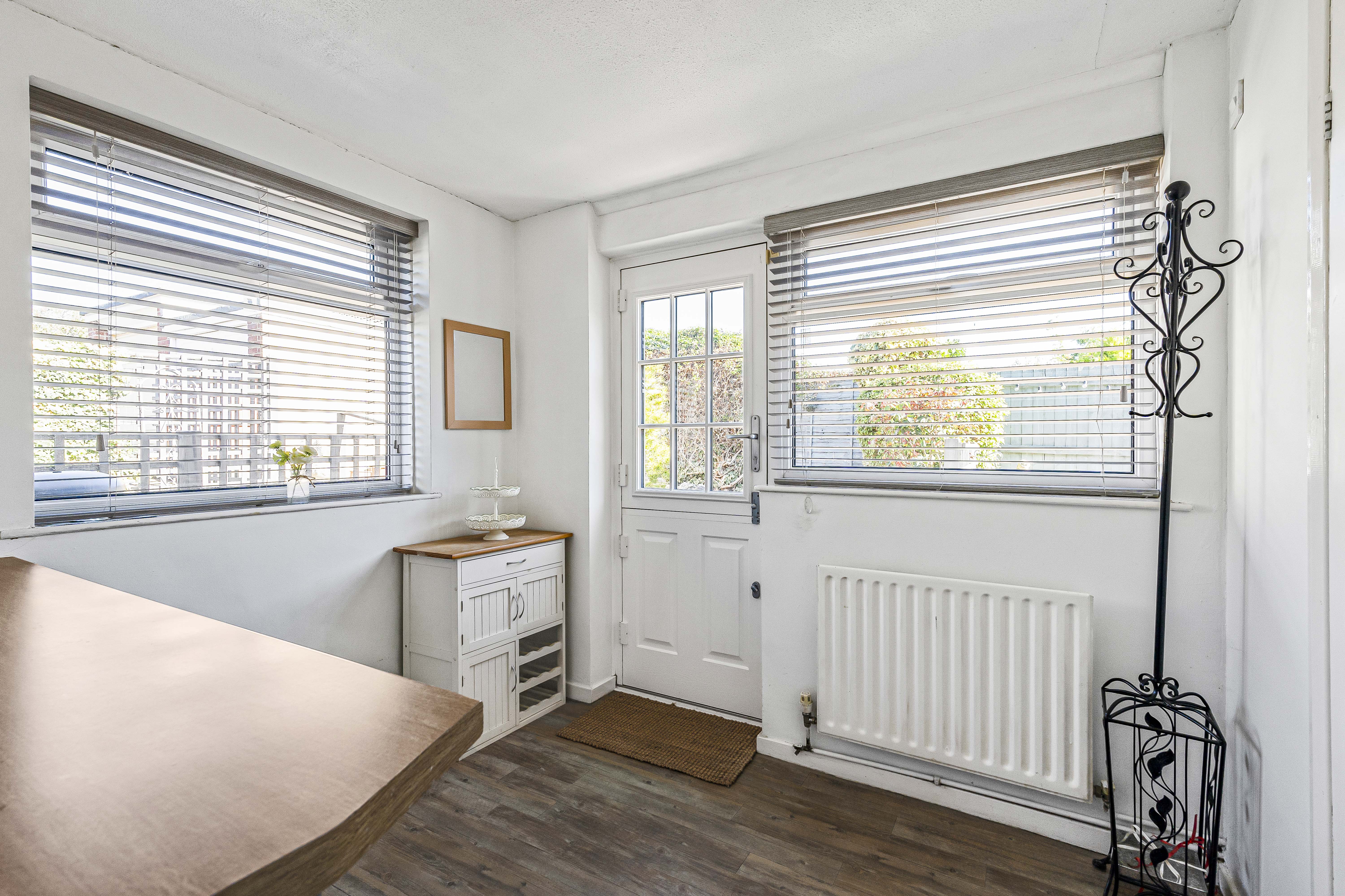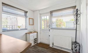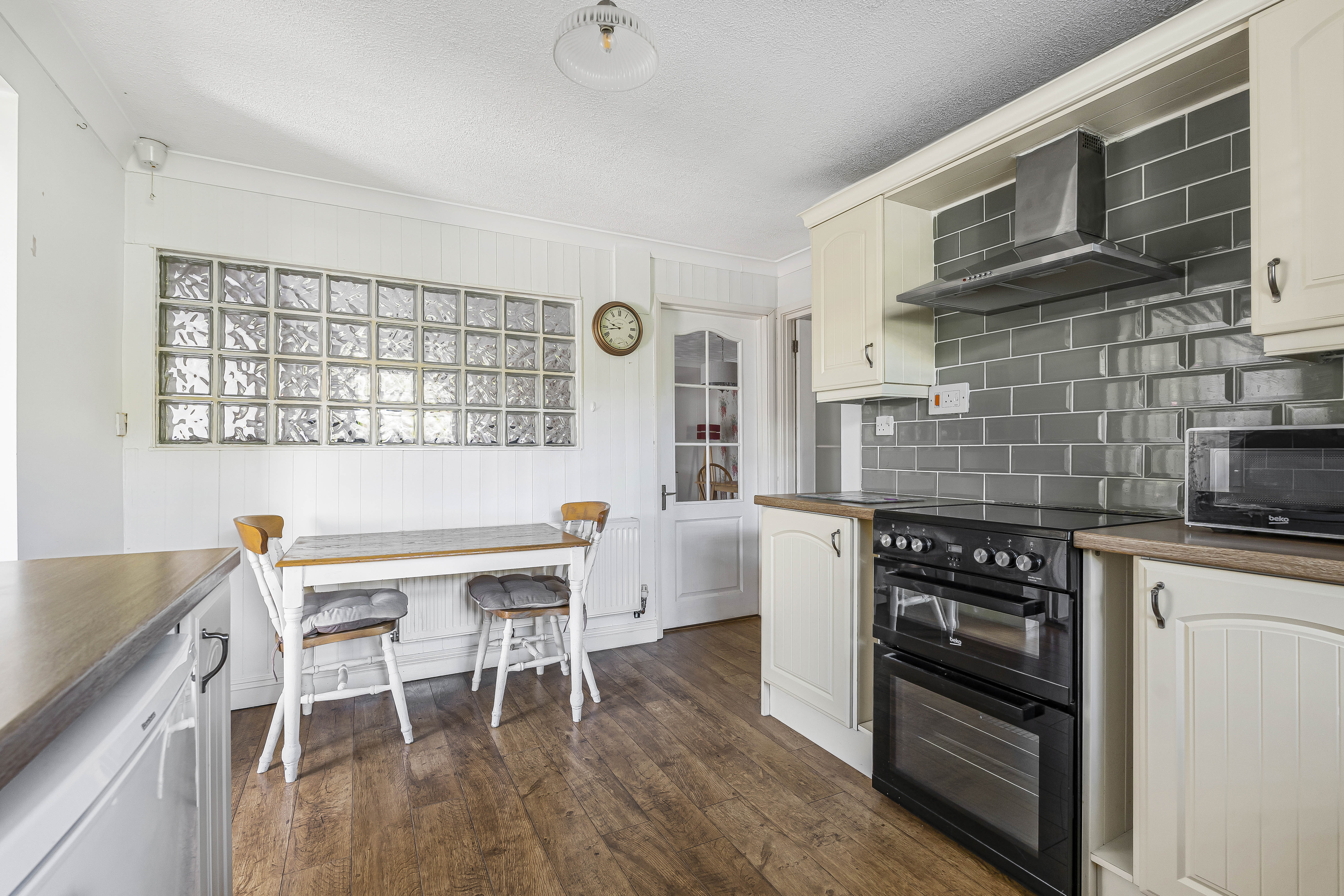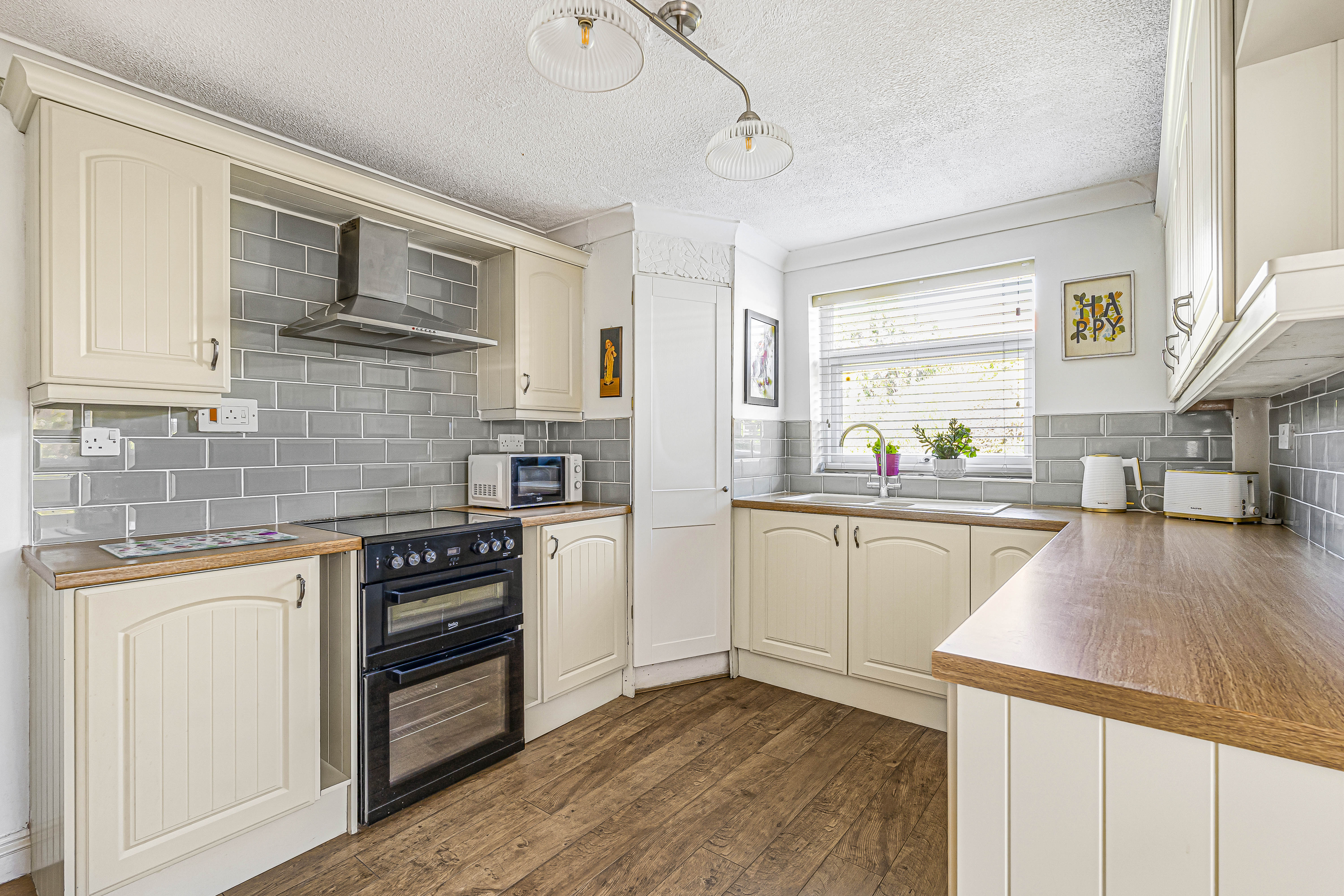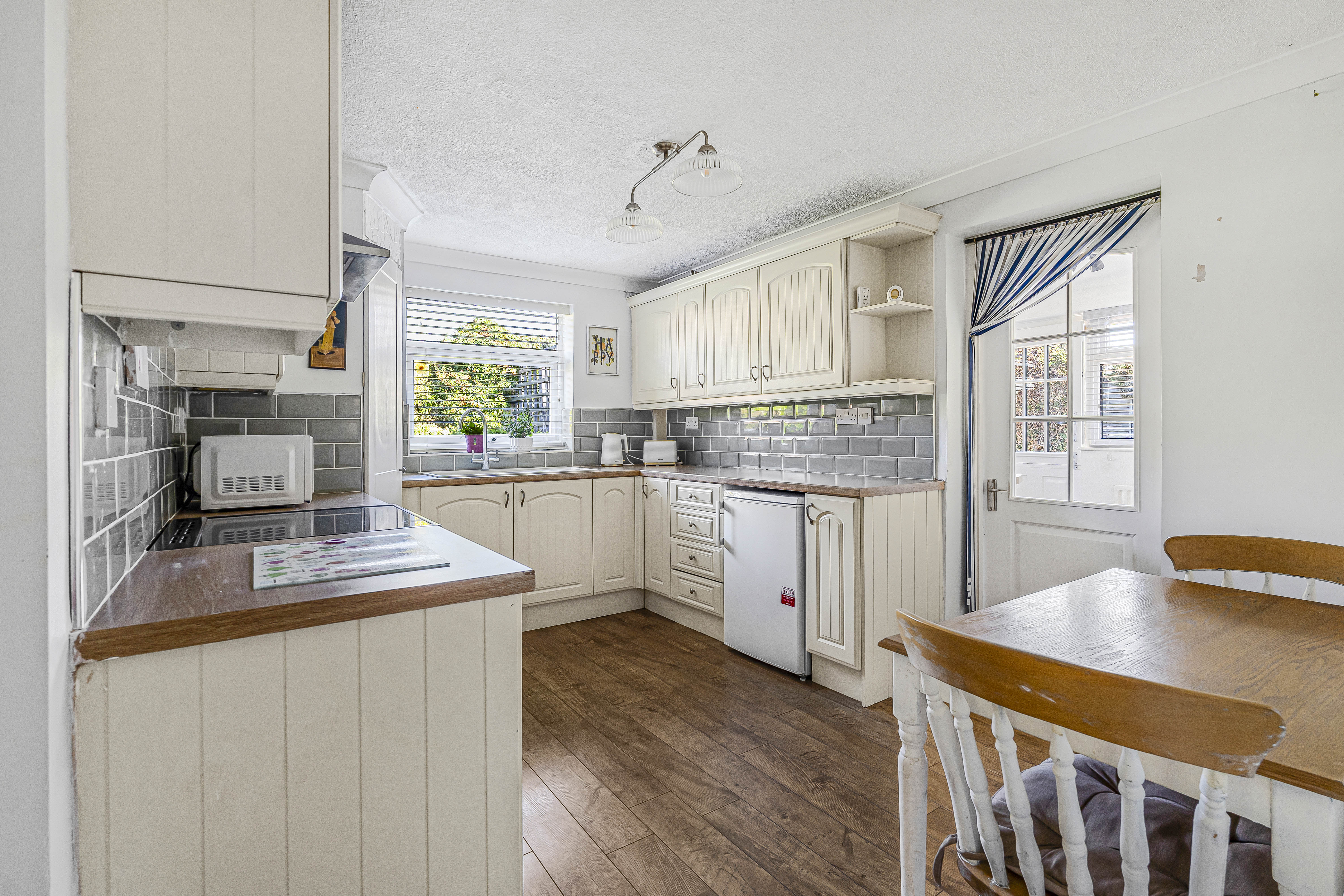 With a window to the side overlooking the gardens, the kitchen is fitted with a range of shaker style cupboard units and worktop space. There is space for a cooker with an extractor over, space for an under counter fridge and a sink with a drainer. The gas fired boiler is sited in the corner, hidden in a cupboard.