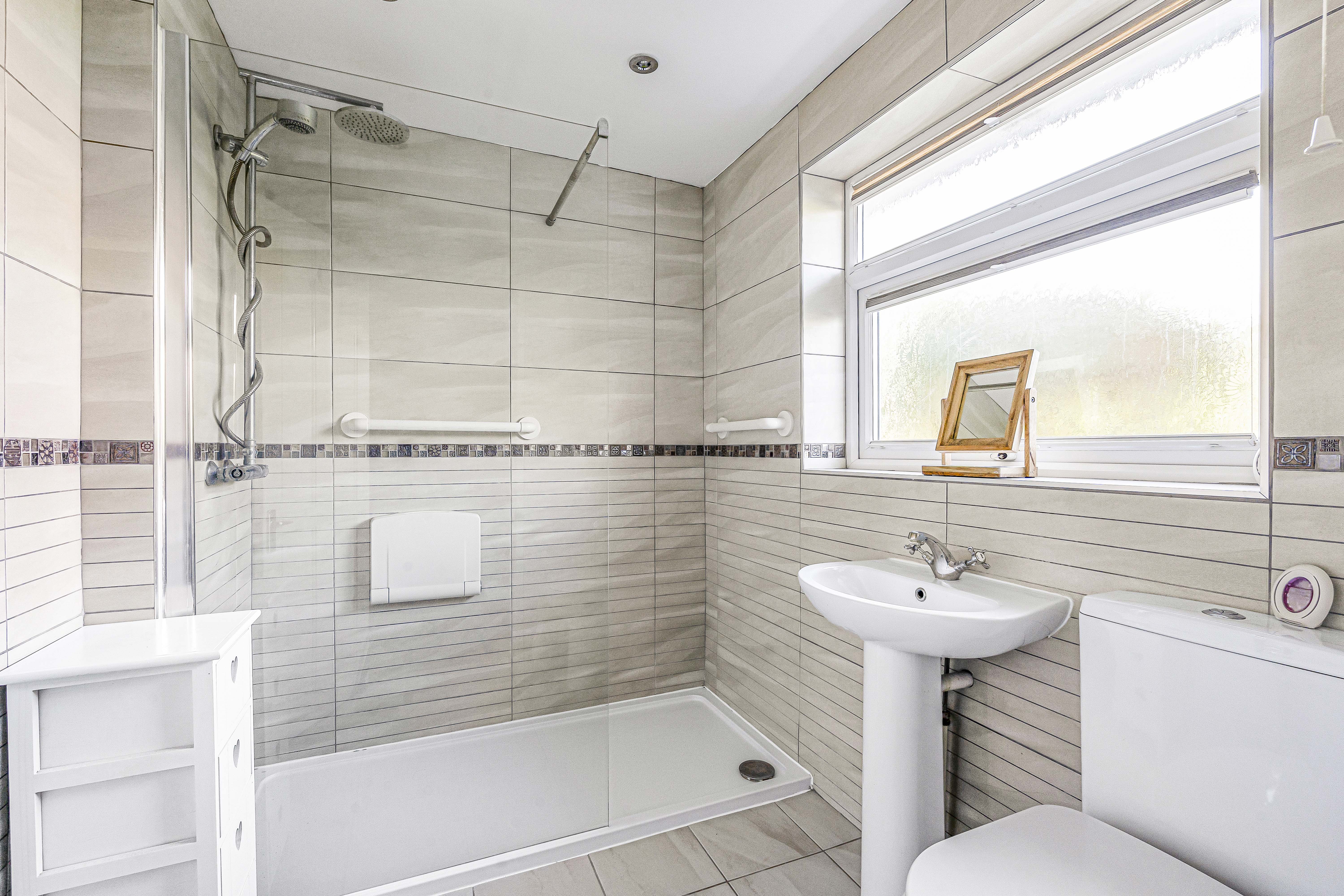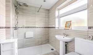 The contemporary shower room is fitted with a three piece suite comprising double shower cubicle with independent shower over, rainfall shower head and separate shower attachment, close coupled WC and a wash hand basin. An obscure window overlooks the front, there is a heated towel rail and modern tiled surrounds.