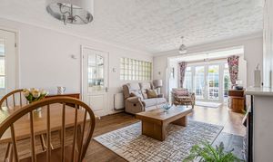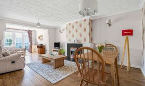 A large living room with french doors overlooking the rear garden and plenty of space for furniture as well as a dining table. A coal effect fire provides warmth and a focal point to the room.