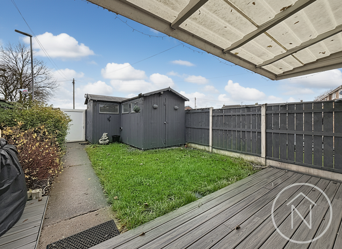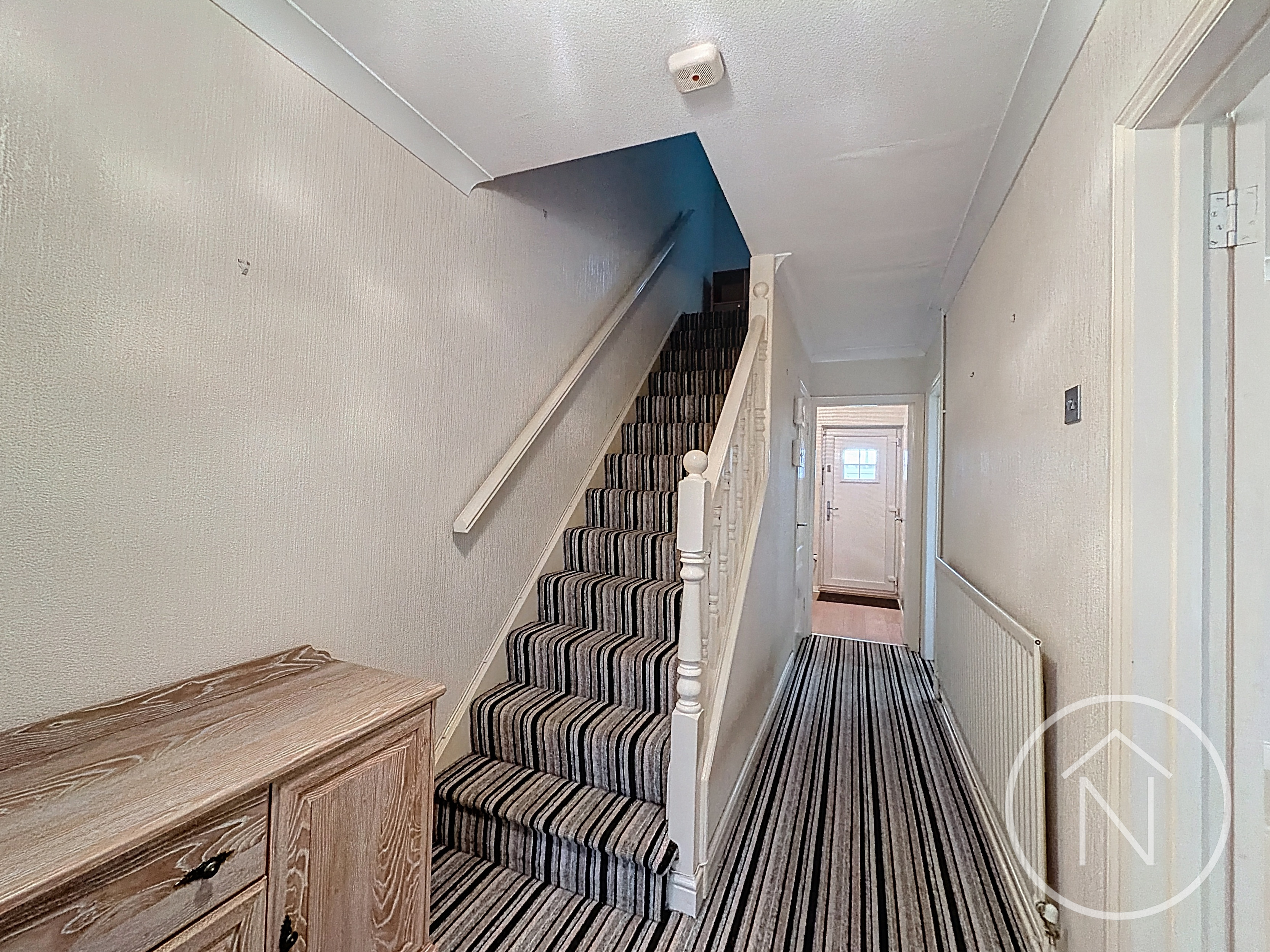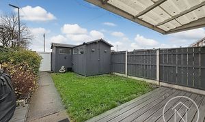 Additional features include a separate utility room with ample overhead storage, and direct outdoor access for added convenience. The welcoming hallway features a striped carpeted staircase, while gas central heating ensures warmth throughout. Outside, the property boasts a charming front garden with a pathway to the entrance and double-glazed windows for energy efficiency. The enclosed south facing rear garden offers a well-maintained lawn, decked patio area and a practical shed complete with light and power.