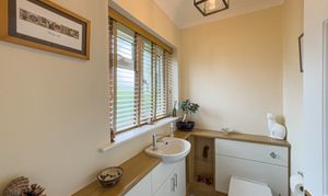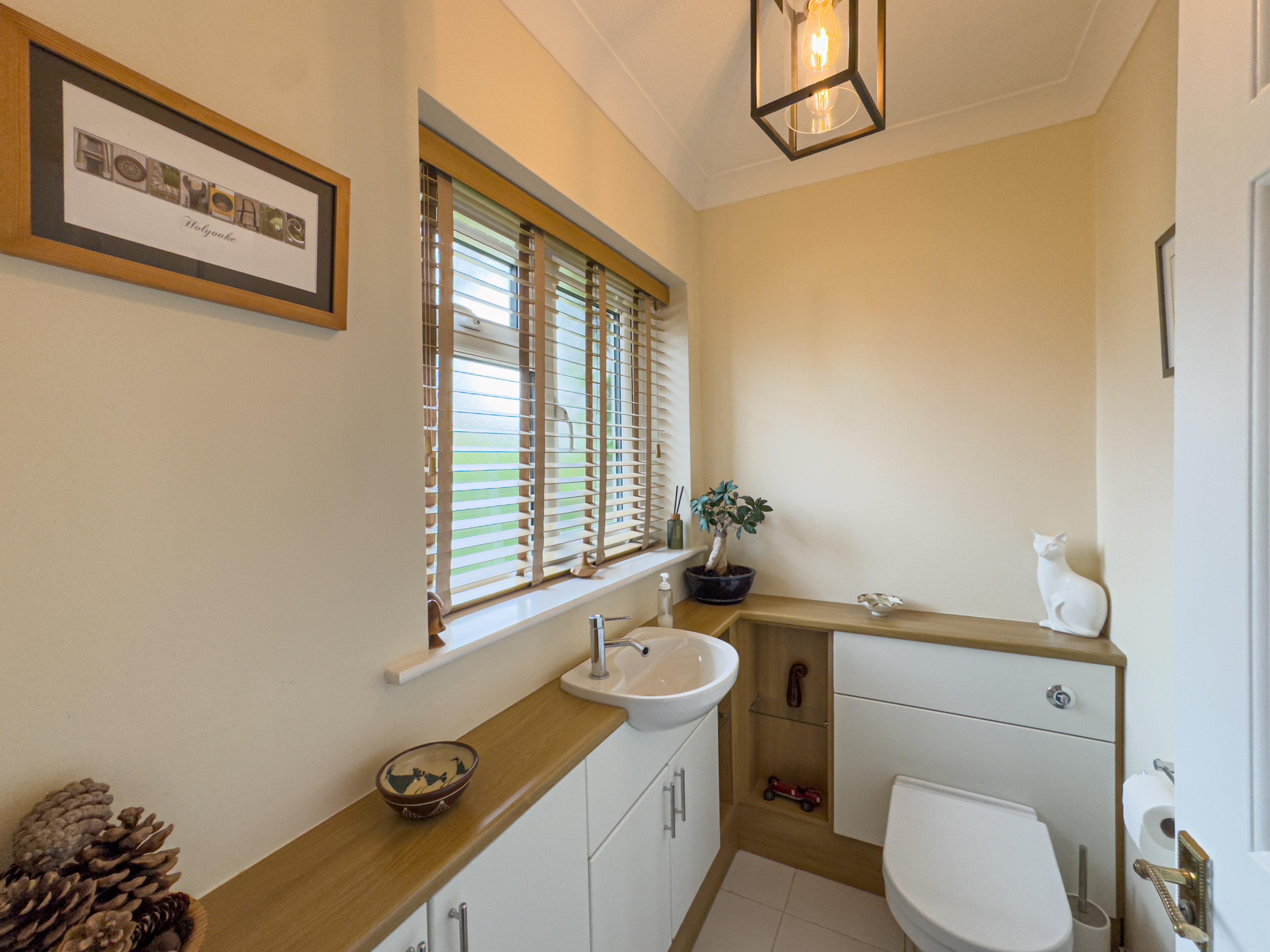 White toilet suit with built in storage unit. There is an obscured glass window to the front of the property.