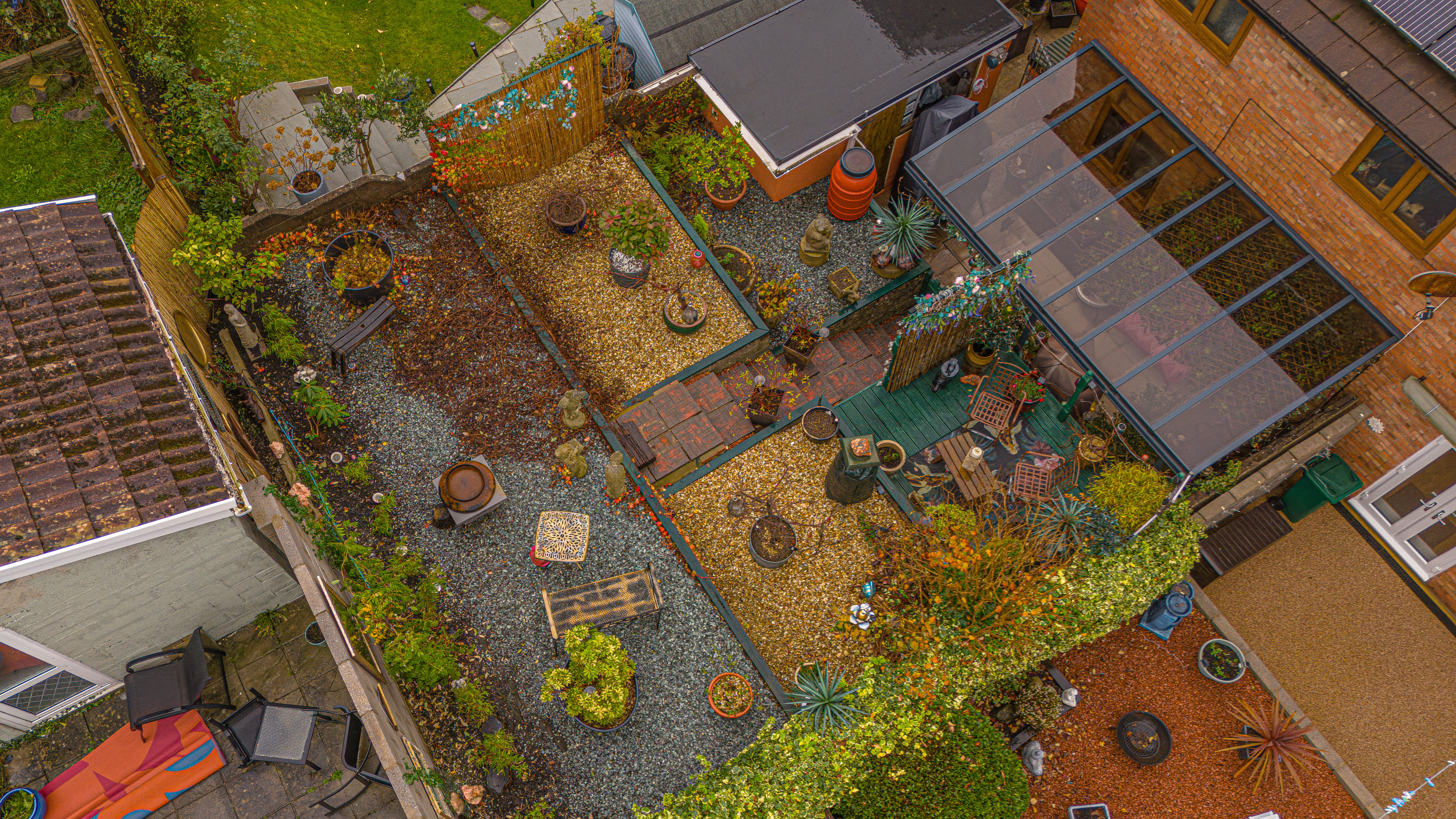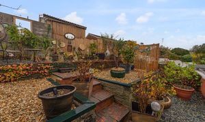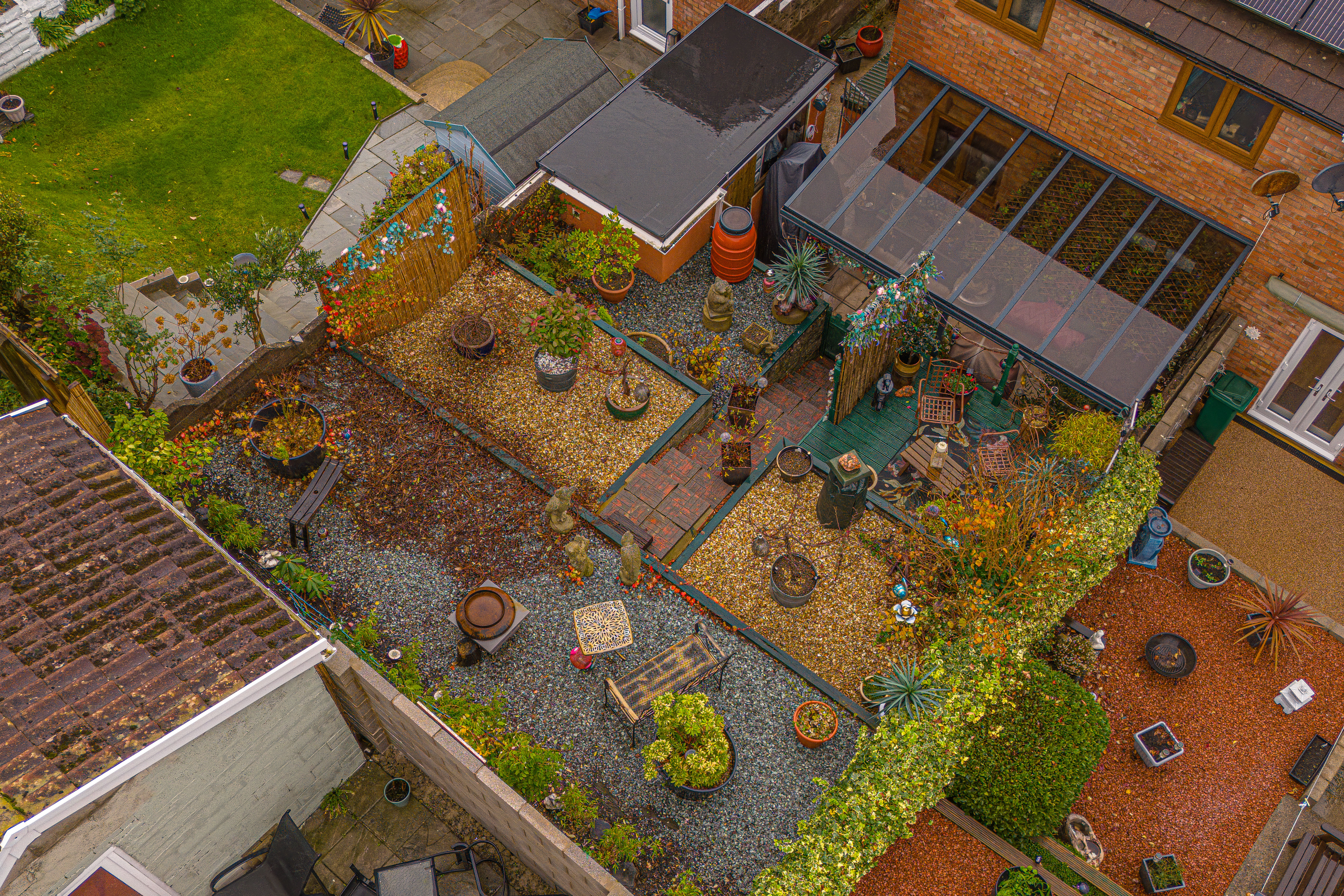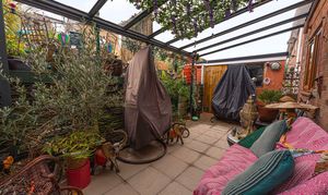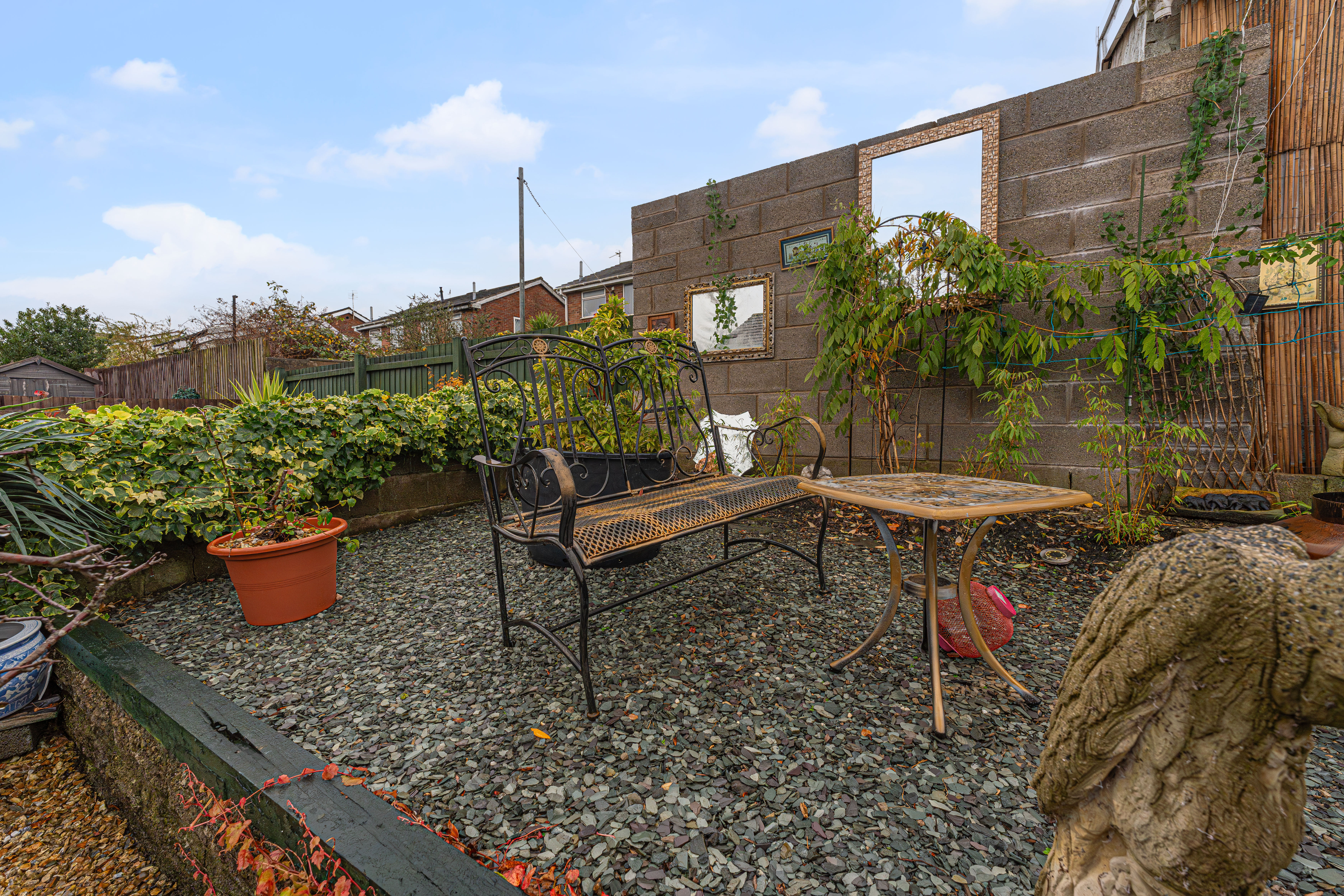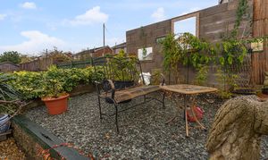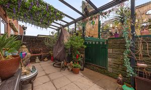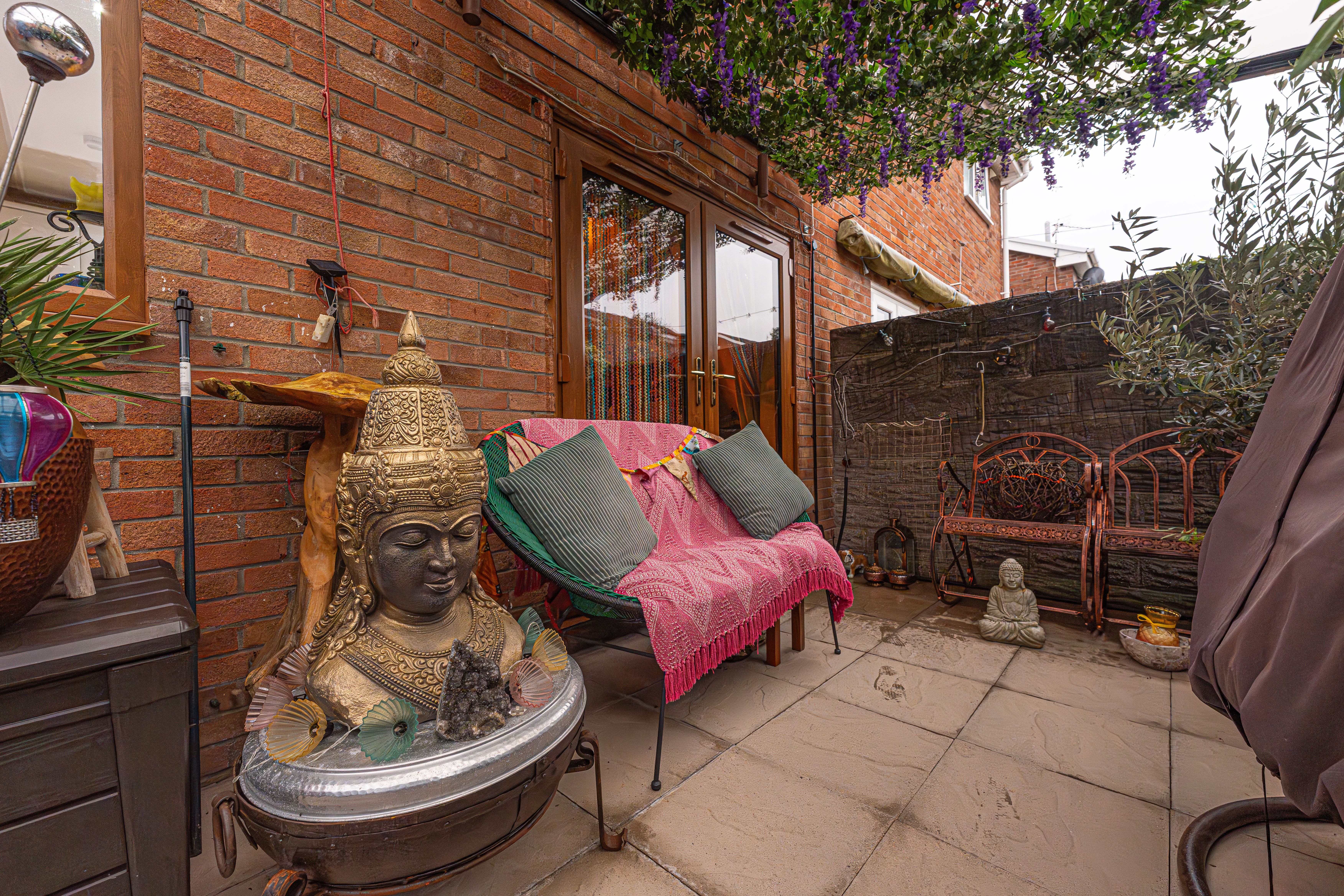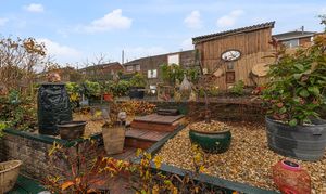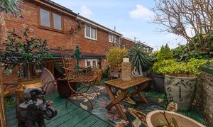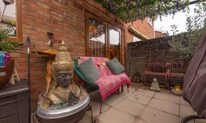 Stepping outside we have the wonderful rear garden, and is thoughtfully designed with multiple seating areas and ample space to unwind at the end of a long day. Connected to the house is a covered patio, with a charming deck area, and a large terraced garden beyond comprised of pebble stone and decorative planters, highlighting an ideal outdoor retreat that is well suited for welcoming visiting friends and family. The property also benefits from a useful outbuilding, and a driveway that can park 1-2 vehicles, with the gated section being perfect for additional patio space at the side of the house.
