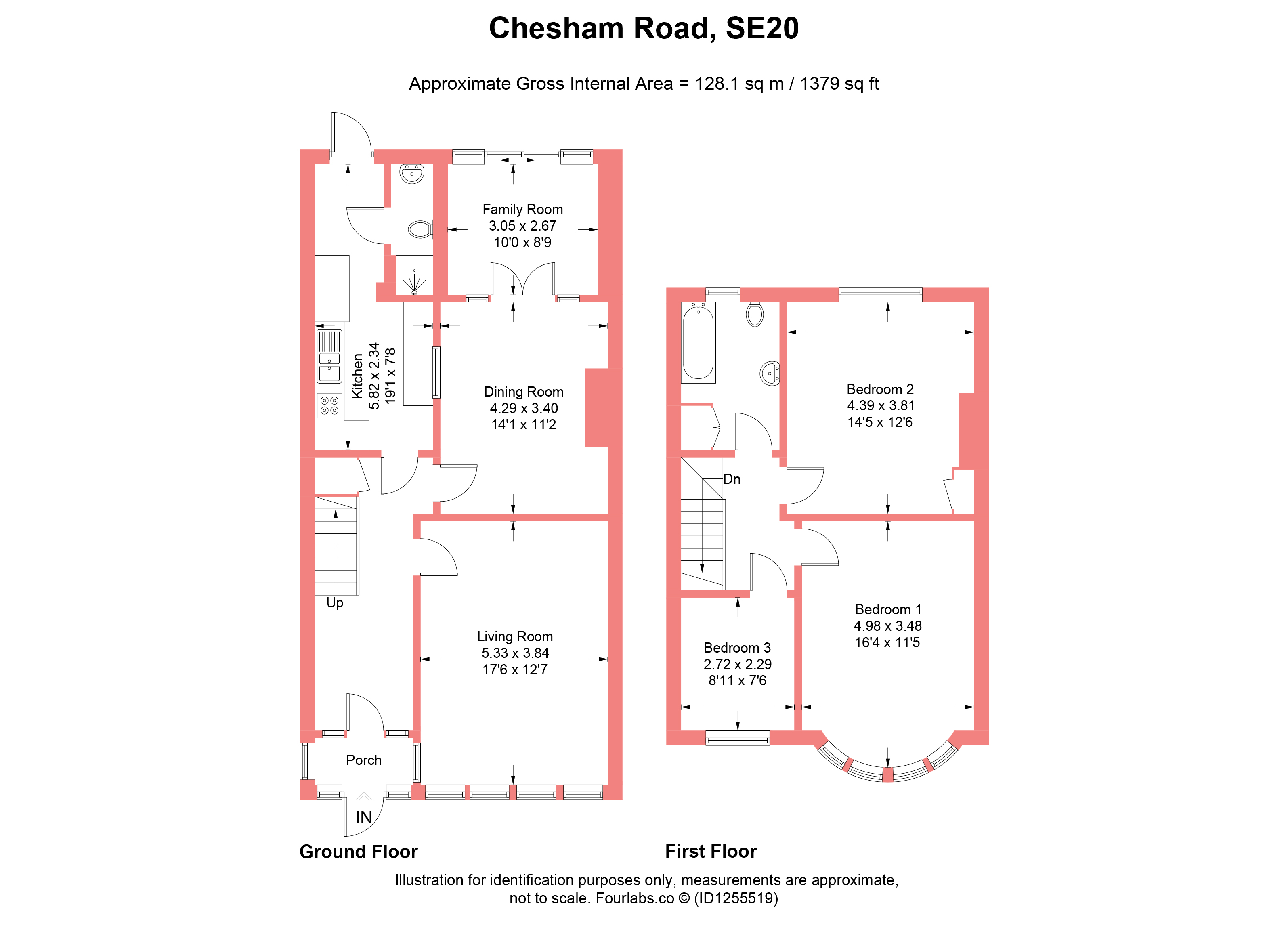 This is a proper family house with over 1,300 square feet of space before you even think about extending. The layout gives you a front reception room, a separate dining room, and a family room at the back that opens onto the garden. The kitchen runs along the side and while it's dated, it's functional—there's a gas hob, space for appliances, and a skylight that brings in natural light. Upstairs, you've got three bedrooms across the first floor. The principal bedroom is a good double at nearly 17 feet long, bedroom two is another double at just over 14 feet, and bedroom three is a single. There's a family bathroom with a separate shower and bath.