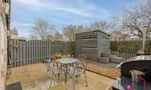 To the rear, the property enjoys a low-maintenance, enclosed garden designed for ease and entertaining. A paved patio provides ample space for outdoor dining, complemented by decorative gravel borders and fencing for privacy. There is also a useful timber shed for storage and an additional seating area, creating a versatile outdoor space ideal for relaxing or socialising. A standout feature is the first-floor balcony above, adding further outdoor enjoyment and overlooking the rear garden. To the front, the property benefits from a private driveway providing off-road parking and access to an integral garage.