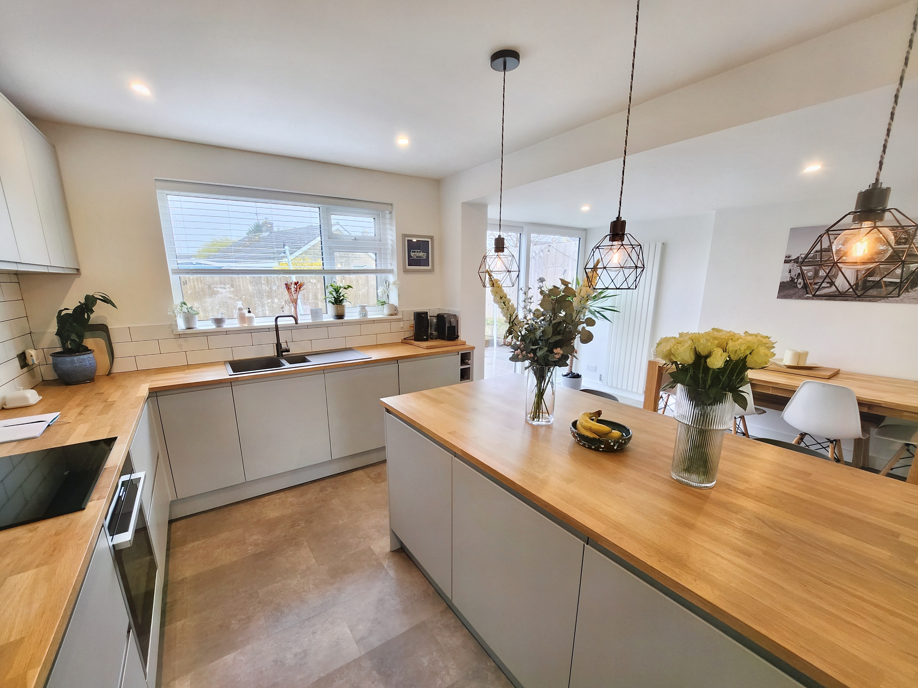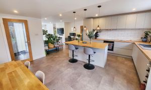Kitchen area is fully refitted with plenty of space, and storage. Range of wall and base units with sink unit and appliances, double glazed window to rear garden - there is a central island which completes the kitchen area. The dining area has double sliding doors to rear garden