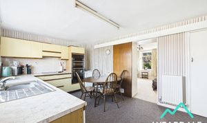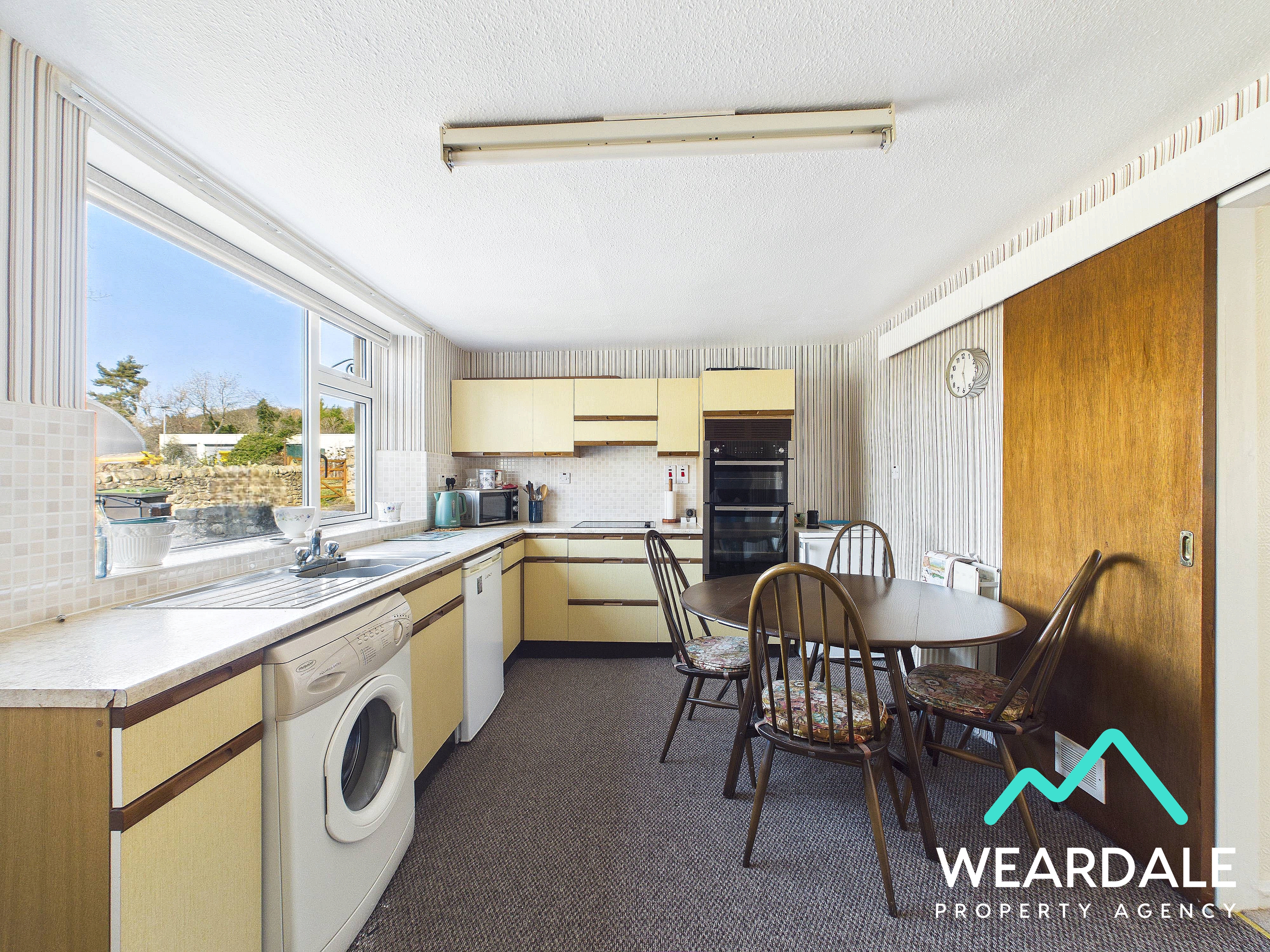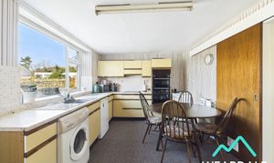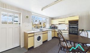 - Positioned to the rear of the property, accessed from the living room via a sliding wooden door, and providing onward internal access to the rear porch - Double-glazed uPVC window with deep tiled sill to the Western aspect, looking over the rear garden and providing amazing views of the surrounding hillsides - Carpeted - Range of over/under counter storage units - Laminate work surfaces with tiled splashbacks - Stainless steel sink and drainer - Integrated electric oven and grill - Integrated electric hob with overhead extractor - Plumbing for washing machine - Space for free-standing appliances - Ceiling light fitting - Two radiators - Large under stairs storage cupboard - Space for dining furniture