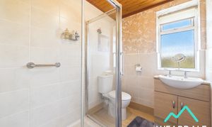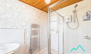 - Positioned to the rear of the property and accessed from the landing - Double-glazed uPVC window with deep tiled sill and frosted panes to the Western aspect - Laminate flooring - Fully tiled walls to the Eastern and Southern sides, with half-tiled walls to the Western and Northern sides - Wood panelled ceiling - Large walk-in shower cubicle with sliding glass door, fully tiled enclosure, and overhead electric shower - WC - Hand-wash basin set on a pedestal unit with under counter storage cupboards - Central ceiling light fitting - Vertical heated towel rail