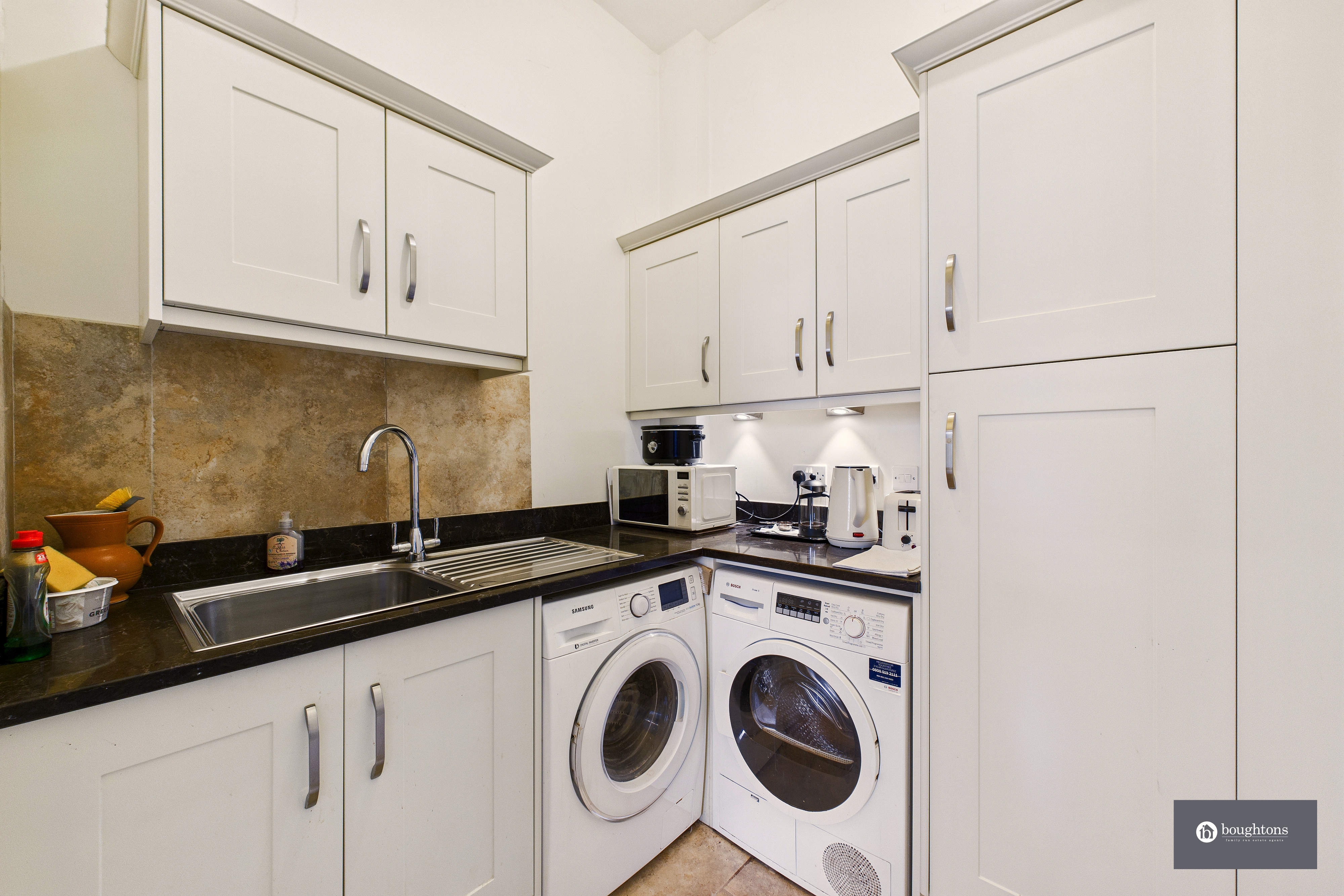 The kitchen/breakfast room has been designed to the highest standard, featuring stylish cabinetry and integrated Miele and Neff appliances — including a Miele induction hob, Miele triple oven, and Neff dishwasher — along with a matching breakfast bar for informal dining. A large sash window to the front aspect floods the room with light, creating a bright space. A separate utility room provides additional practicality, while a tiled downstairs W.C. offers convenience.