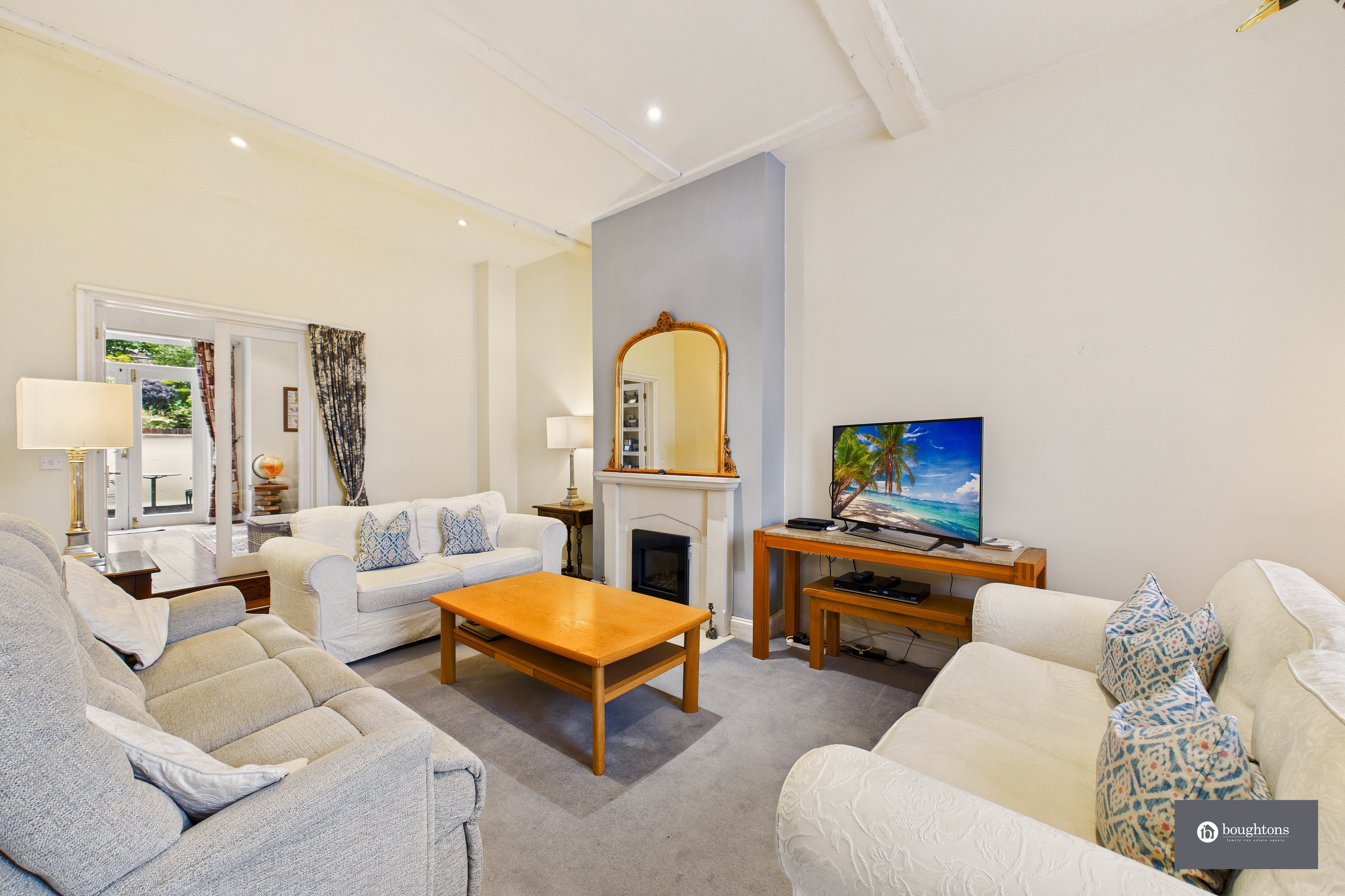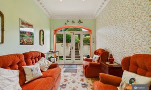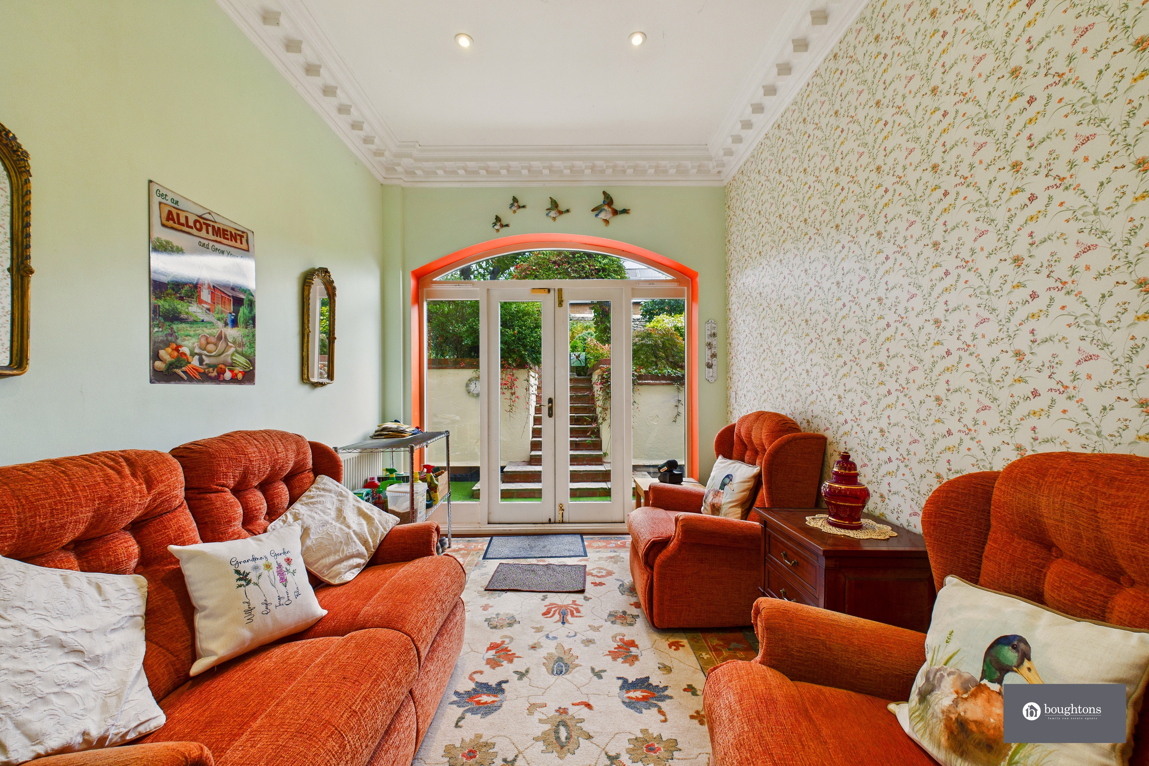 The ground floor offers plenty of beautifully arranged living space. The main living room features a central gas fire with classic mantelpiece, creating a warm and welcoming focal point. French doors lead through to the library, a versatile reception space ideal for a snug, study, or home office, with further French doors opening directly onto the rear garden.