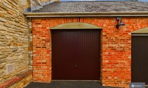 Outside, the private rear garden is enclosed by a stone wall and fencing to either side. It offers a lawn, patio terrace, and mature planting, creating a tranquil and elegant outdoor retreat. The property further benefits from a single garage with an electric door, located adjacent to the neighbouring home, and additional private gated parking accessed via Manor Road.