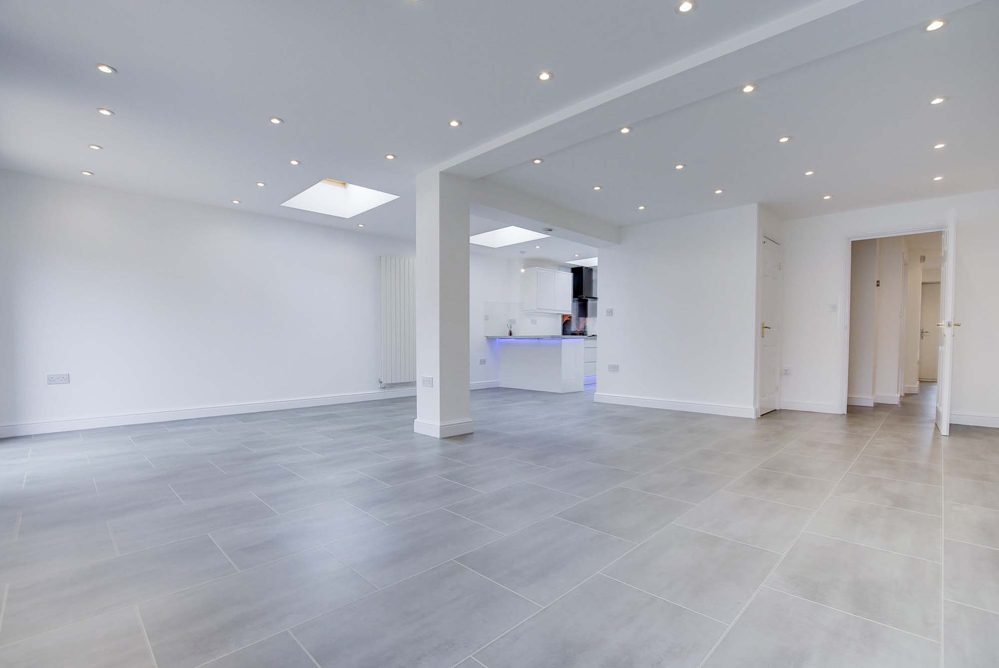 narrowing to 2.38 m. With double glazed window to the front elevation, double glazed skylight, Karndean floor, wall and base units with under unit lighting and work surface over and breakfast bar, stainless steel sink and drainer unit, integrated double oven, integrated hob with filter hood over and splashback, integrated dishwasher, plumbing for washing machine, newly installed (2025) wall mounted boiler, open access leading to the lounge diner.