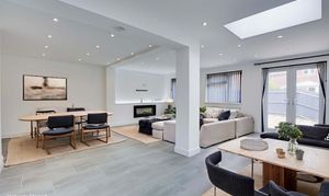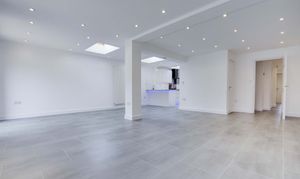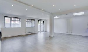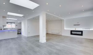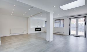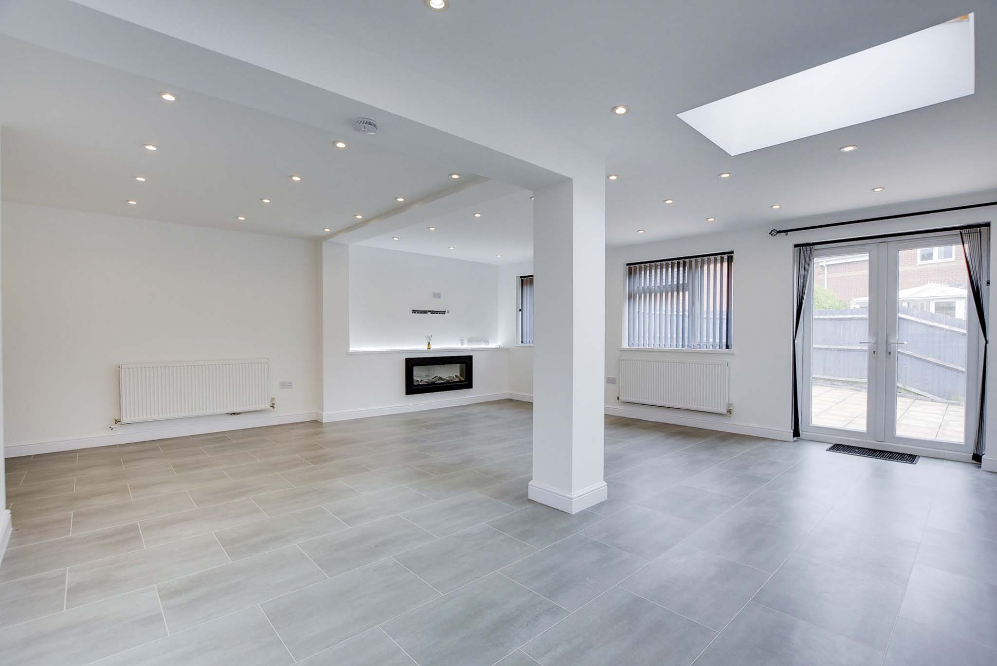 With double glazed windows and French doors to the rear elevation, two double glazed skylight windows, Karndean floor, electric fireplace, storage cupboard, three radiators.