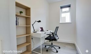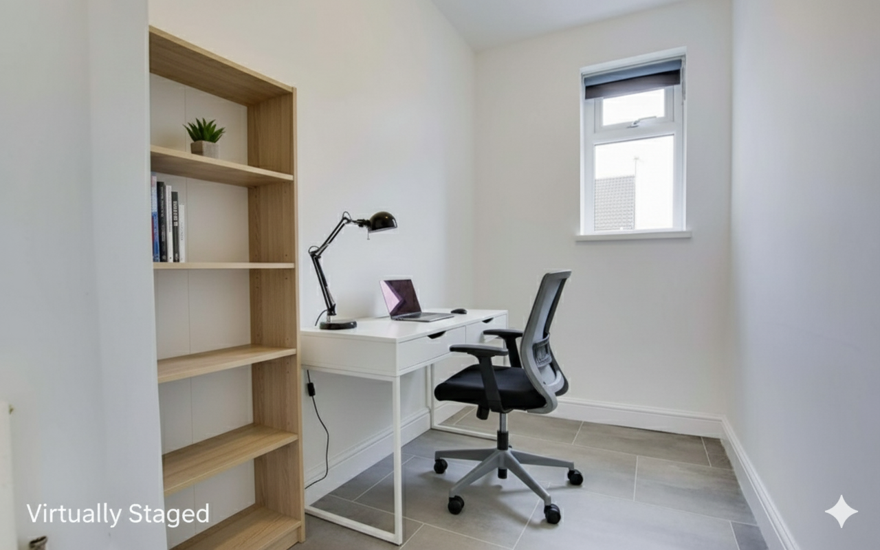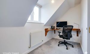 Part restricted headroom. With double glazed window to the front elevation, built-in storage cupboard, fitted desk top, carpet floor, radiator.
