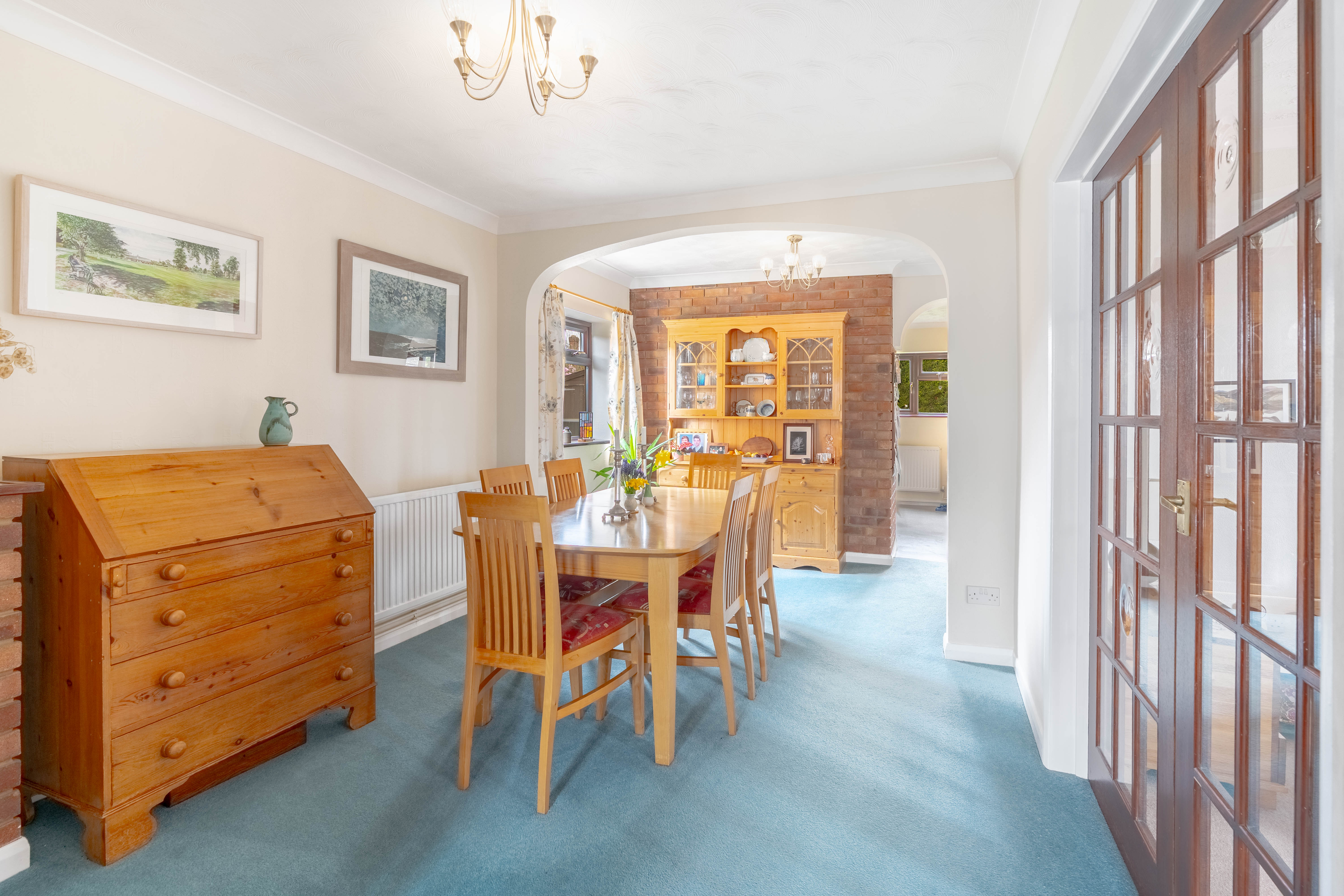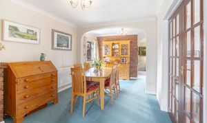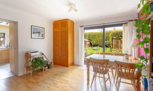 Stepping inside, you are welcomed by a generous entrance hall, providing ample space for coats, shoes and storage, along with a convenient downstairs WC. From here, glazed double doors lead you through to a spacious dining room, a wonderfully bright and flexible area with plenty of scope for entertaining. To one side, double doors open into the living room, while straight ahead the layout flows naturally into the kitchen.