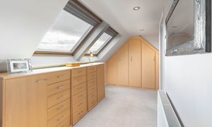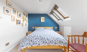 Upstairs, the first floor offers three well-proportioned double bedrooms along with a particularly spacious family bathroom, providing comfort and practicality for busy households. Rising to the second floor, the principal bedroom is a standout feature of the home, boasting four large Velux windows that flood the space with light, along with extensive built-in wardrobes and additional storage. This room is further enhanced by a stylish en suite shower room, creating a peaceful and private retreat.