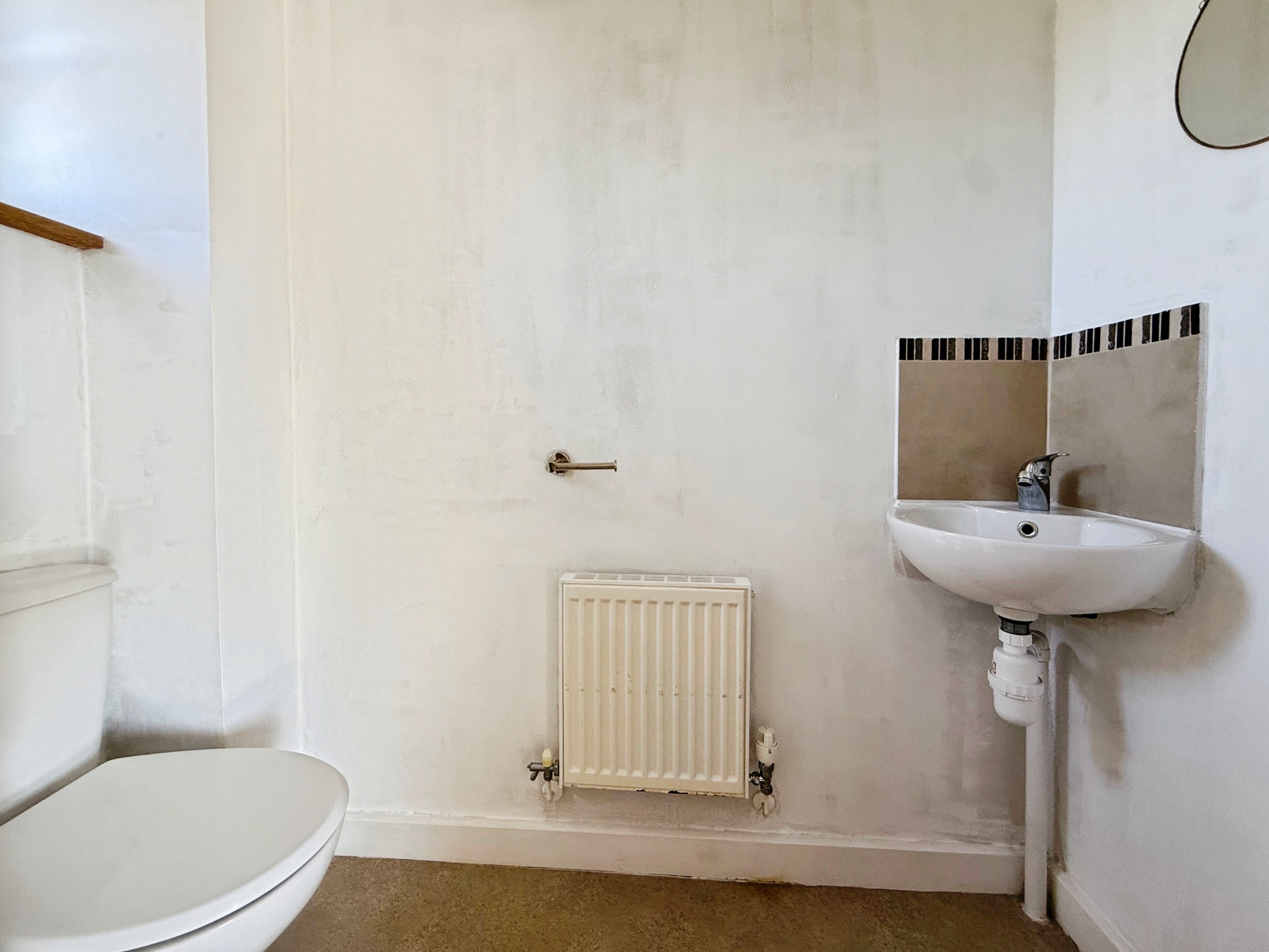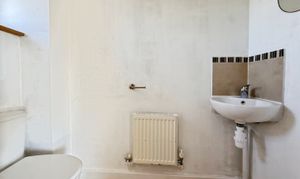 Laminate flooring, low level WC, wash hand basin, double glazed window to front with obscure glass, radiator.