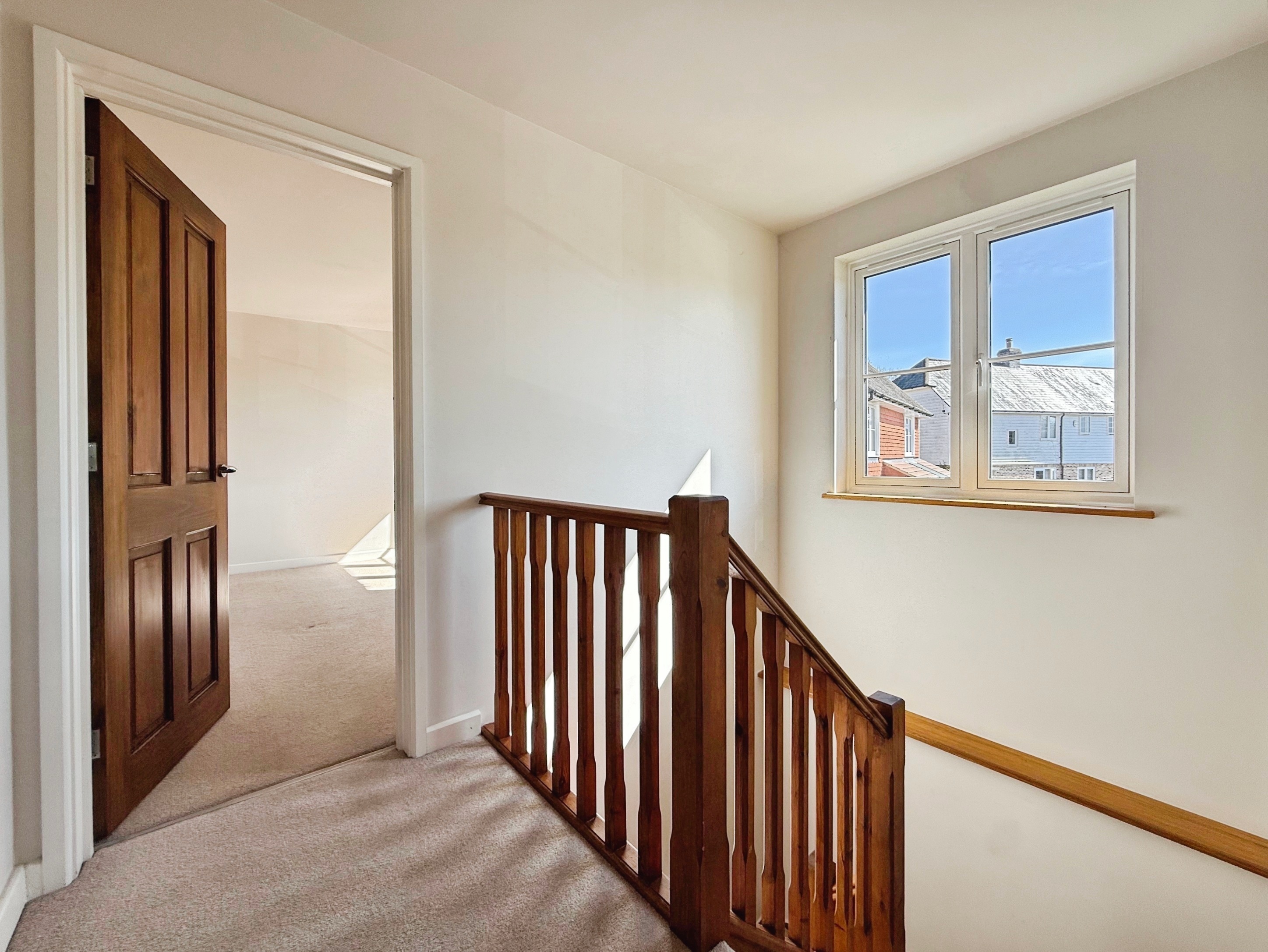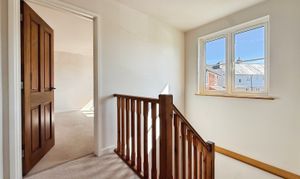 Accessed via carpeted stairs. Carpeted, access to loft, cupboard with shelving. Doors to three bedrooms and family bathroom.