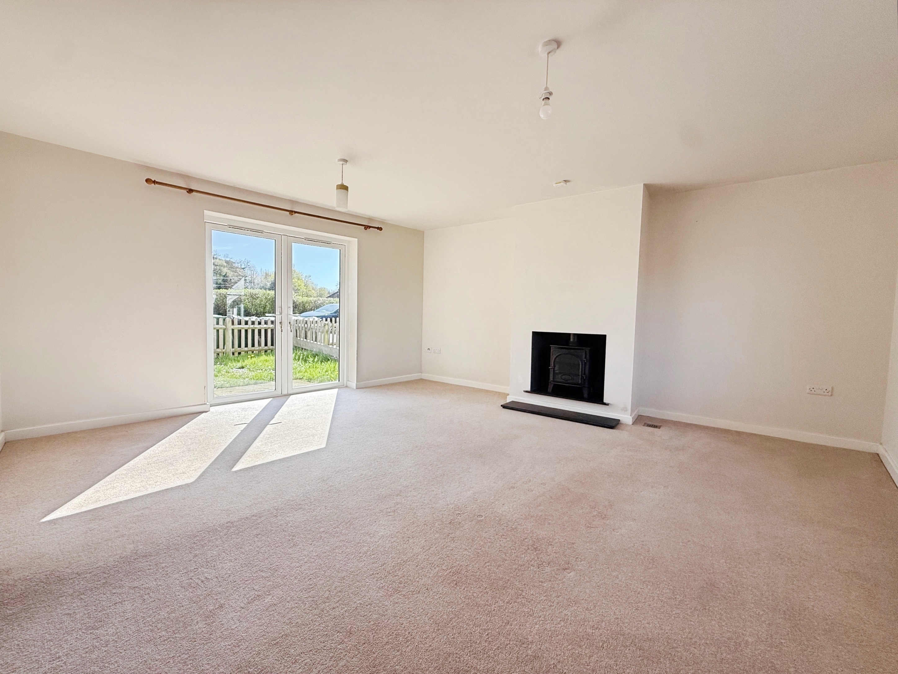 Carpeted, dual aspect with double glazed window to front, double glazed patio doors to rear leading onto garden, fireplace with log burner, radiator.