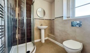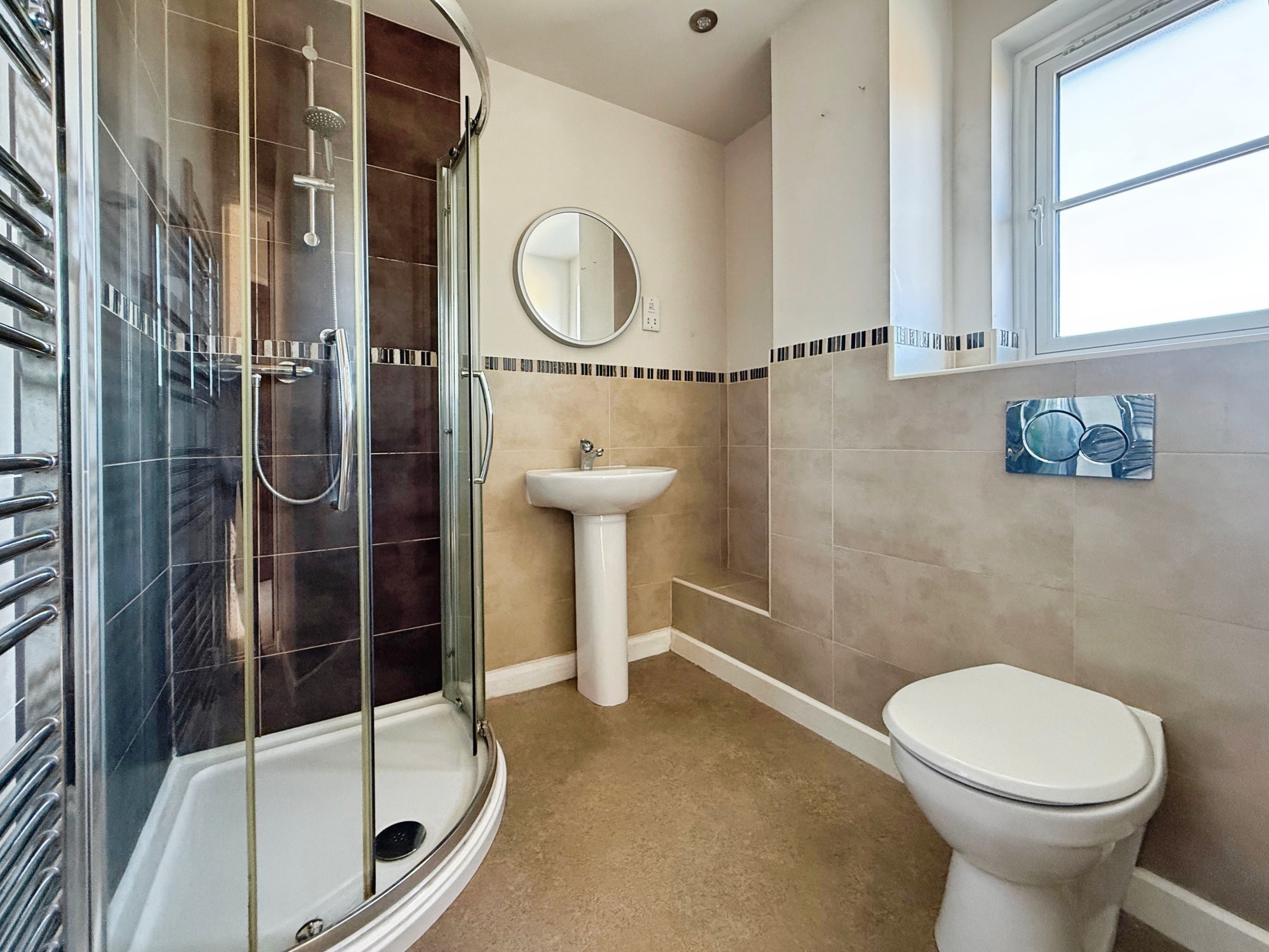 Laminate flooring, shower cubicle, wash hand basin, low level WC, double glazed window to front with obscure glass, heated towel rail.