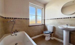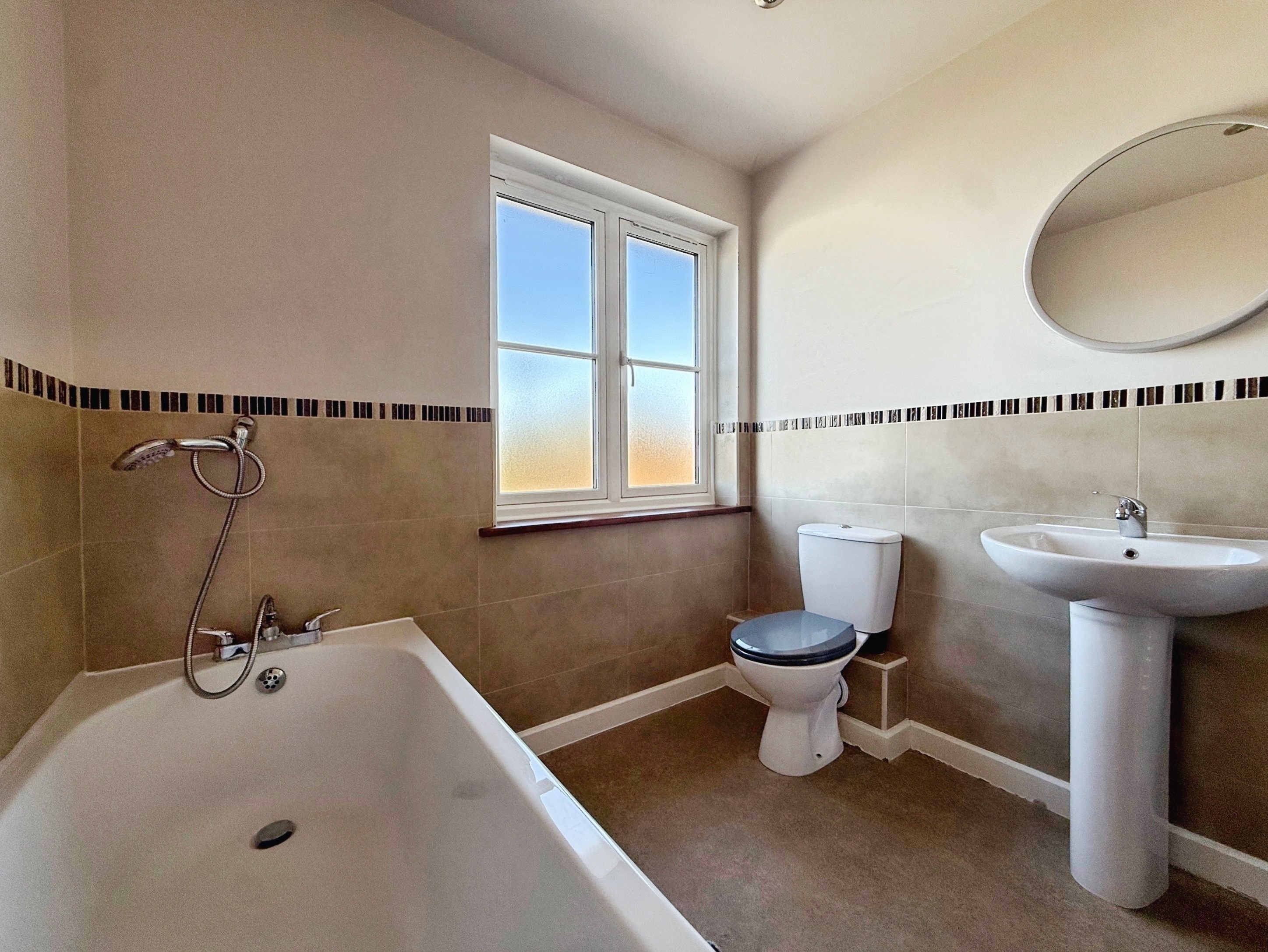 Lino flooring, bath with shower over, low level WC, wash hand basin, heated towel rail, double glazed window to front with obscure glass.