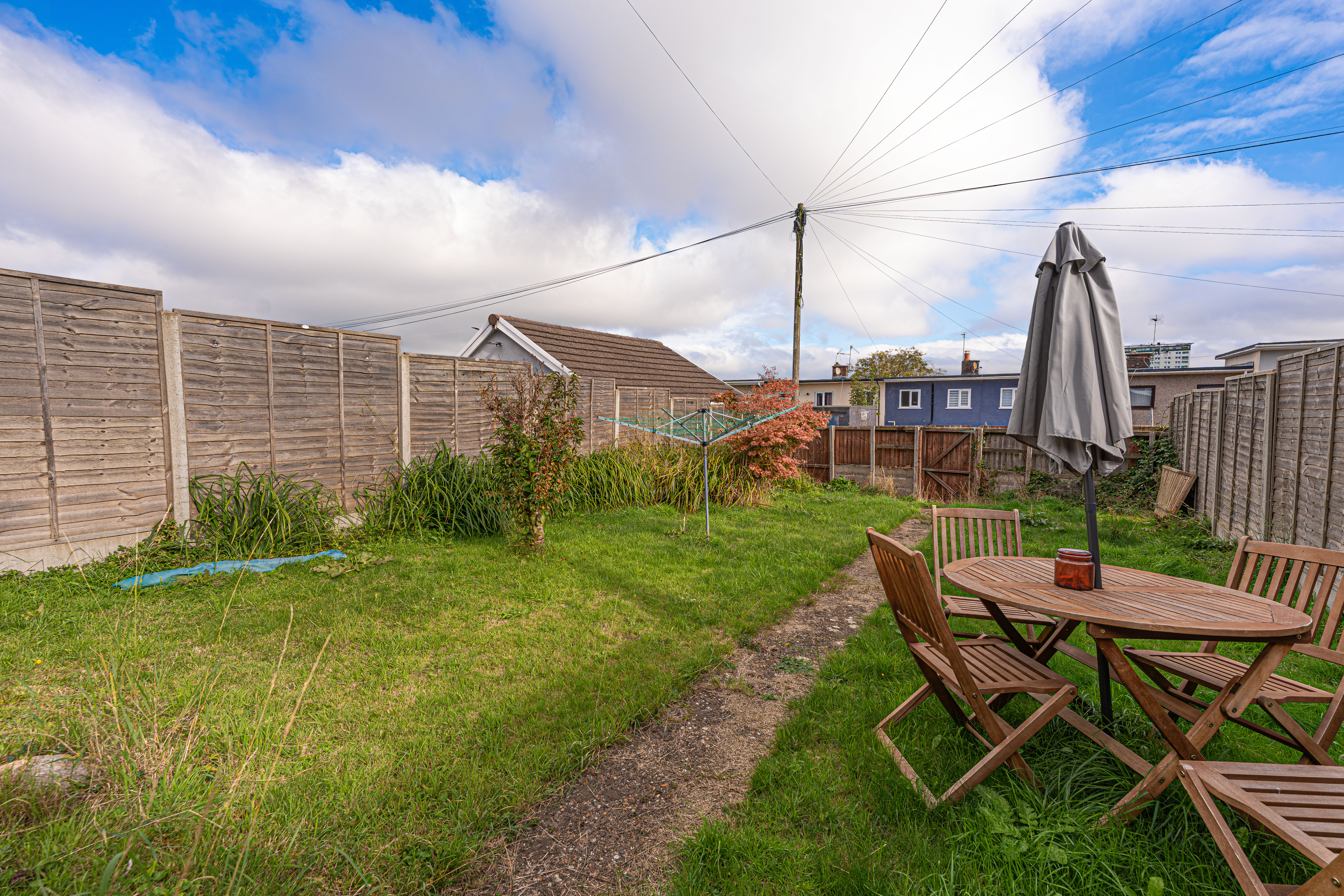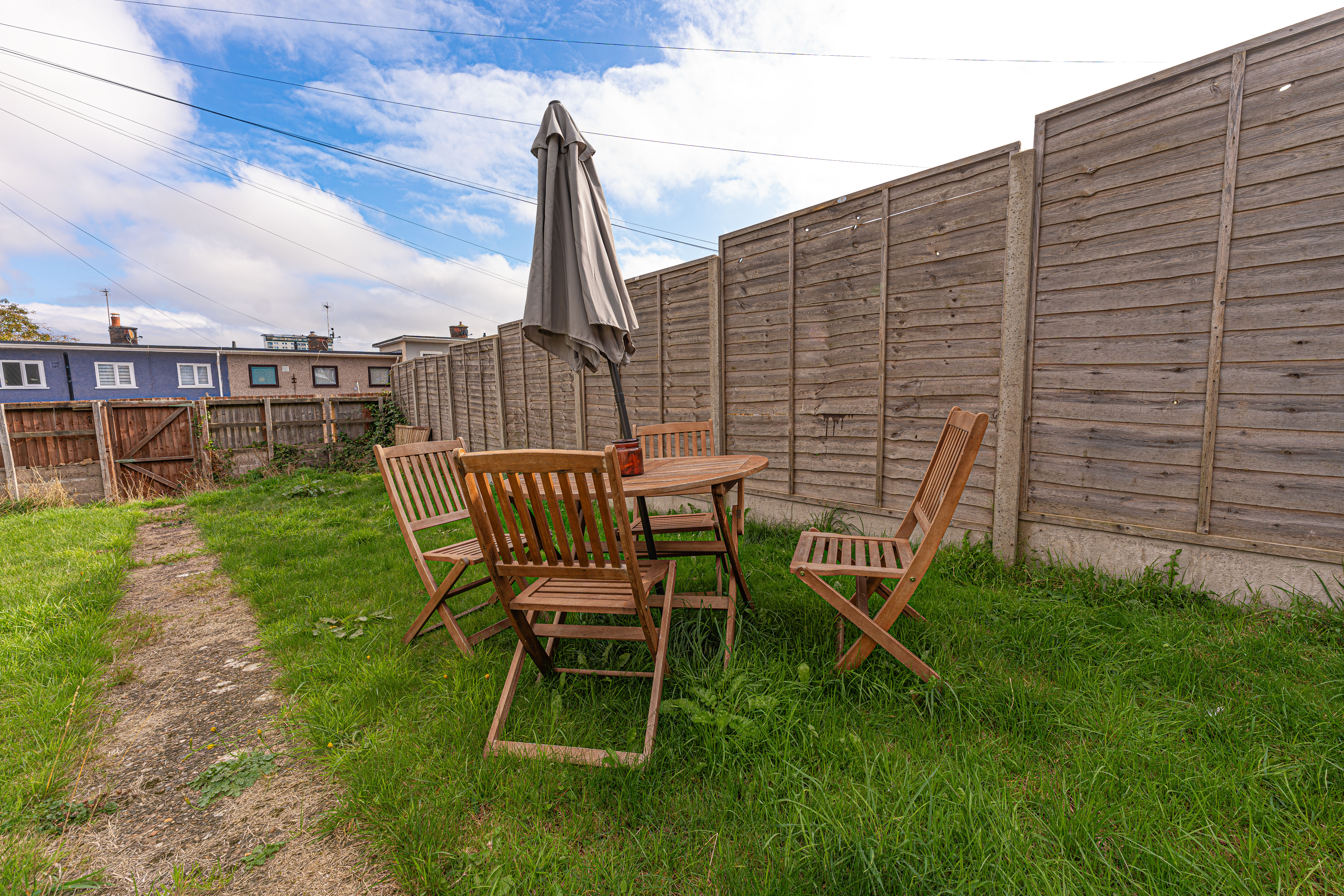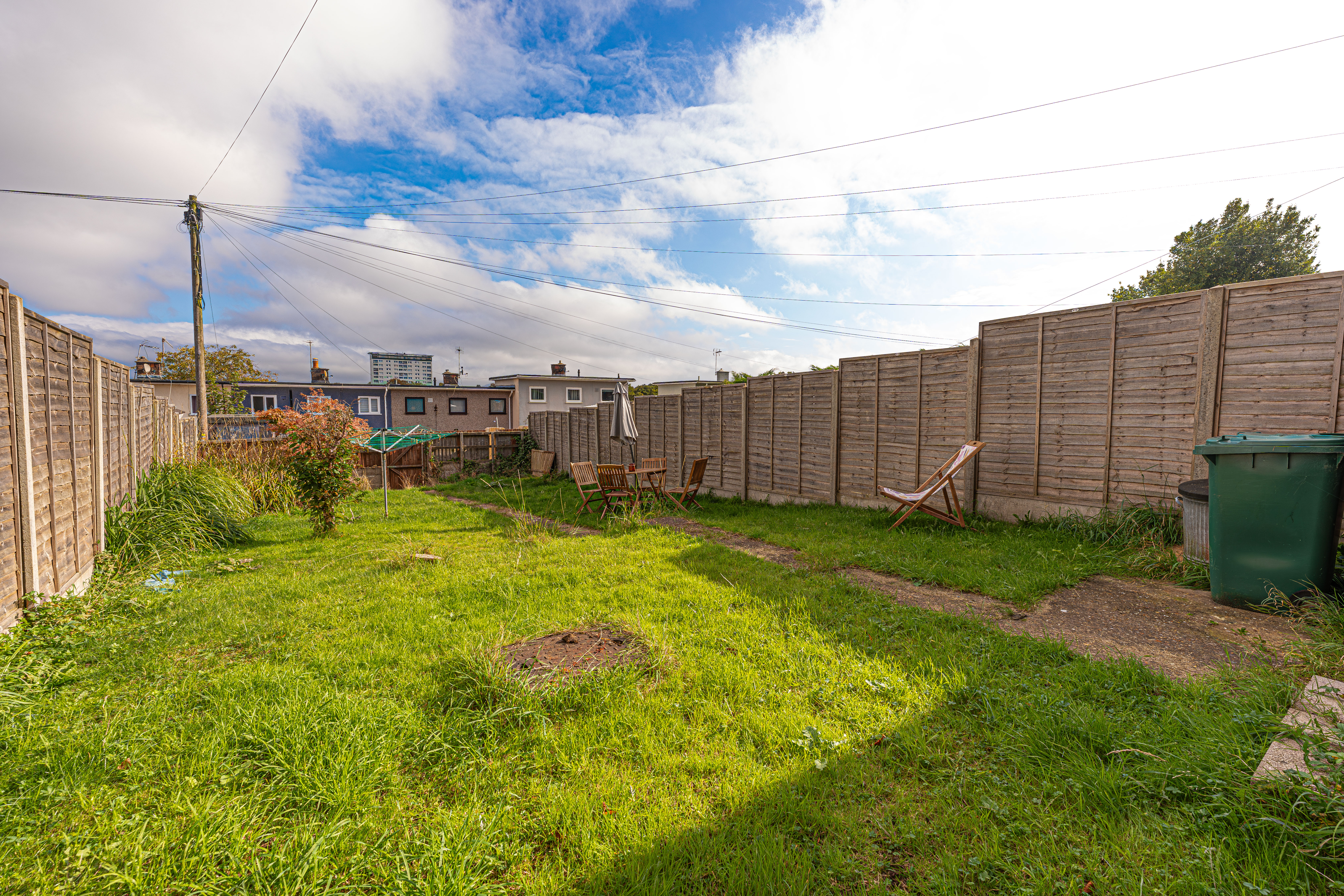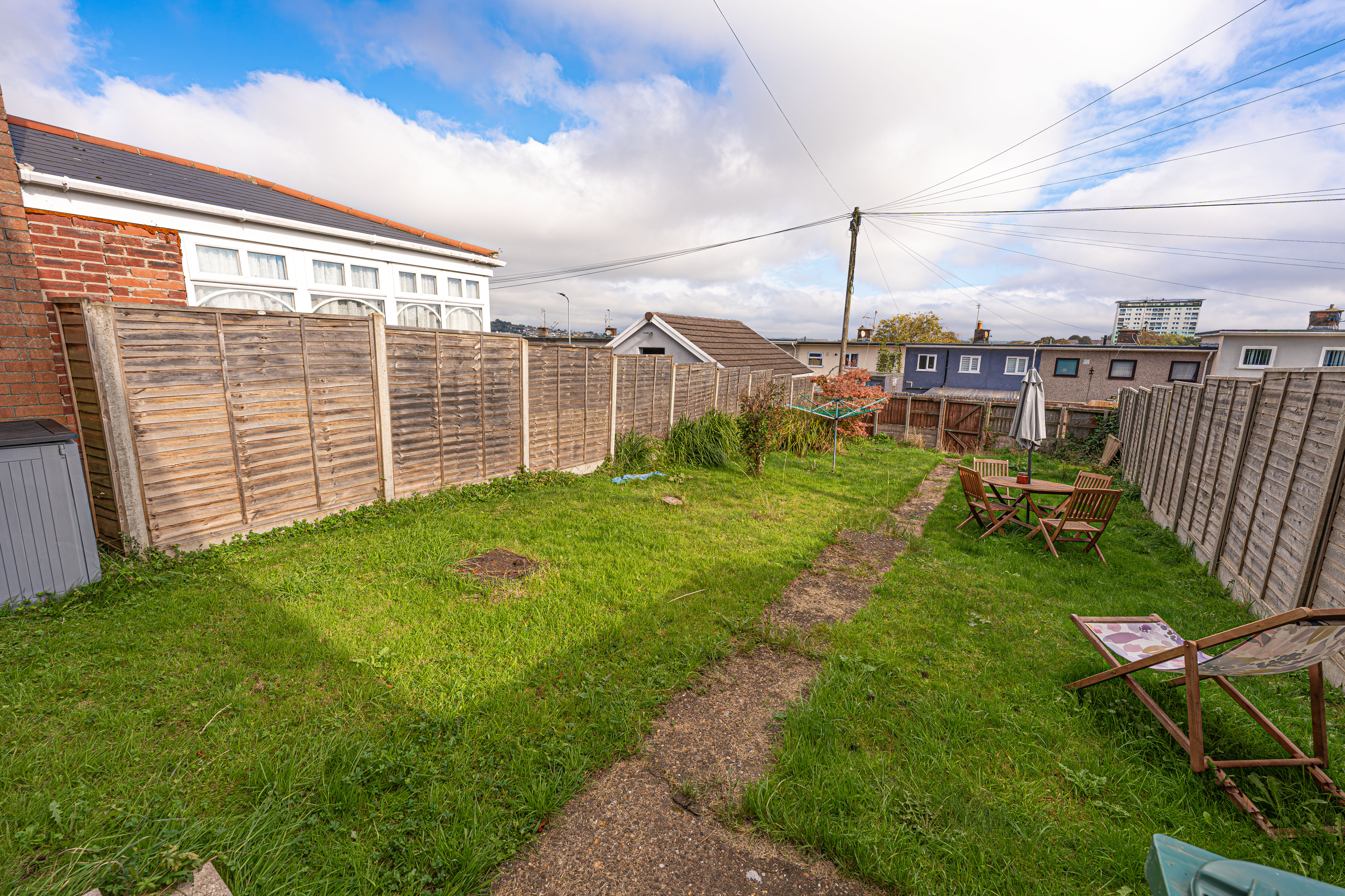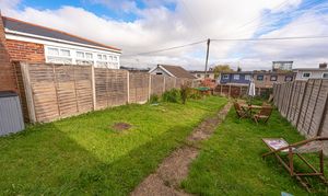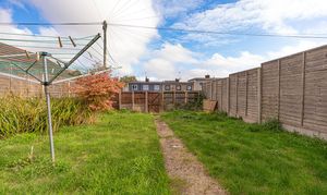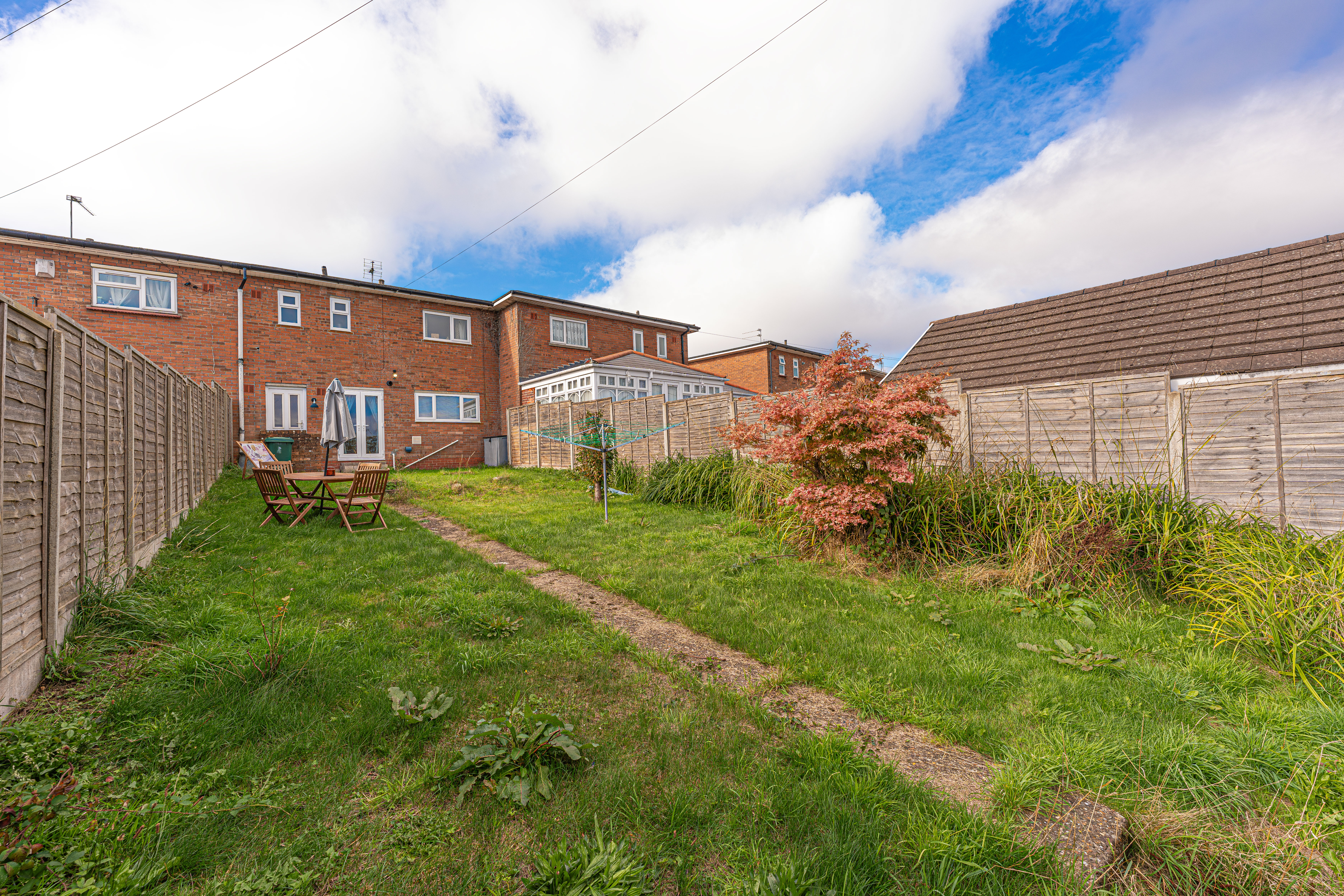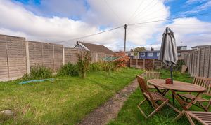 Stepping outside we arrive at the sizeable rear garden, which features a paved pathway dividing an impressive grass lawn that stretches away from the house, offering an abundance of outdoor space for relaxing and entertaining guests, as well as being perfect for children and pets to play in.