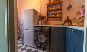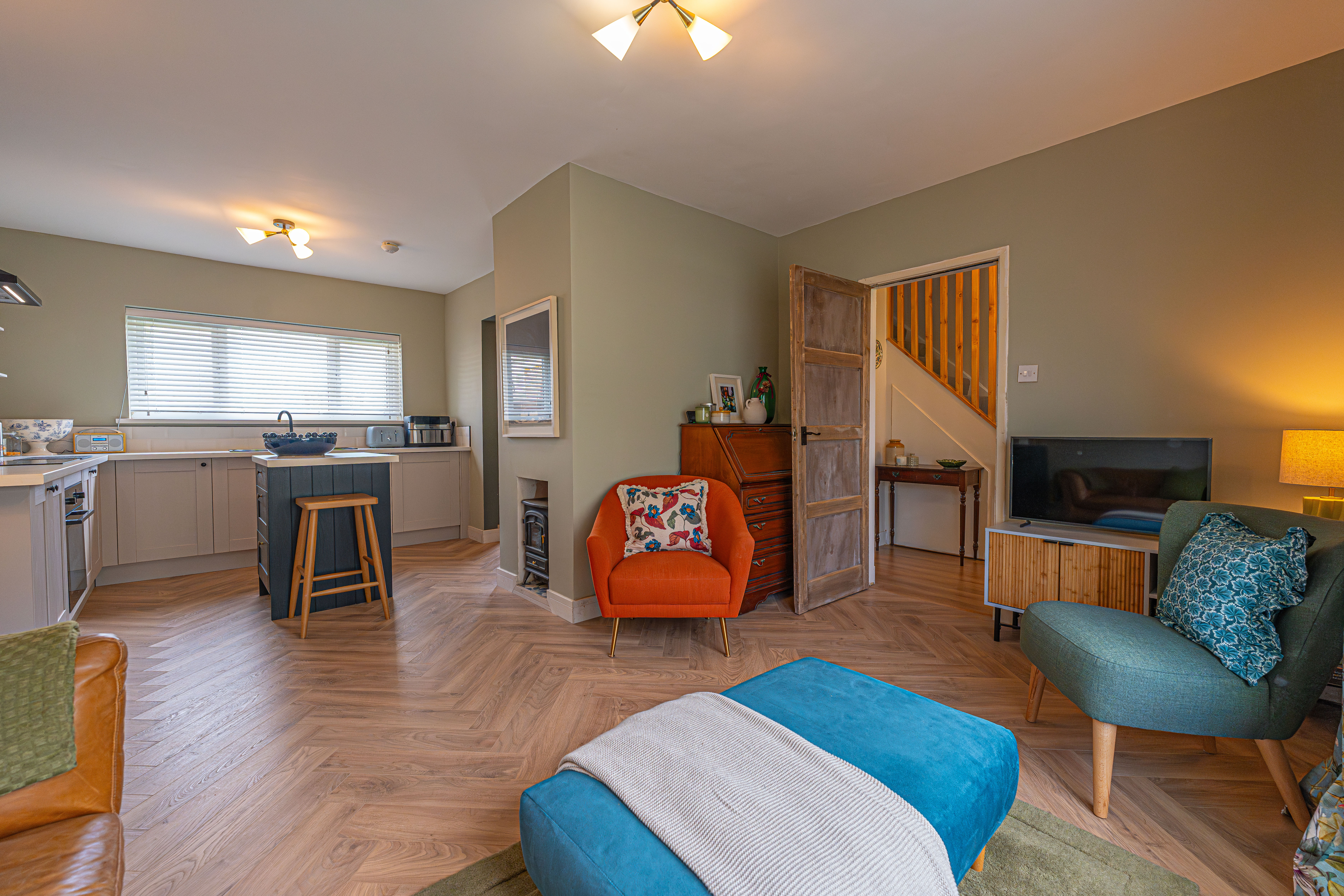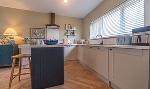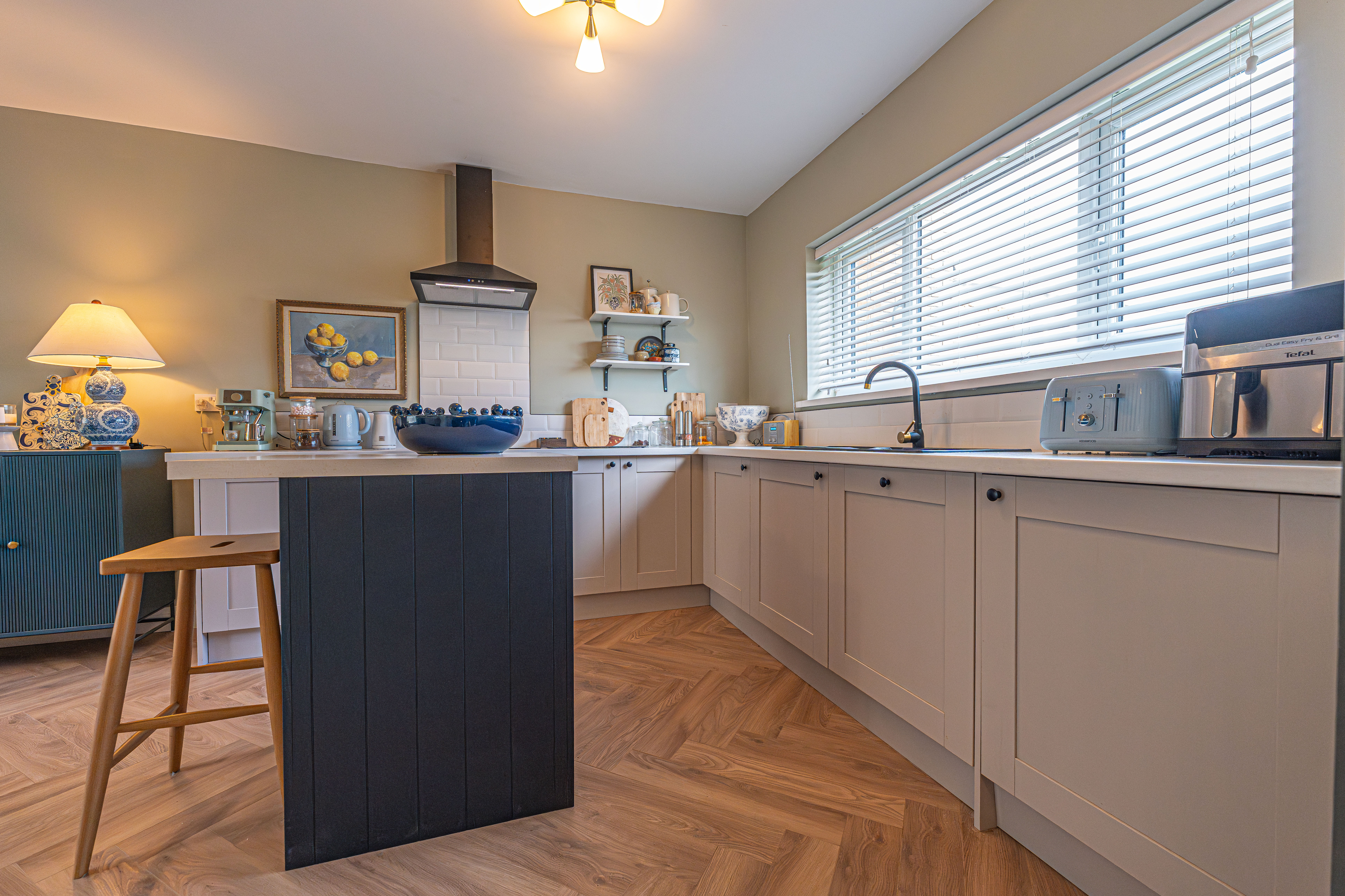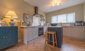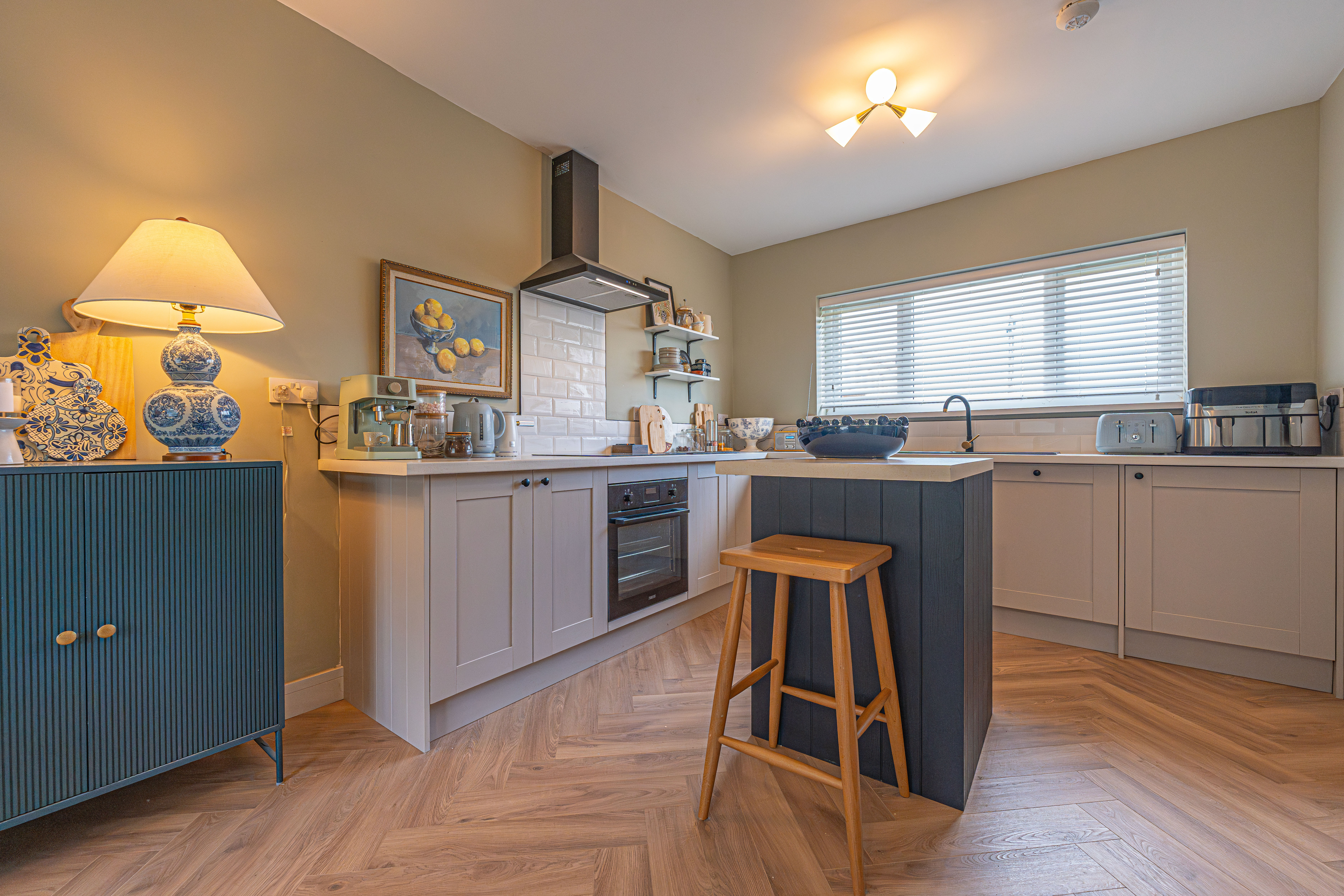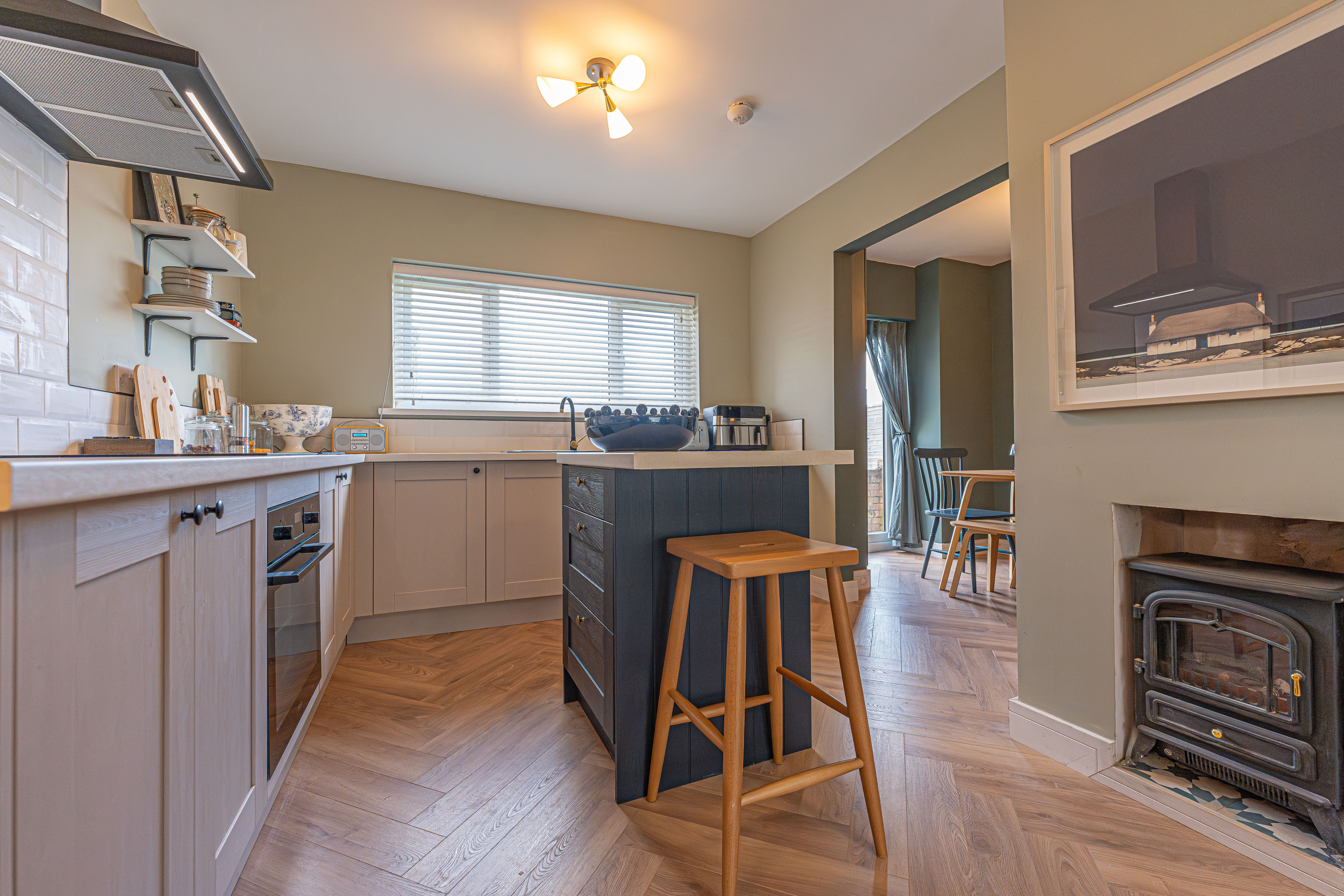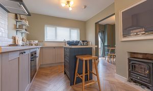 We enter this beautifully presented home to the front of property, where we are welcomed into the hallway. There is herringbone flooring throughout much of the ground floor, which includes the living room, kitchen and dining room, with all three rooms flooded by natural light and joined by a fluid open plan design. The lounge is ideal for relaxing and entertaining guests and offers a charming electric fireplace, while the neighbouring kitchen offers various storage options through the wall units and kitchen island, as well as several appliances integrated into the worktop. The dining room features French doors that open out to the garden, as well as access into a helpful utility room for extra storage and household management.