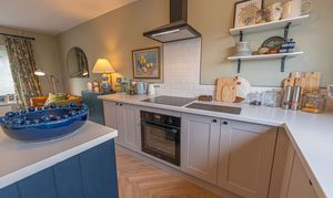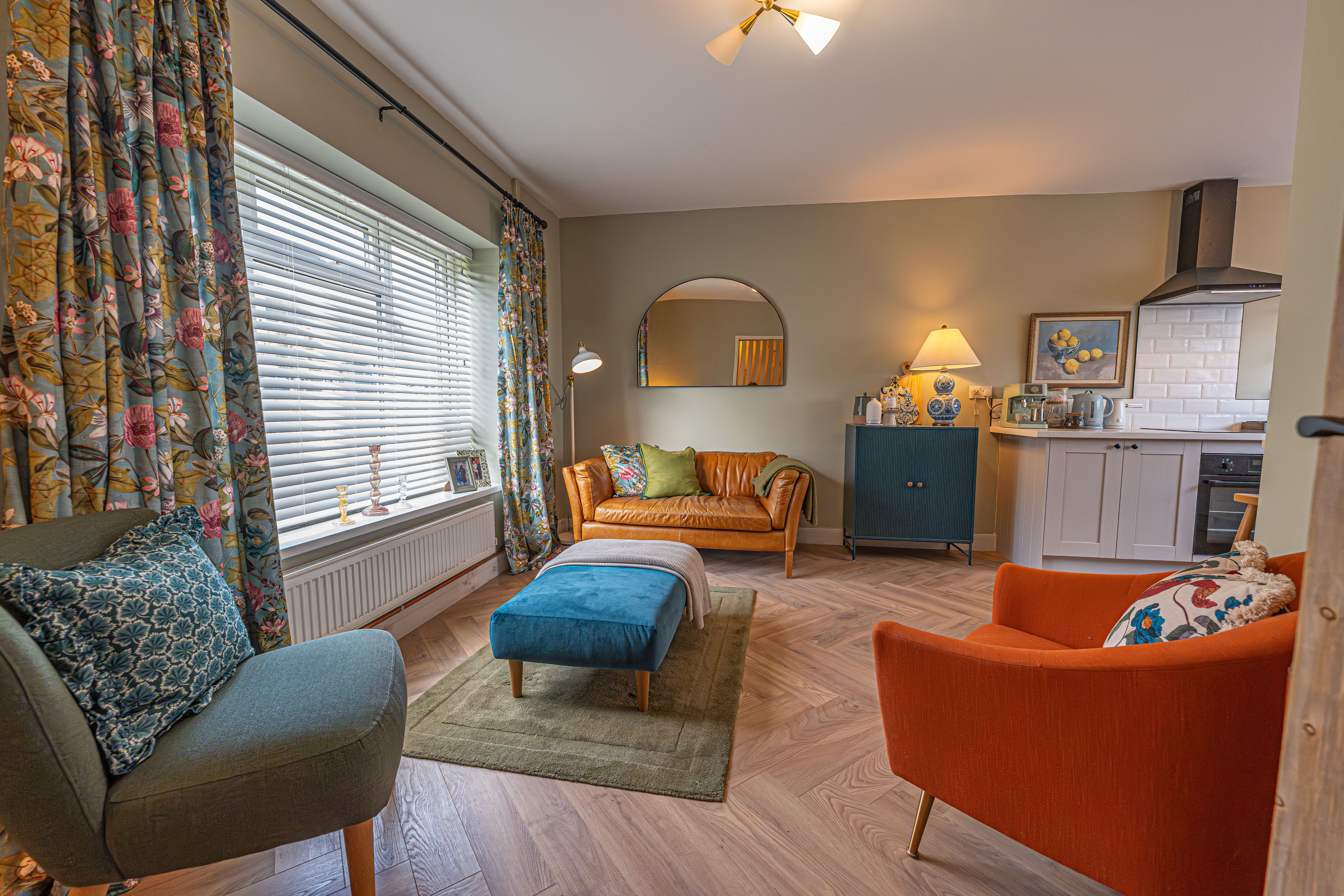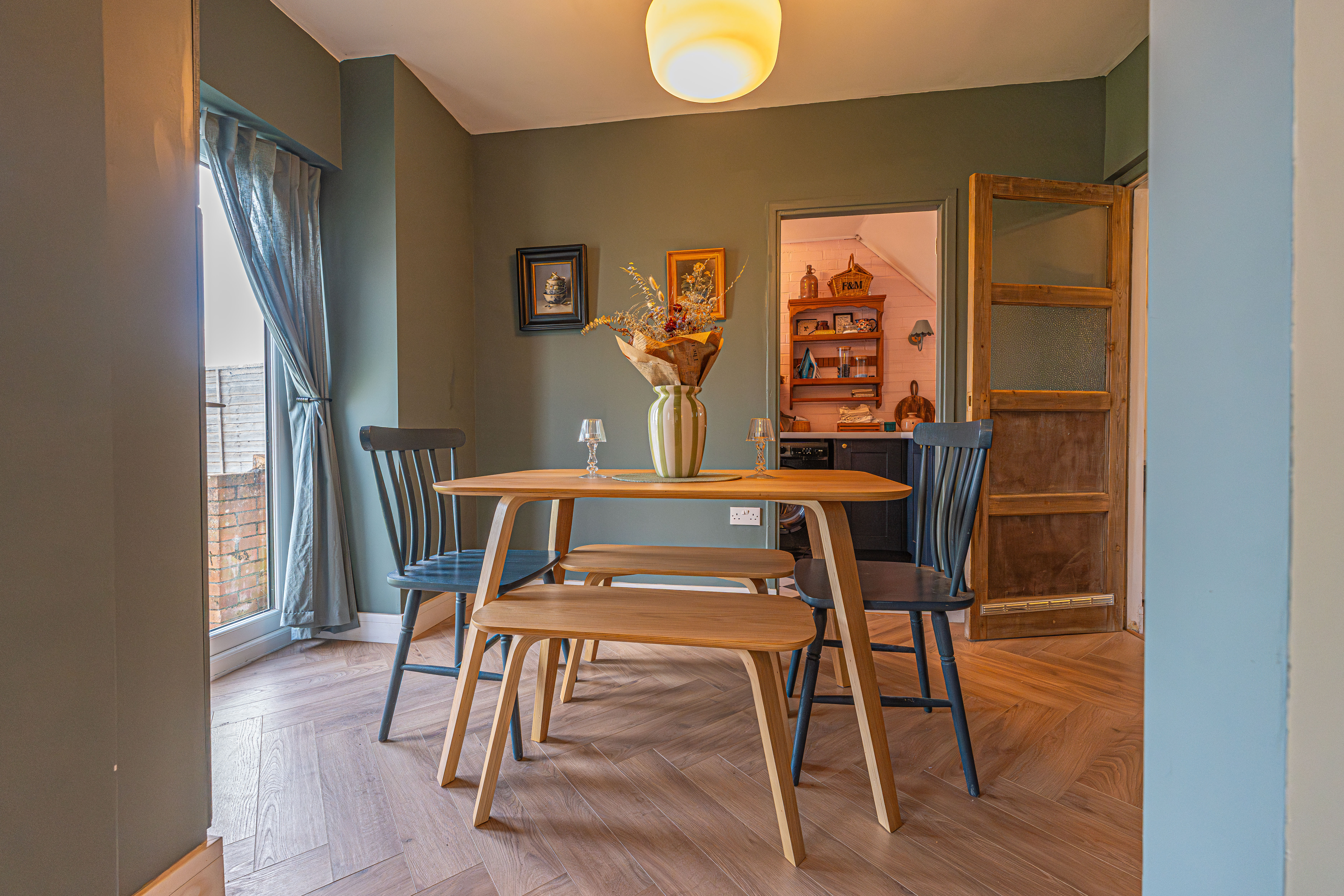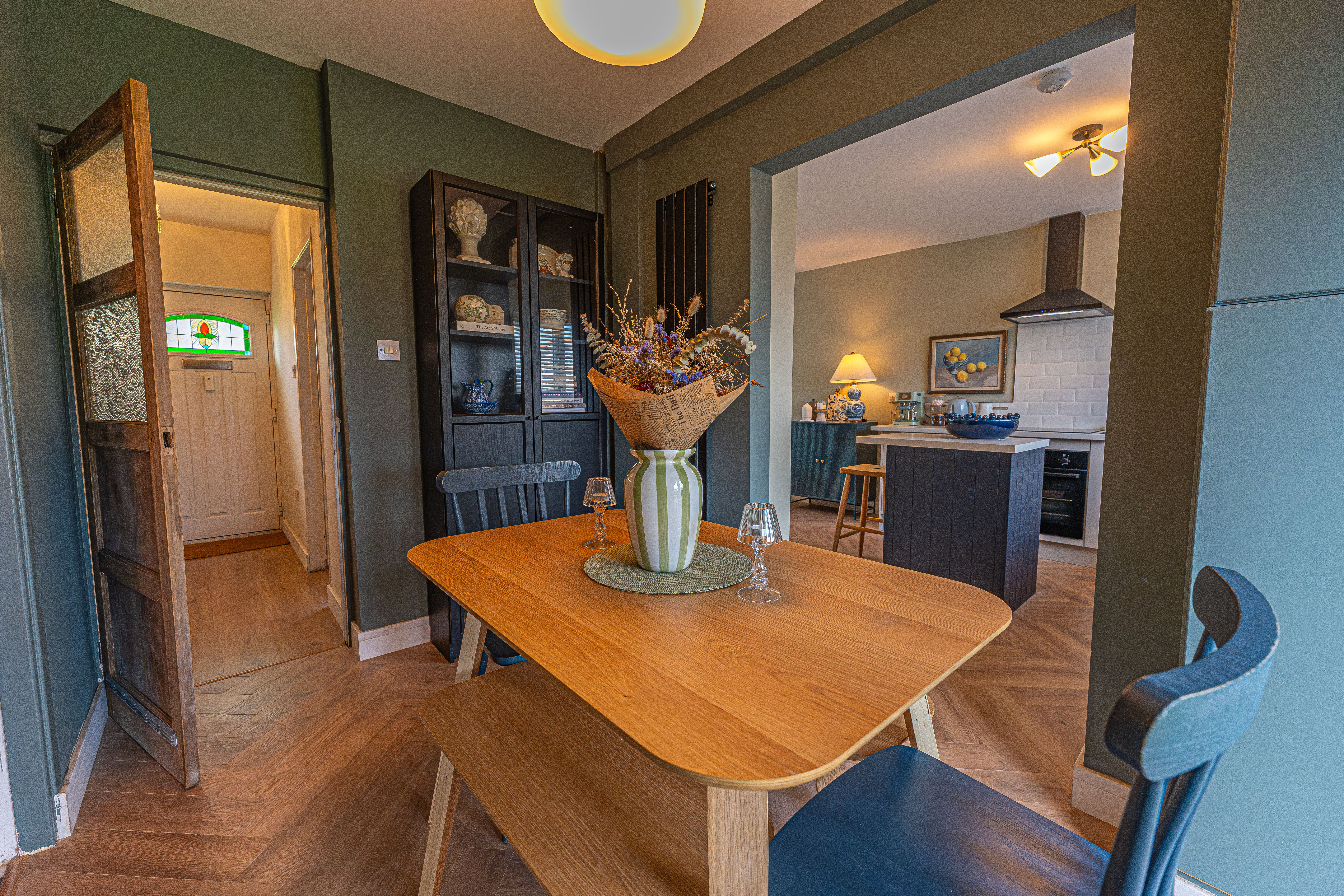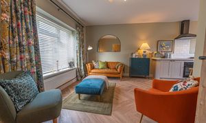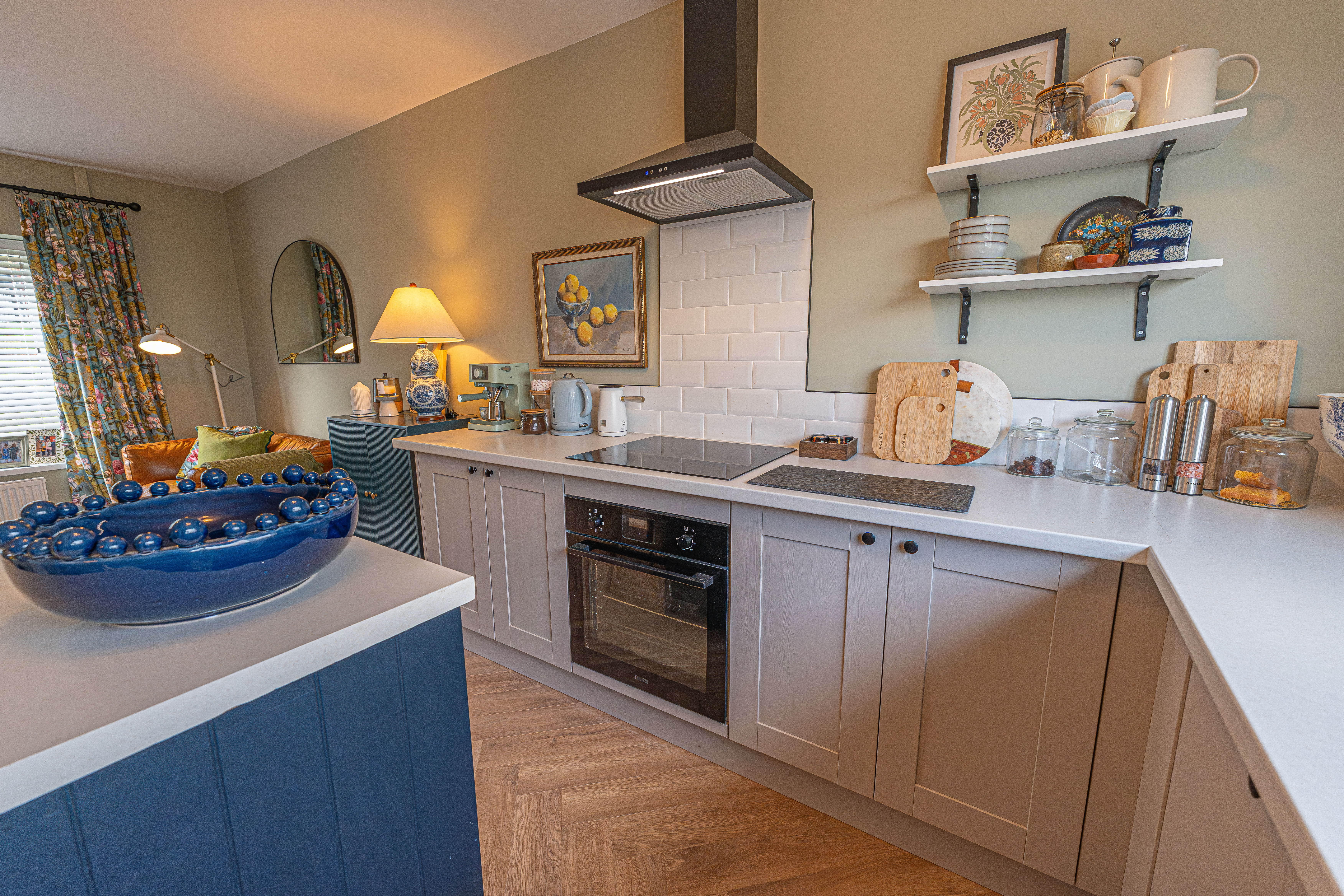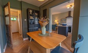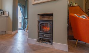 We enter this beautifully presented home to the front of property, where we are welcomed into the hallway. There is herringbone flooring throughout much of the ground floor, which includes the living room, kitchen and dining room, with all three rooms flooded by natural light and joined by a fluid open plan design. The lounge is ideal for relaxing and entertaining guests and offers a charming electric fireplace, while the neighbouring kitchen offers various storage options through the wall units and kitchen island, as well as several appliances integrated into the worktop. The dining room features French doors that open out to the garden, as well as access into a helpful utility room for extra storage and household management.