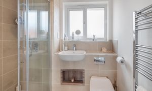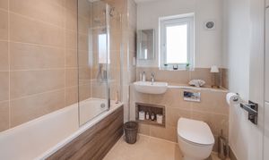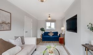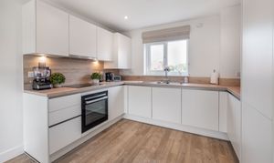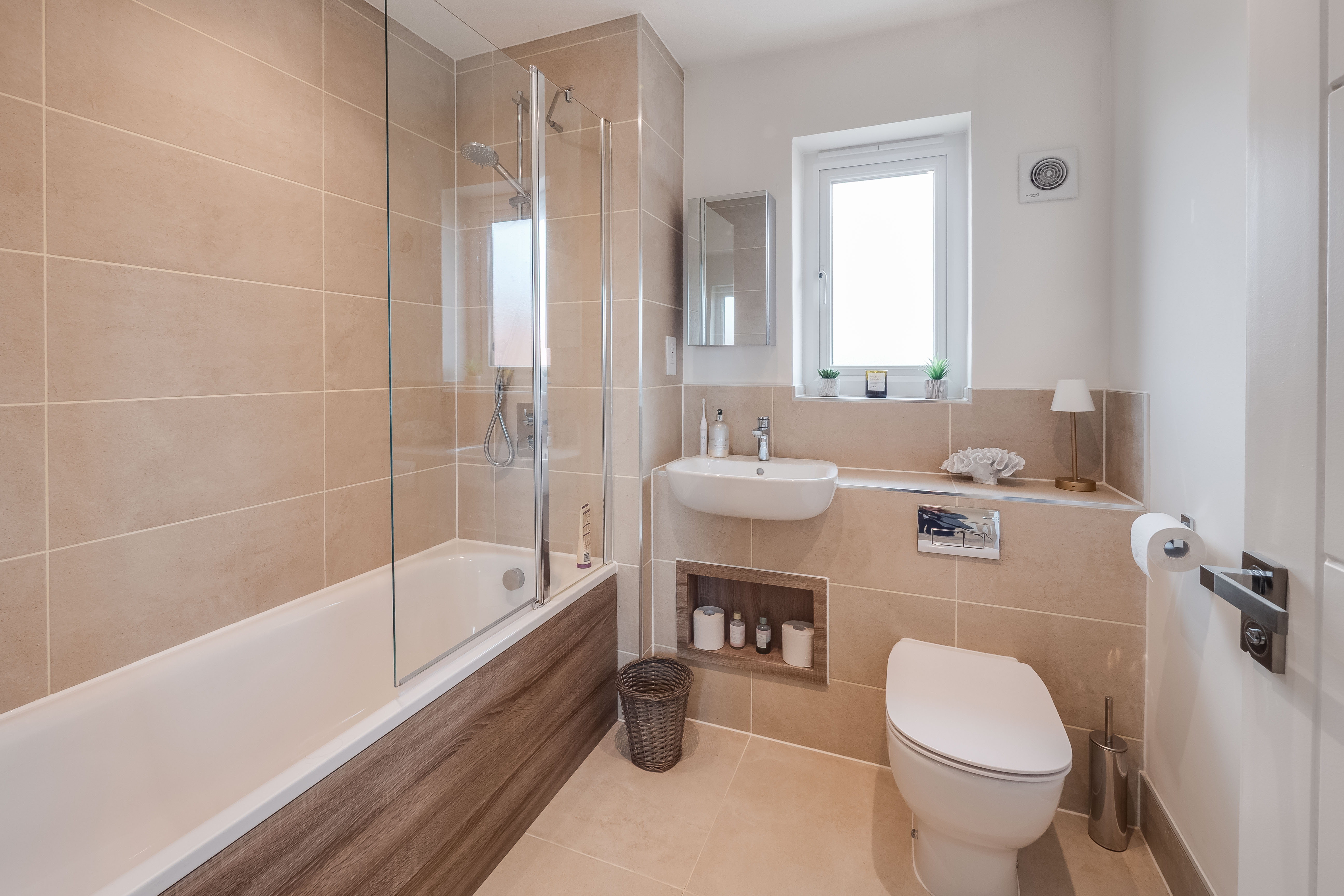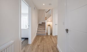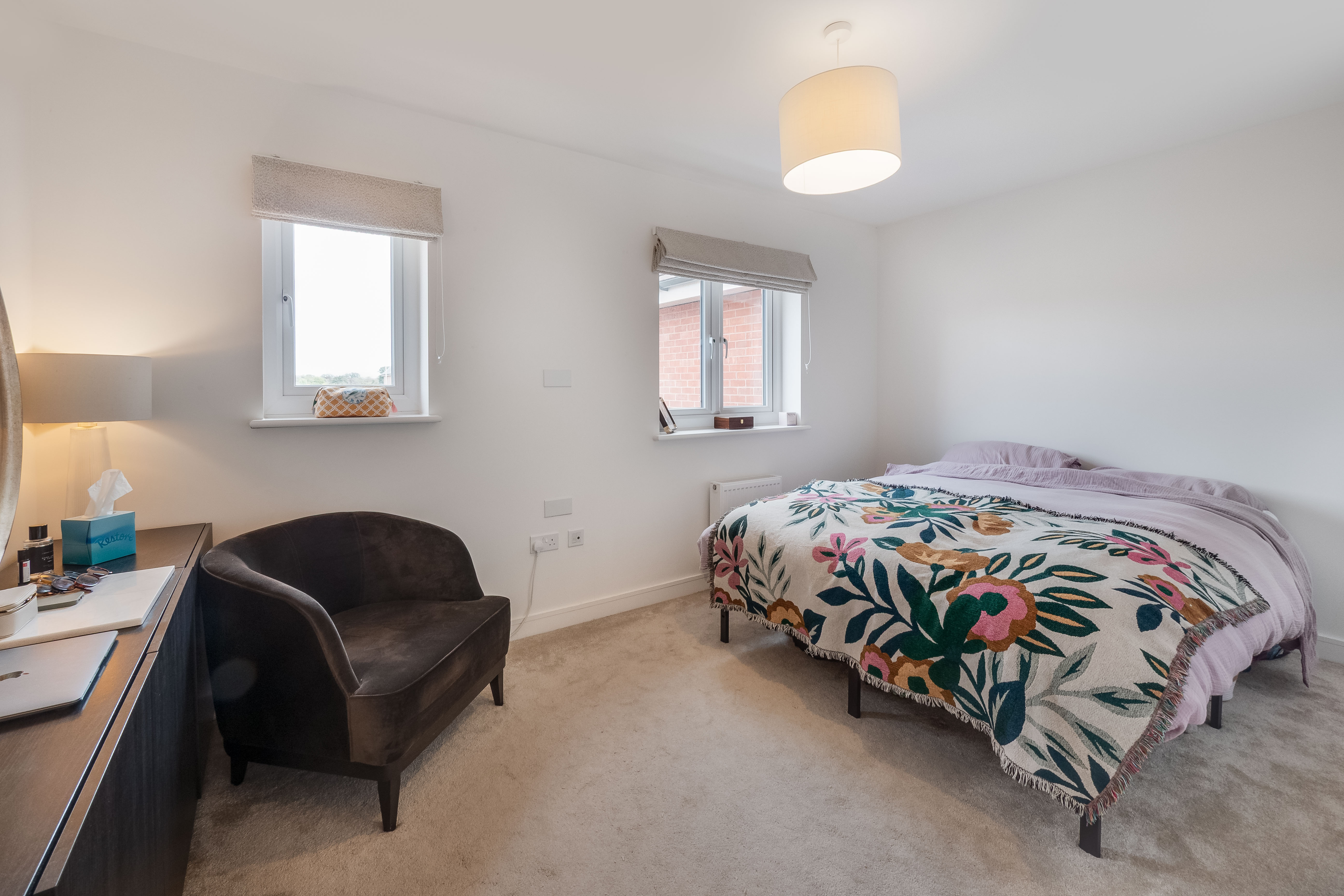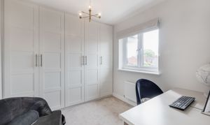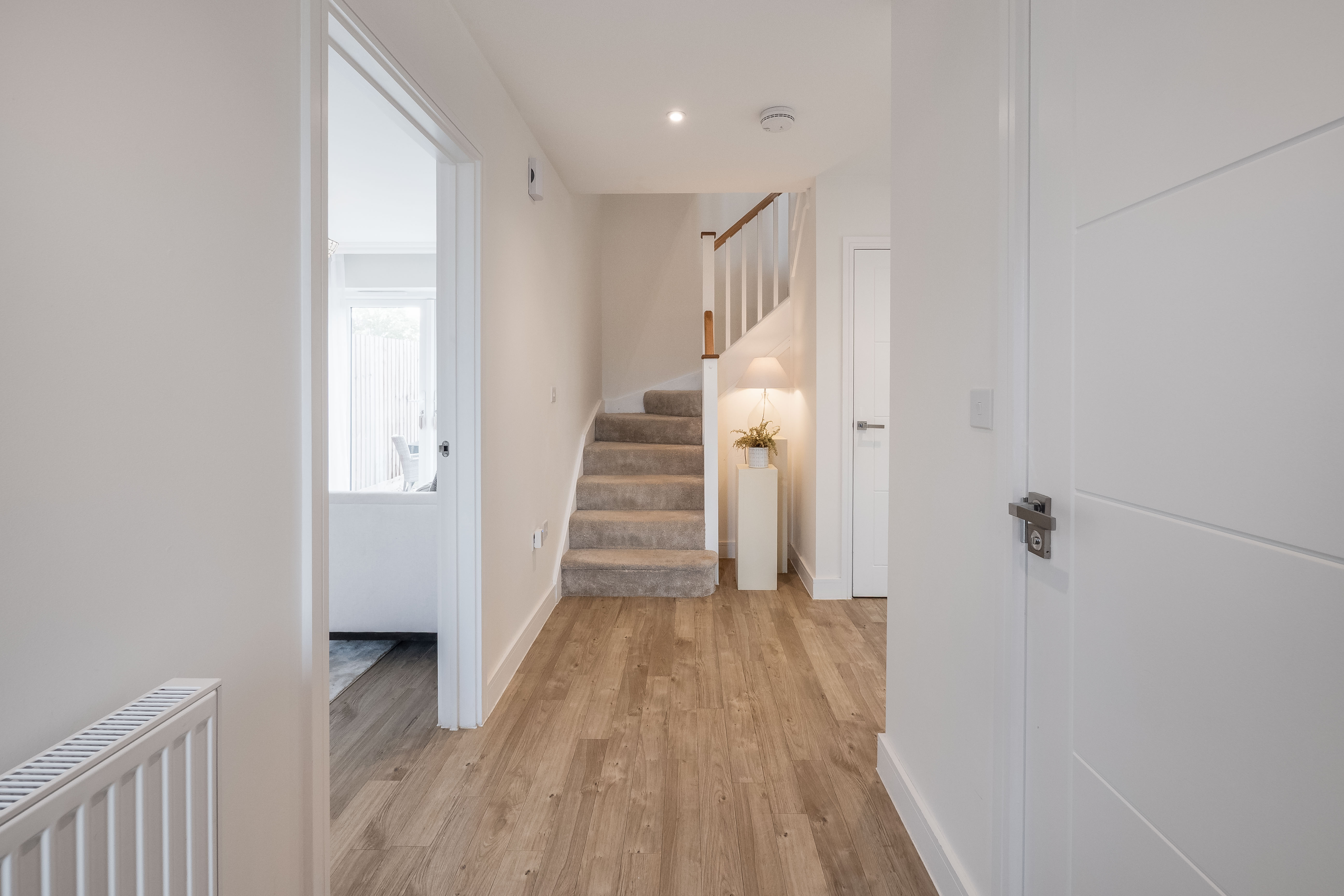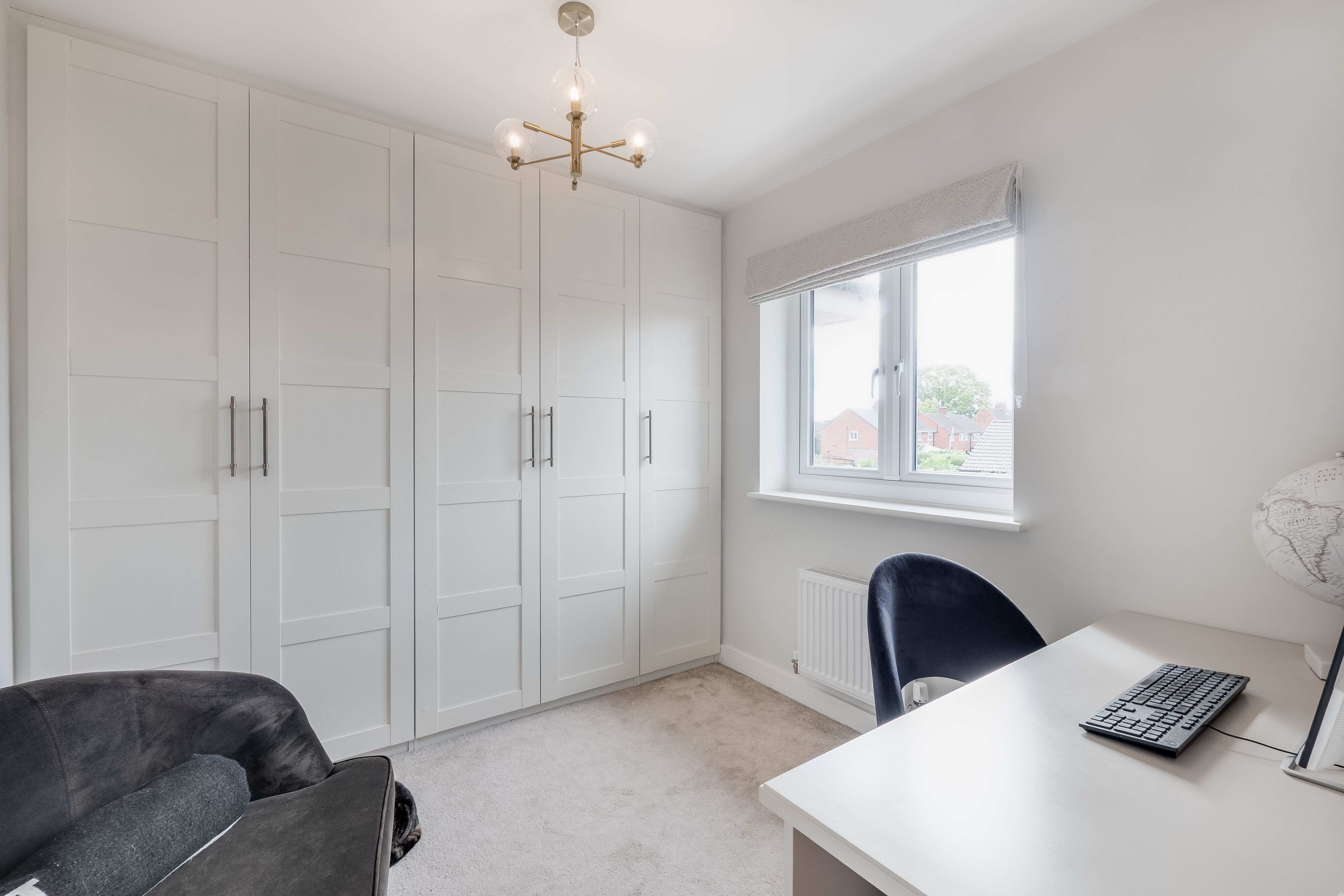 Upstairs, the principal bedroom boasts fitted wardrobes and a sleek ensuite shower room – a private haven at day’s end. The second bedroom is a generous double, and the third, also with fitted wardrobes, works well as a nursery, guest room, or home office. An over stairs cupboard adds extra storage, and a contemporary family bathroom completes the first floor.