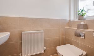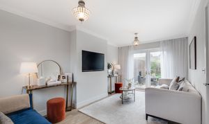 Inside, a spacious entrance hallway leads to a convenient cloakroom and practical understairs storage. To the left, a light filled lounge features French doors opening onto the rear garden, while to the right, the stylish kitchen/diner includes integrated appliances and ample space for dining or entertaining. With its own set of French doors to the garden, it’s perfect for everything from relaxed breakfasts to lively evening gatherings.