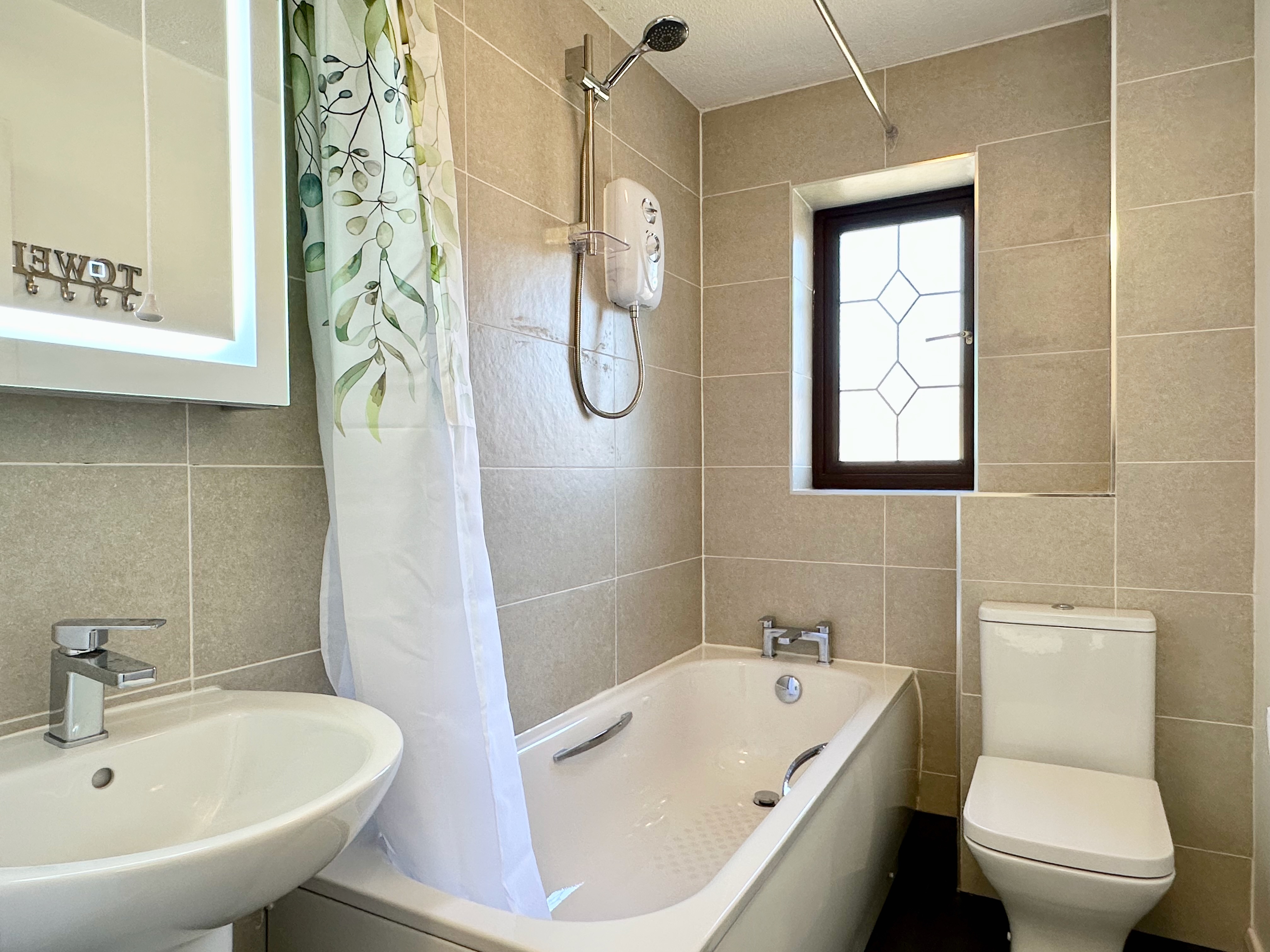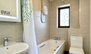 On the first floor, there are 2 bedrooms, the main with fitted wardrobe, and a newly fitted family bathroom with shower over bath.