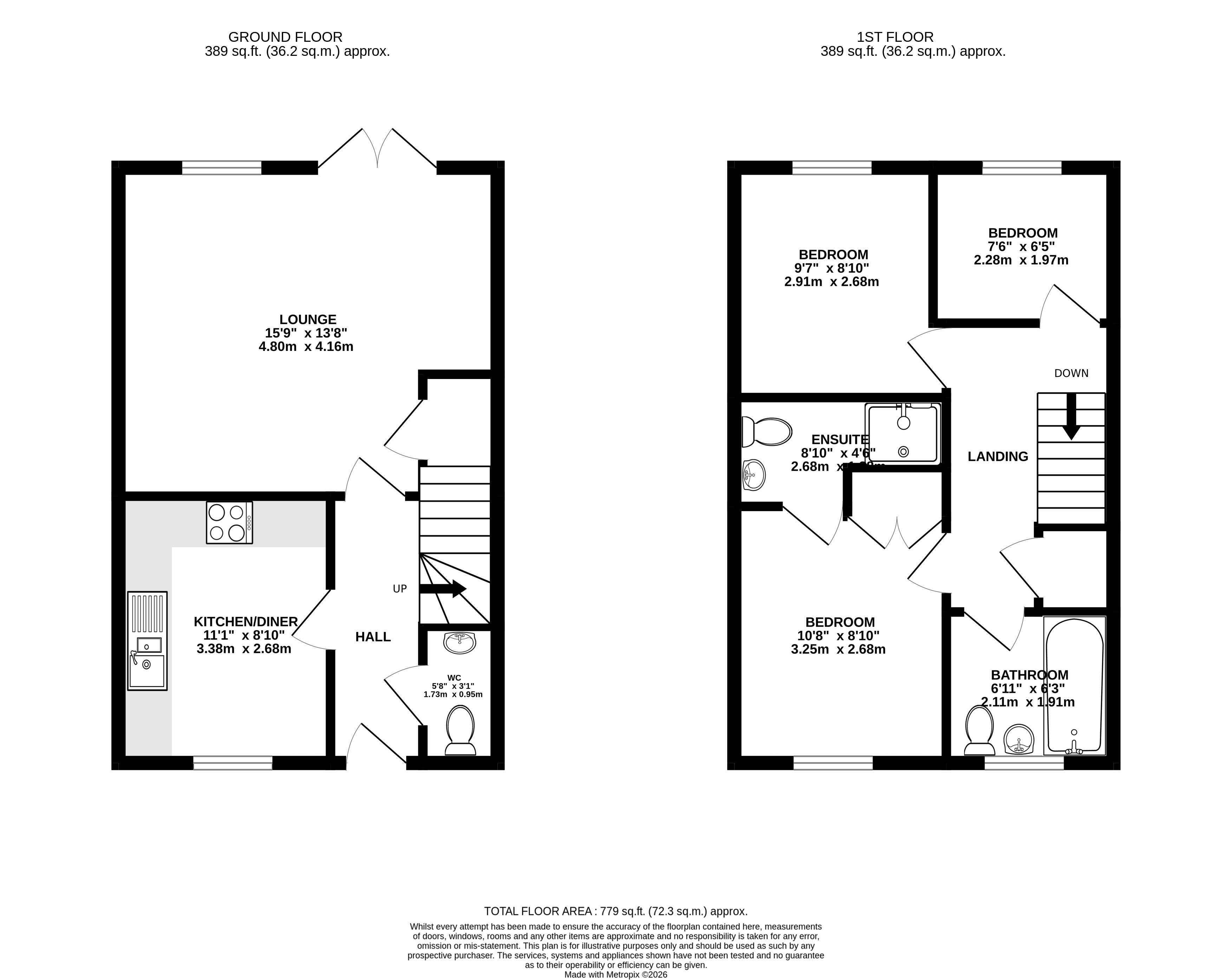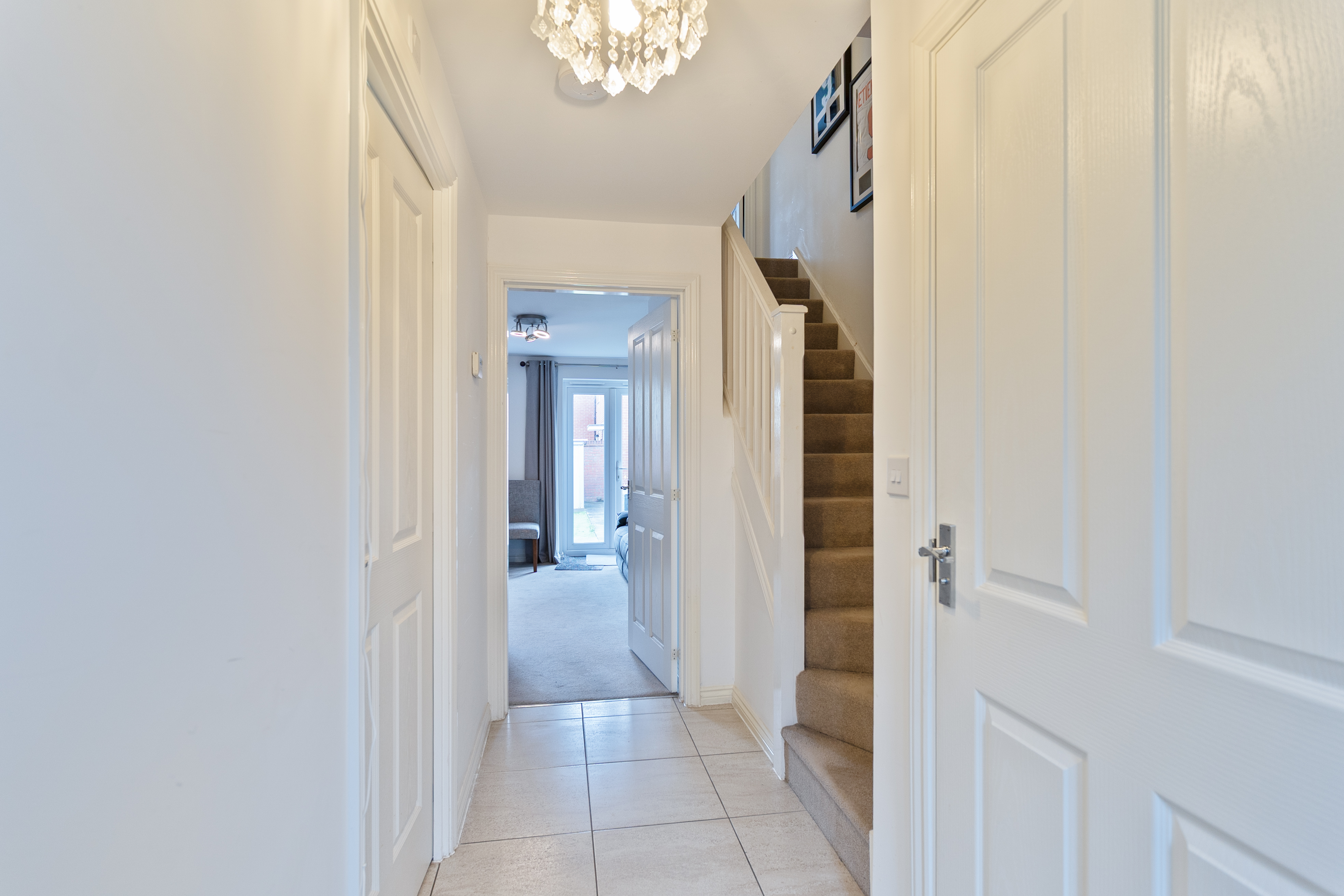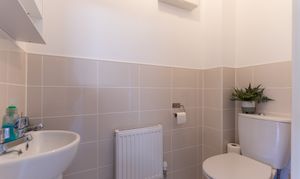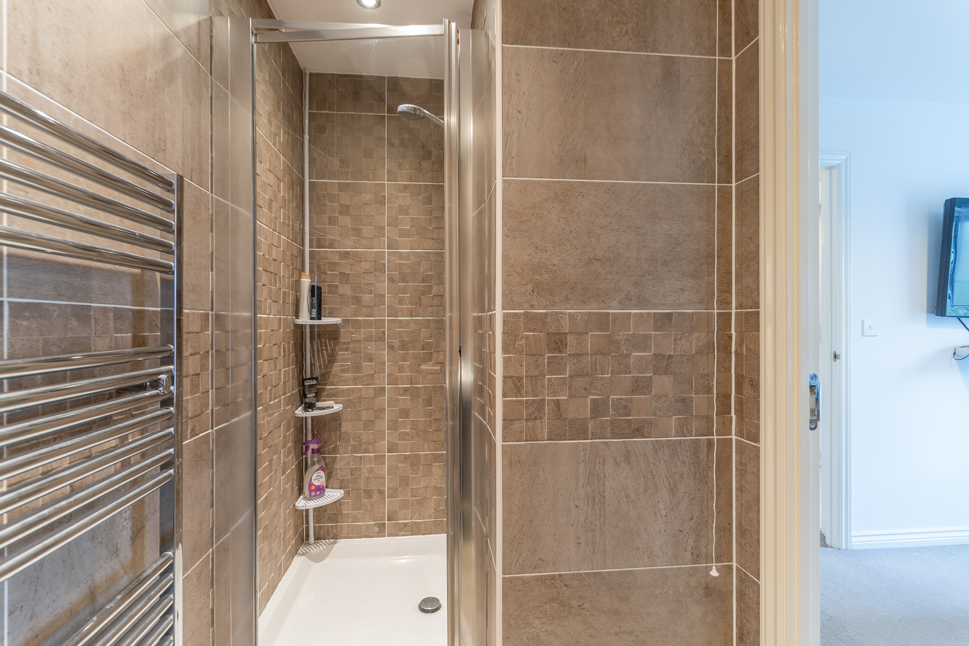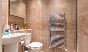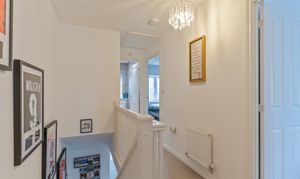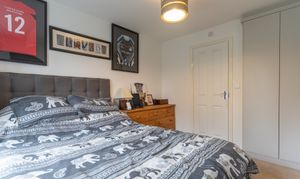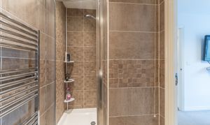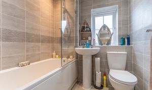 On the first floor are three bedrooms and the family bathroom. There are two well-sized double bedrooms and a comfortable single bedroom. The primary bedroom, located at the front of the property, benefits from fitted storage and a private en-suite shower room. The family bathroom is fitted with a bath and overhead shower. The landing also provides access to a useful storage cupboard and a newly boarded loft with lighting and electricity, offering excellent additional storage space.