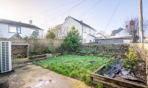 Outside, the garden is fully enclosed with a mix of lawn and seating areas. There are also raised beds for flowers and growing vegetables. It’s a manageable space with room for outdoor dining and a small shed if required.