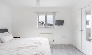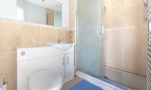 On the first floor, the landing includes a cupboard housing the pressurised hot water system, with stairs rising to the second floor. The master bedroom features a built-in double wardrobe. The fitted en-suite shower room comprises a low-level WC, vanity wash hand basin with storage below, a fully tiled double-sized shower enclosure, a heated towel rail and an extractor fan. Bedroom two benefits from a shelved recess, bespoke fitted shelving and Amtico flooring. The family bathroom is fitted with a white suite including a low level WC, wash hand basin, panelled bath with shower attachment, towel rail and extractor fan.