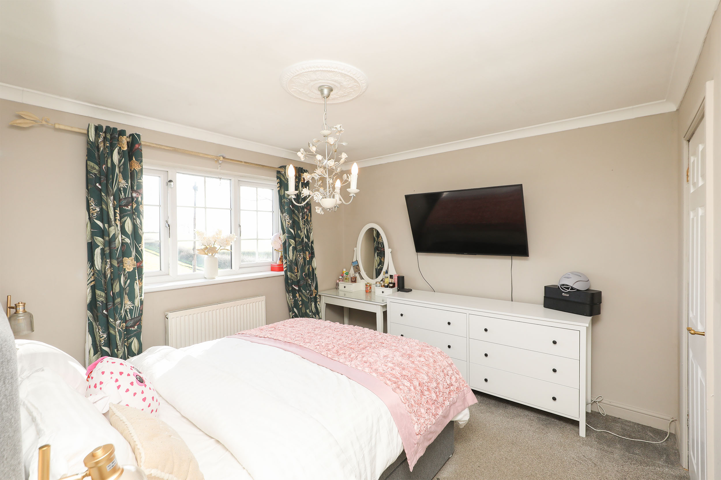Upstairs, the property offers four well-proportioned bedrooms, with the front-facing rooms enjoying fabulous views across open fields. A fifth bedroom is accessed via bedroom four, providing a flexible space that could be utilised as a dressing room, nursery or home office depending on individual needs. The accommodation is completed by a family bathroom.