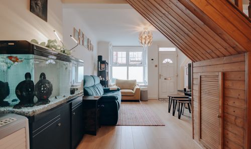 Step through the porch, perfect for coats, bags and boots, and you'll find an unexpectedly thoughtful layout. Uniquely, a second door offers direct, internal access to the garden from the entry hall, ideal for muddy shoes, dogs, or bikes. The central hallway acts like a T-junction, drawing you into the home’s core spaces. To the right, a 21’3” x 9’9” open-plan living room basks in natural light, thanks to the oversized bay window dressed in crisp white shutters. Underfoot, soft neutral carpet adds warmth, while the scale of the room gives flexibility to zone seating and dining as needed. Adjacent, the kitchen is modern, clean-lined, and functional, with integrated appliances tucked neatly into bespoke cabinetry that wraps the wall. The natural light here is exceptional - spotlights are barely needed during the day - and a soft, pared-back palette keeps things calm and stylish. Just beyond, a utility area and off the hallway, a well-appointed downstairs bathroom brings real-life functionality into play, ideal for families or guests.